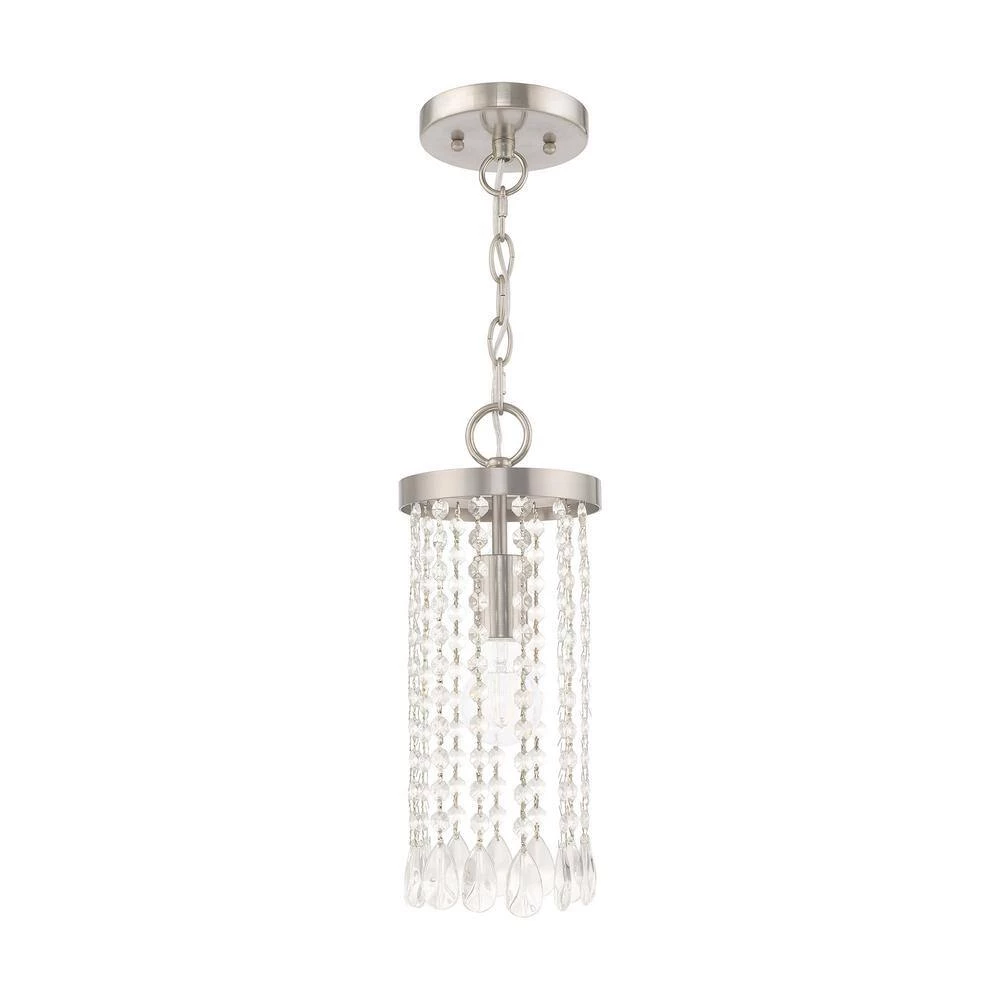 Livex Lighting is well known for quality, style and value. The brushed nickel finish decorates the beautiful design of the Elizabeth one light mini pendant with a refined quality. Clear crystal frills offer detailed elegance to the design of this mini pendant. Attract attention with the bold personality provided by this lovely fixture. This well-rounded fixture is sure to satisfy your lighting needs.