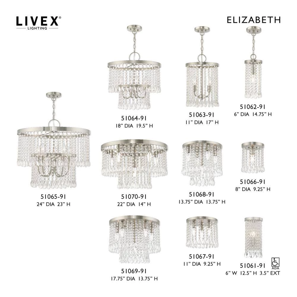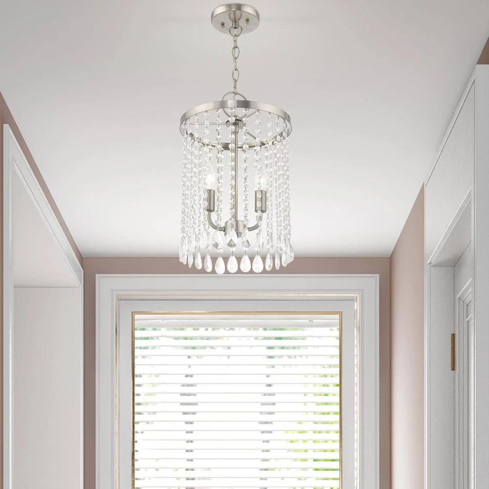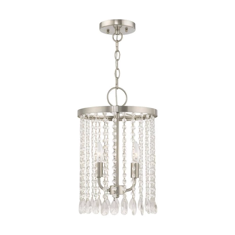 Livex Lighting is well known for quality, style and value. The brushed nickel finish decorates the beautiful design of the Elizabeth 2 light mini pendant chandelier with a refined quality. Clear crystal frills offer detailed elegance to the design of this mini pendant. Attract attention with the bold personality provided by this lovely fixture. This well-rounded fixture is sure to satisfy your lighting needs.