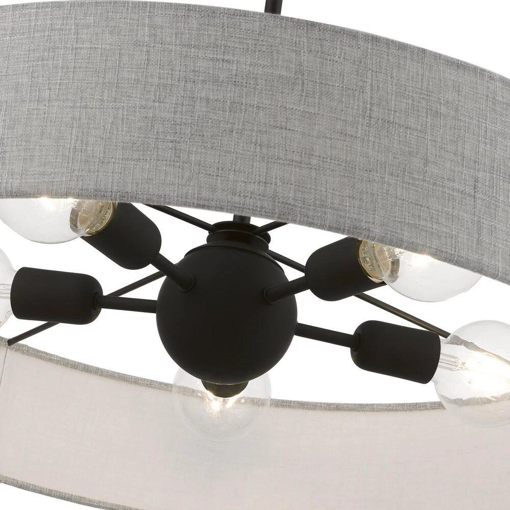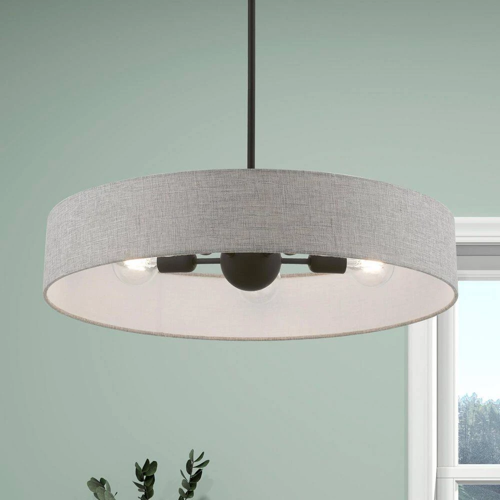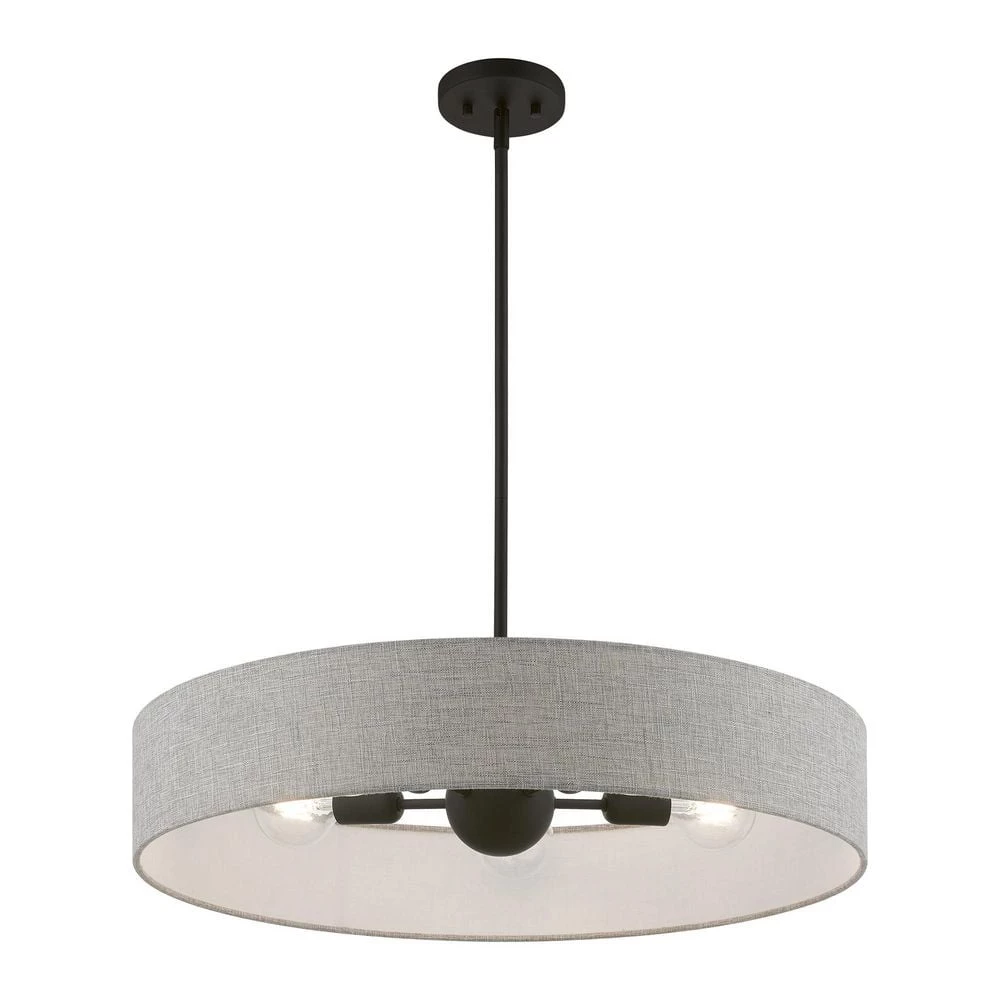 The Elmhurst collection is both modern and versatile. The black finish and hand-crafted urban gray color fabric hardback shade with white color fabric on the inside sets a pleasant mood. This sleek medium 5-light drum pendant is a perfect fit for the living room, dining room, kitchen and bedroom.