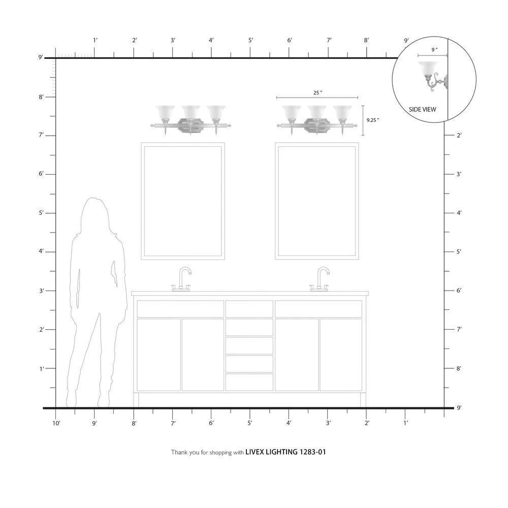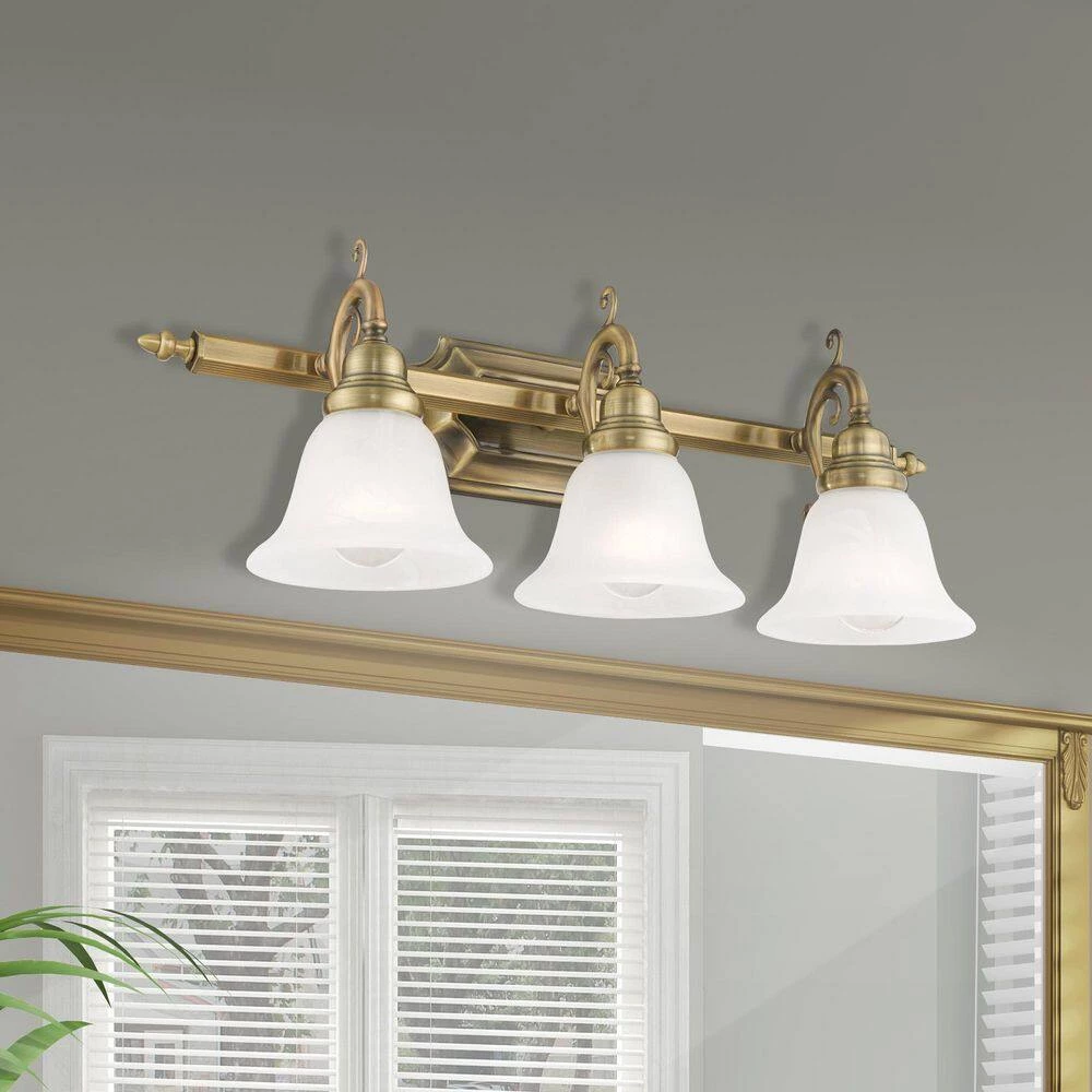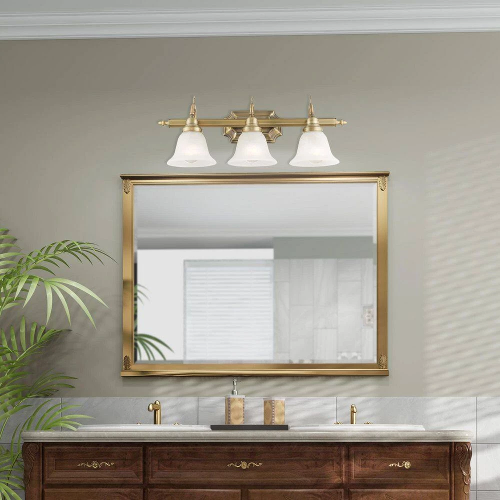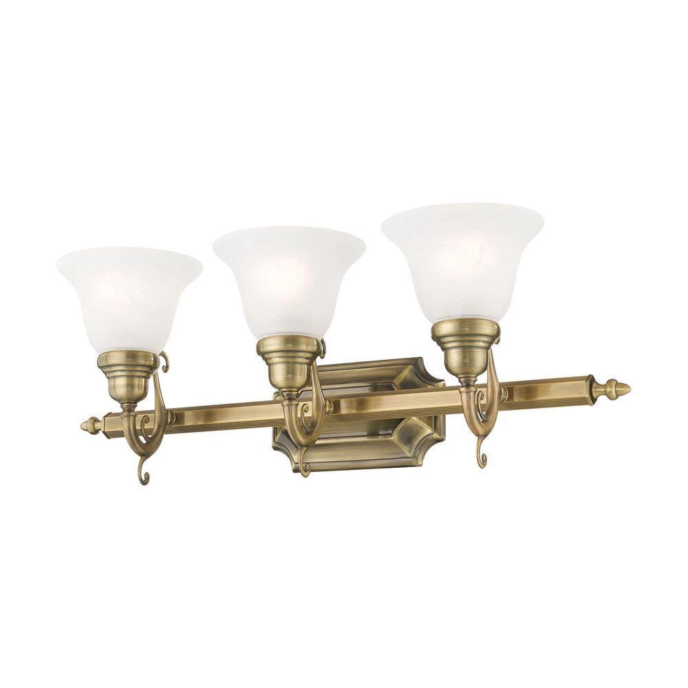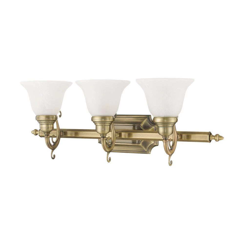 Livex Lighting is well known for quality, style and value. The French Regency collection is an artistic blend of traditional styling and beautiful materials. The glass shades are a white alabaster, and the backplate incorporates multiple bevels. This bathroom wall light features a magnificent antique brass finish. This fixture may be installed facing up or down. This well-rounded fixture is sure to satisfy your lighting needs.