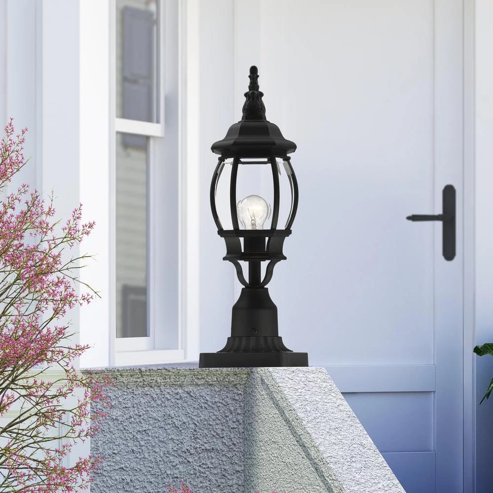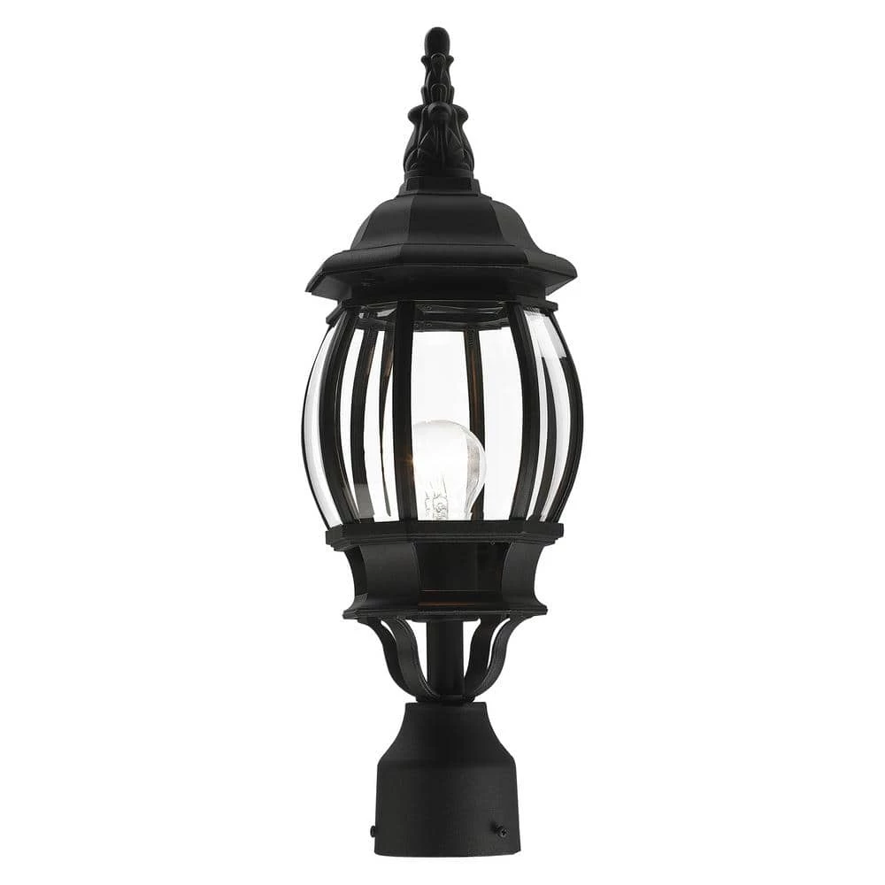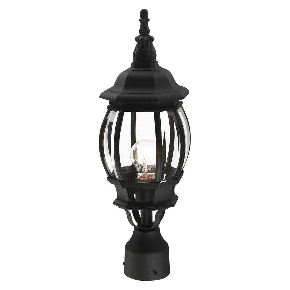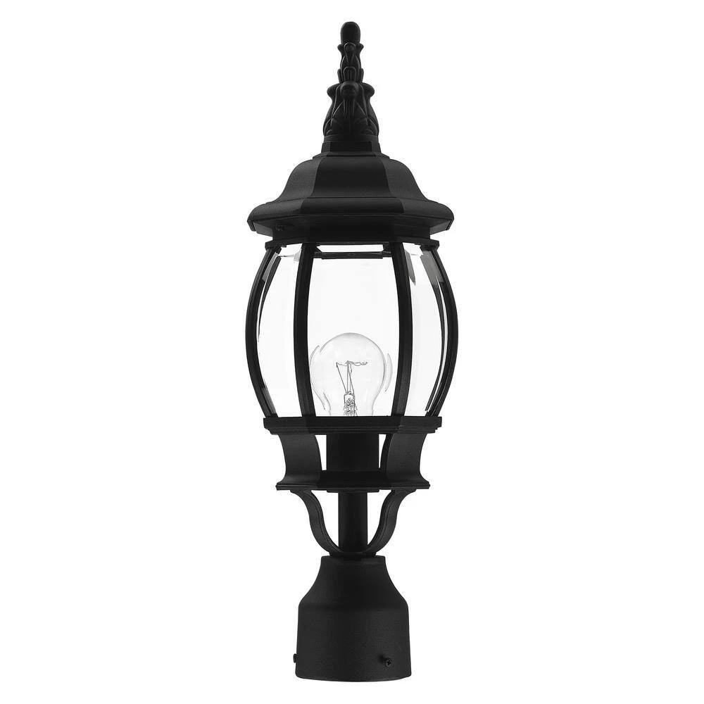 Livex Lighting is well known for quality, style and value. The classically transitional outdoor Frontenac collection boasts a cast aluminum structure with dazzling ornamental design. The single-light small six-sided post top lantern comes in a textured black finish with clear beveled glass and extravagantly decorative details. The ornate quality of this light will add radiance to your house exterior day or night. This well-rounded fixture is sure to satisfy your lighting needs.