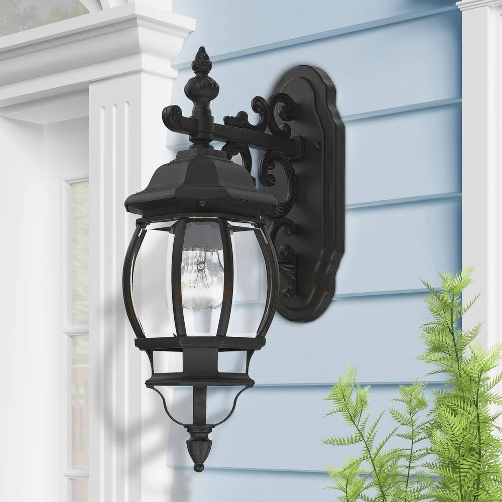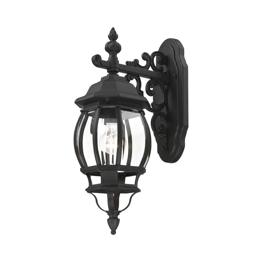 Livex Lighting is well known for quality, style and value. The classically transitional outdoor Frontenac collection boasts a cast aluminum structure with dazzling ornamental design. The downward hanging single-light small six-sided wall lantern comes in a textured black finish with clear beveled glass and extravagantly decorative scrolls. The ornate quality of this light will add radiance to your house exterior day or night. This well-rounded fixture is sure to satisfy your lighting needs.