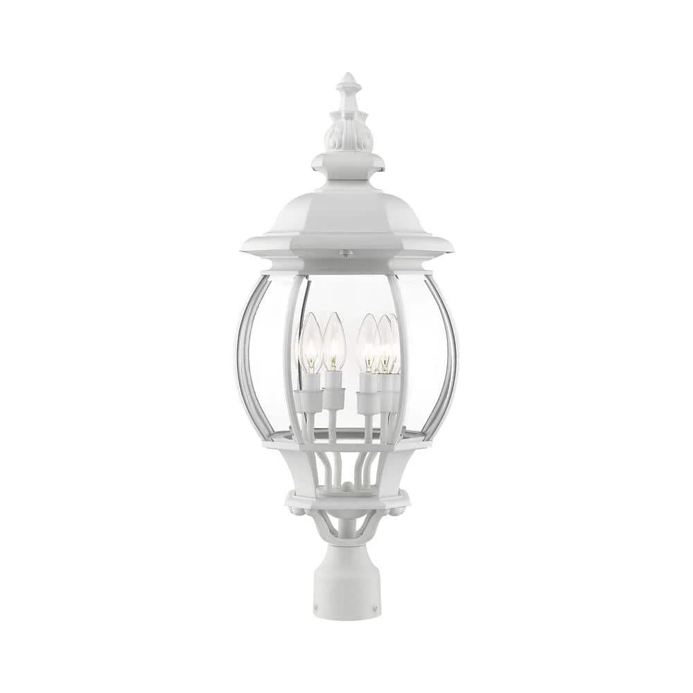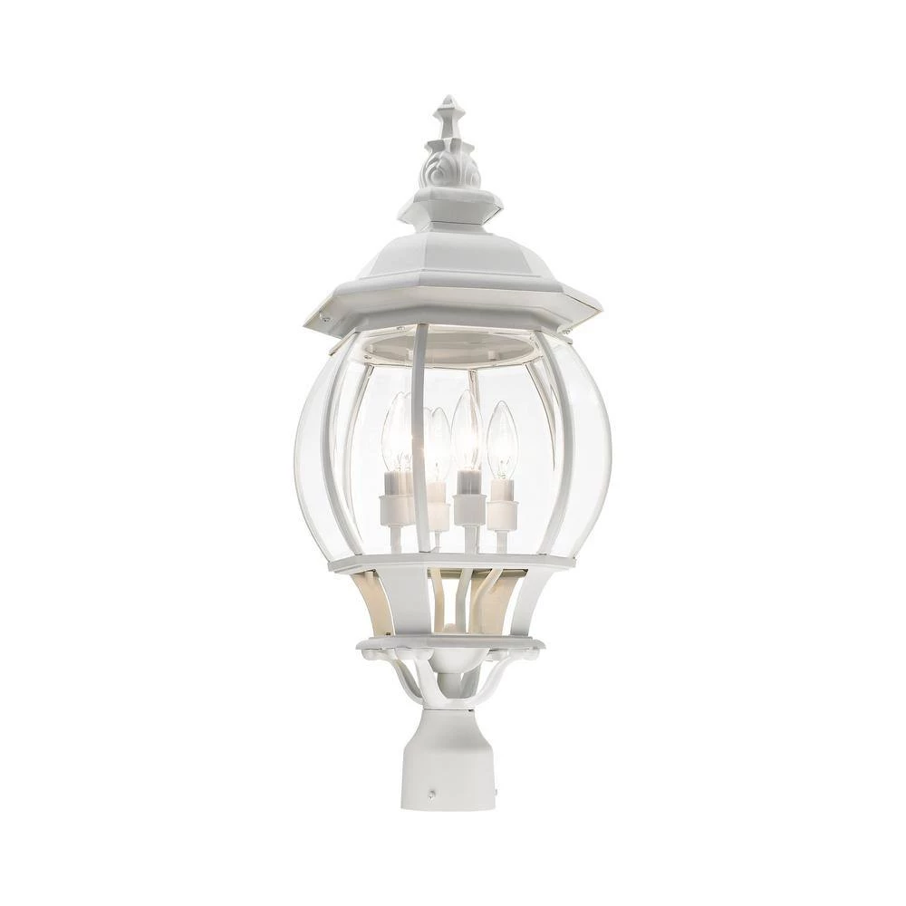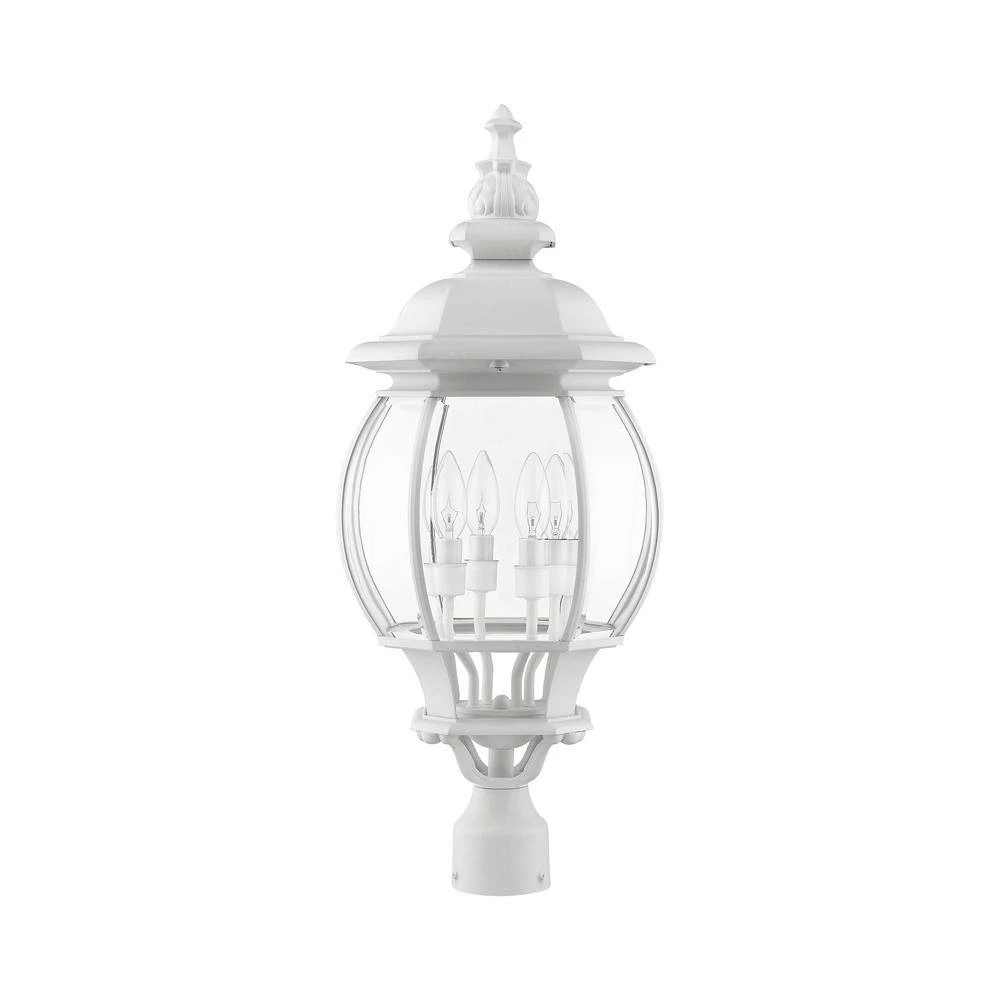 Livex Lighting is well known for quality, style and value. The classically transitional outdoor Frontenac collection boasts a cast aluminum structure with dazzling ornamental design. The 4-light large six-sided post top lantern comes in a textured white finish with clear beveled glass and extravagantly decorative details. The ornate quality of this light will add radiance to your house exterior day or night. This well-rounded fixture is sure to satisfy your lighting needs.