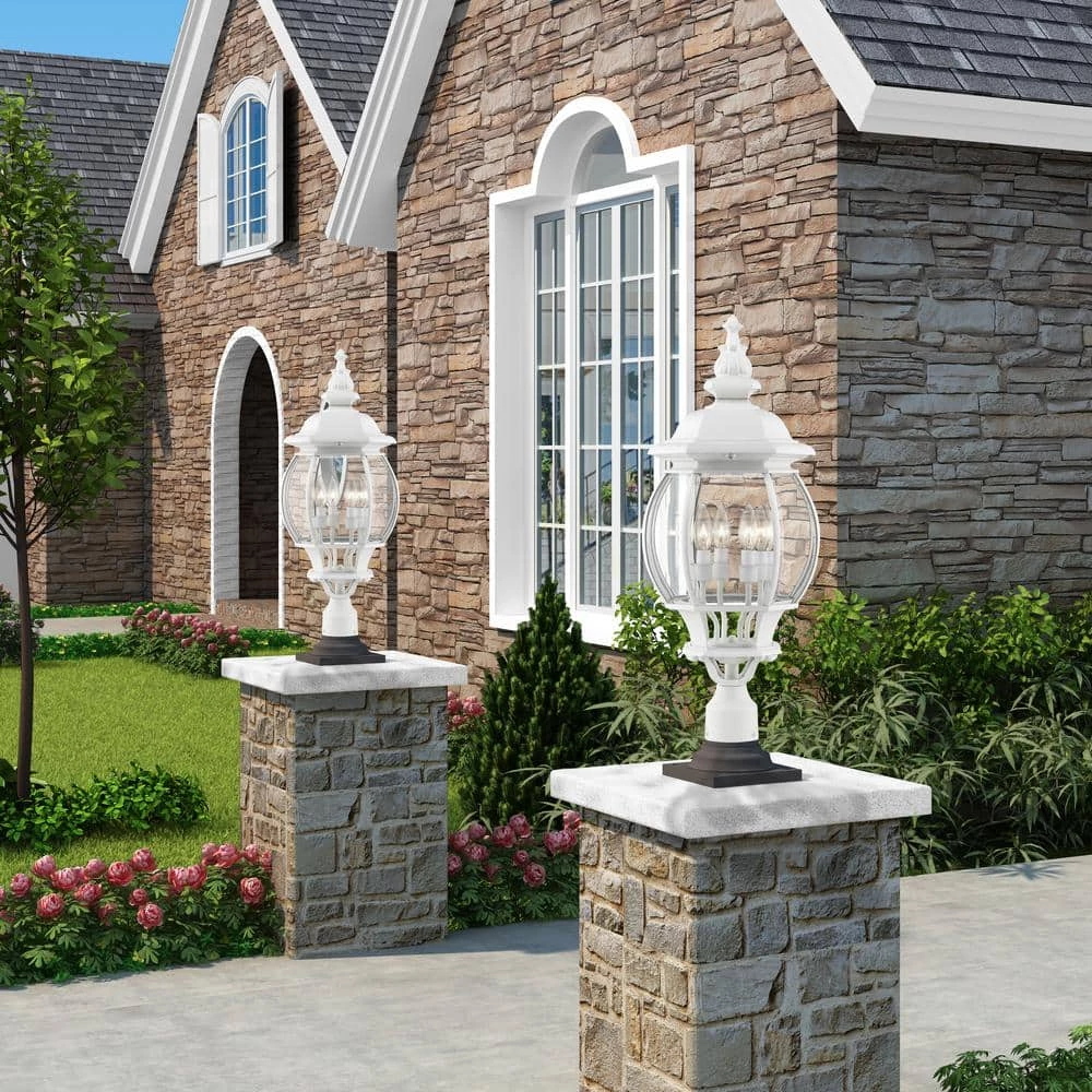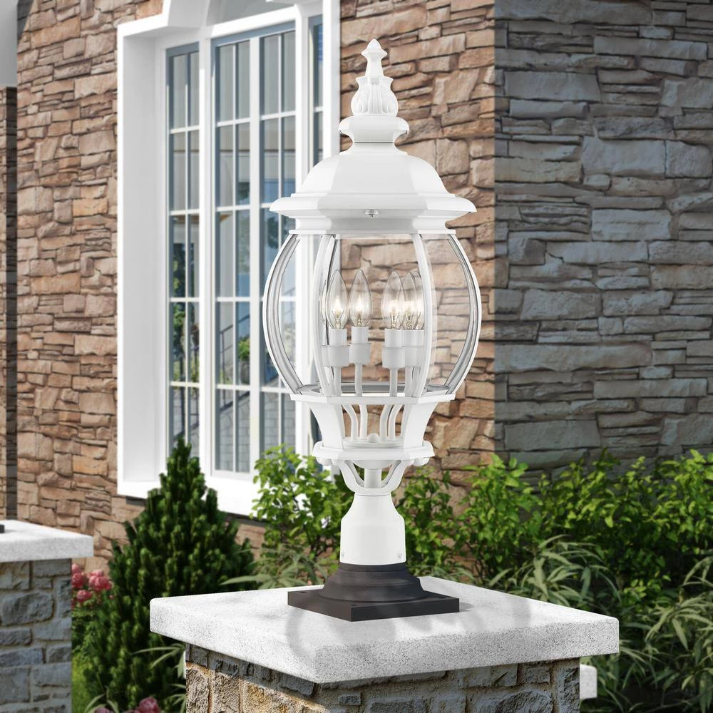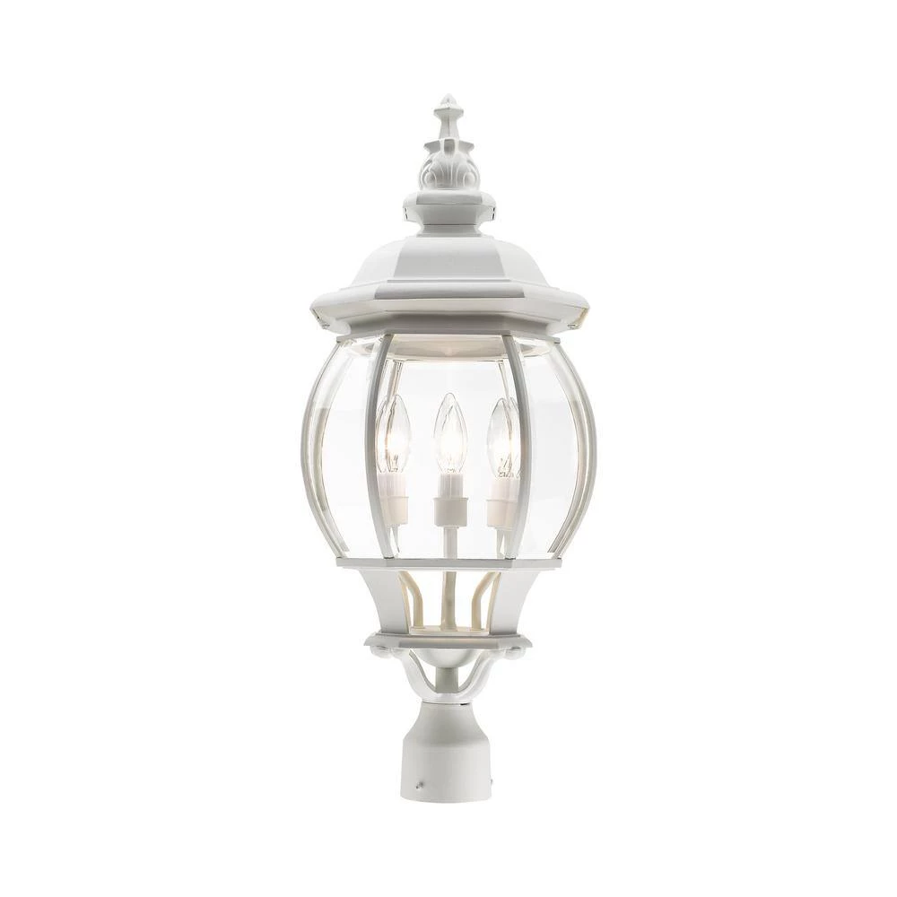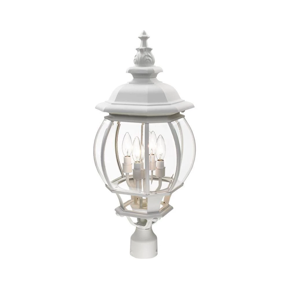 Livex Lighting is well known for quality, style and value. The classically transitional outdoor Frontenac collection boasts a cast aluminum structure with dazzling ornamental design. The 4-light large six-sided post top lantern comes in a textured white finish with clear beveled glass and extravagantly decorative details. The ornate quality of this light will add radiance to your house exterior day or night. This well-rounded fixture is sure to satisfy your lighting needs.