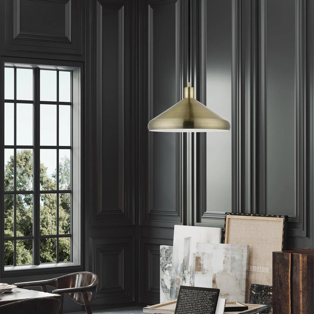 Livex Lighting is well known for quality, style and value. Featuring a clean and crisp modern look, the Geneva 1-light pendant makes a contemporary statement with the smooth cone shape of its antique brass finish exterior. A gleaming shiny white finish on the interior of the metal shade brings a refined touch of style.