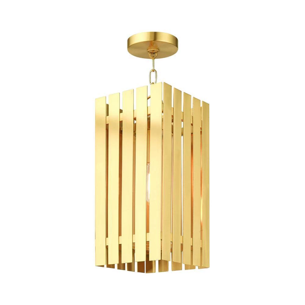 Livex Lighting is well known for quality, style and value. The Sheffield is defined by its bold geometric design and luxe satin brass finish. The solid brass outdoor pendant lantern features a clear glass cylinder under the striking cut-out design. Light shines from the bottom, as well as from the open areas of the design in the middle. An elegant sculptural look for your front entryway. This well-rounded fixture is sure to satisfy your lighting needs.