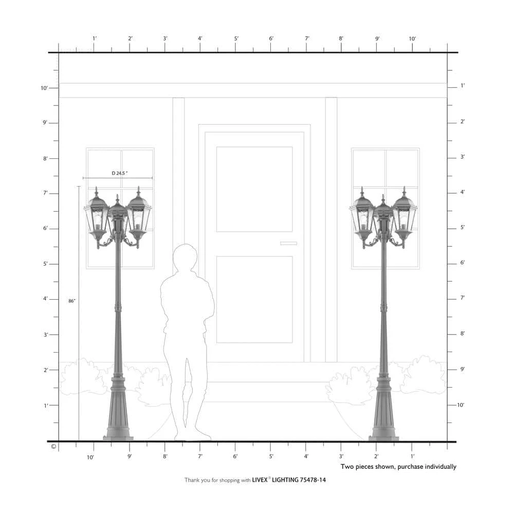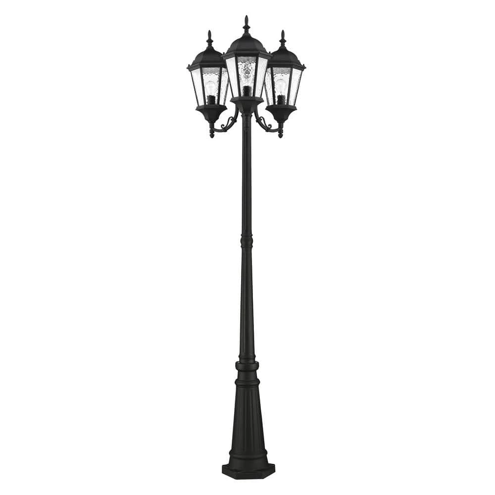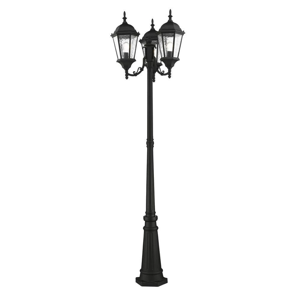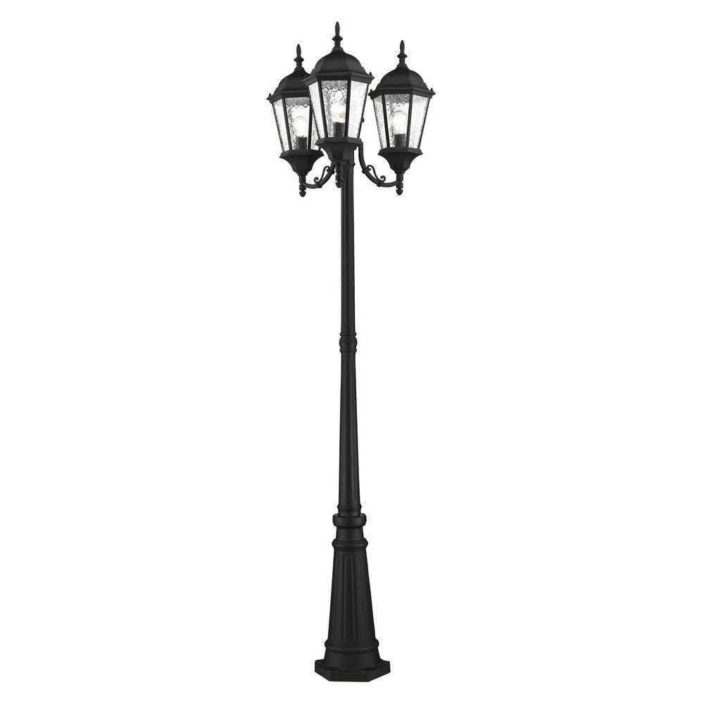 Livex Lighting is well known for quality, style and value. A decorative top and arm are paired with a simple six-sided frame in this textured black and clear water glass outdoor multi head post lanterns are constructed of cast aluminum. This well-rounded fixture is sure to satisfy your lighting needs.
