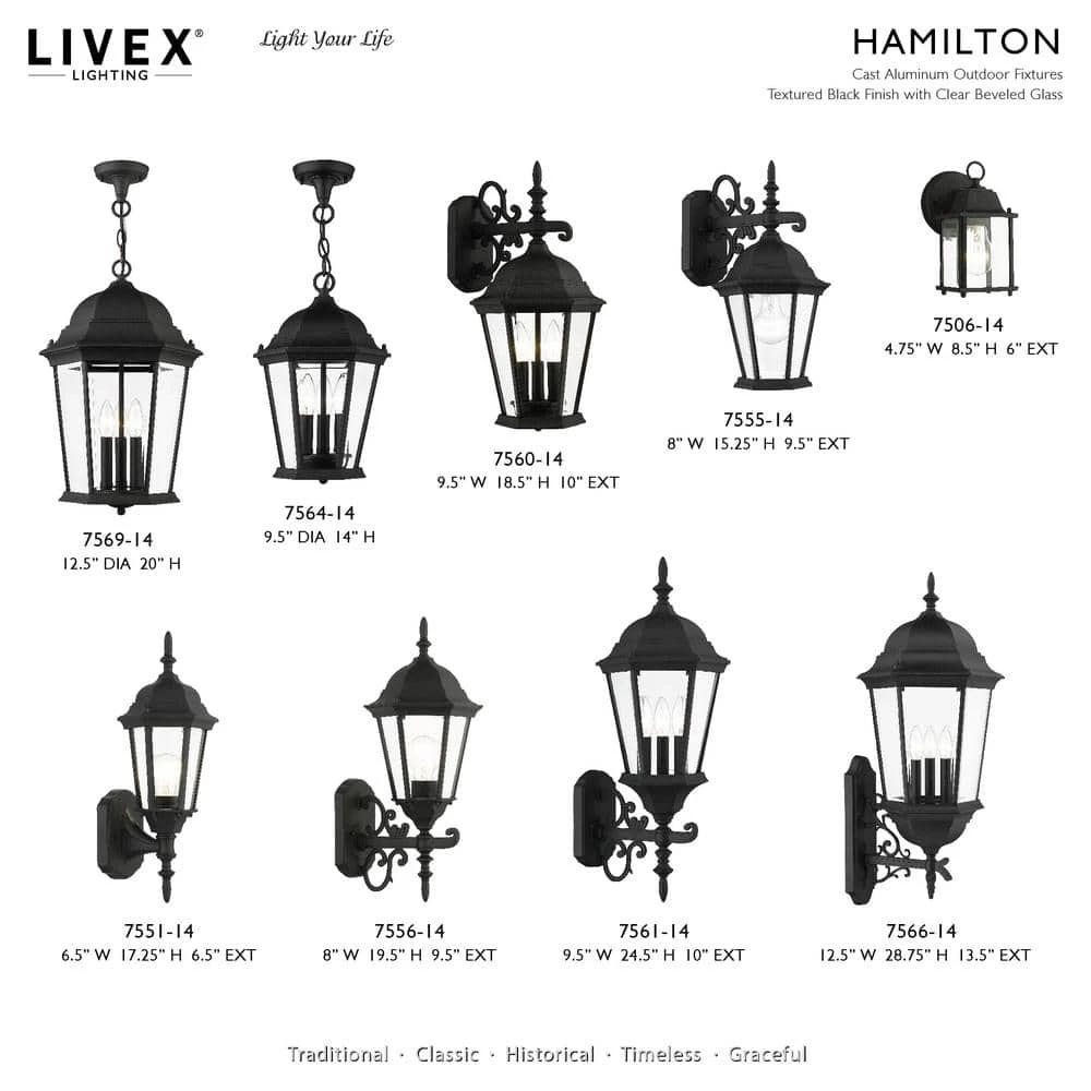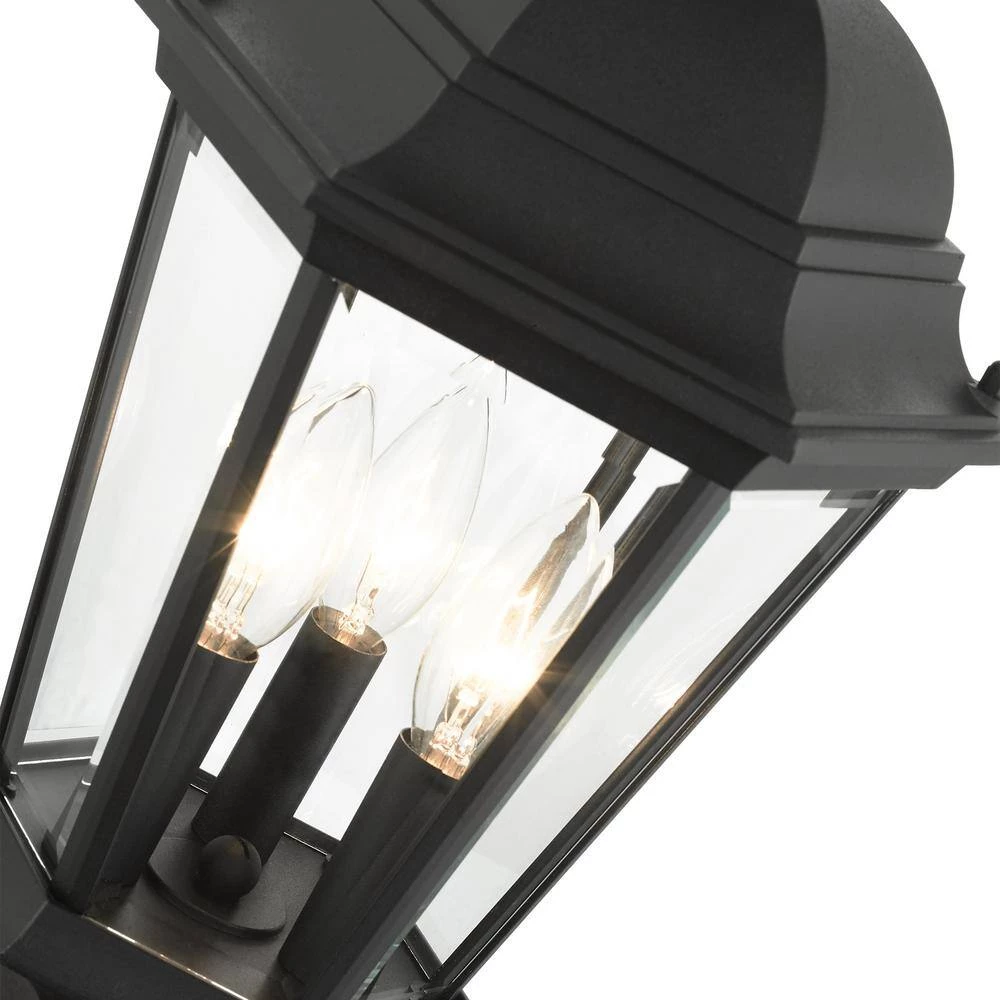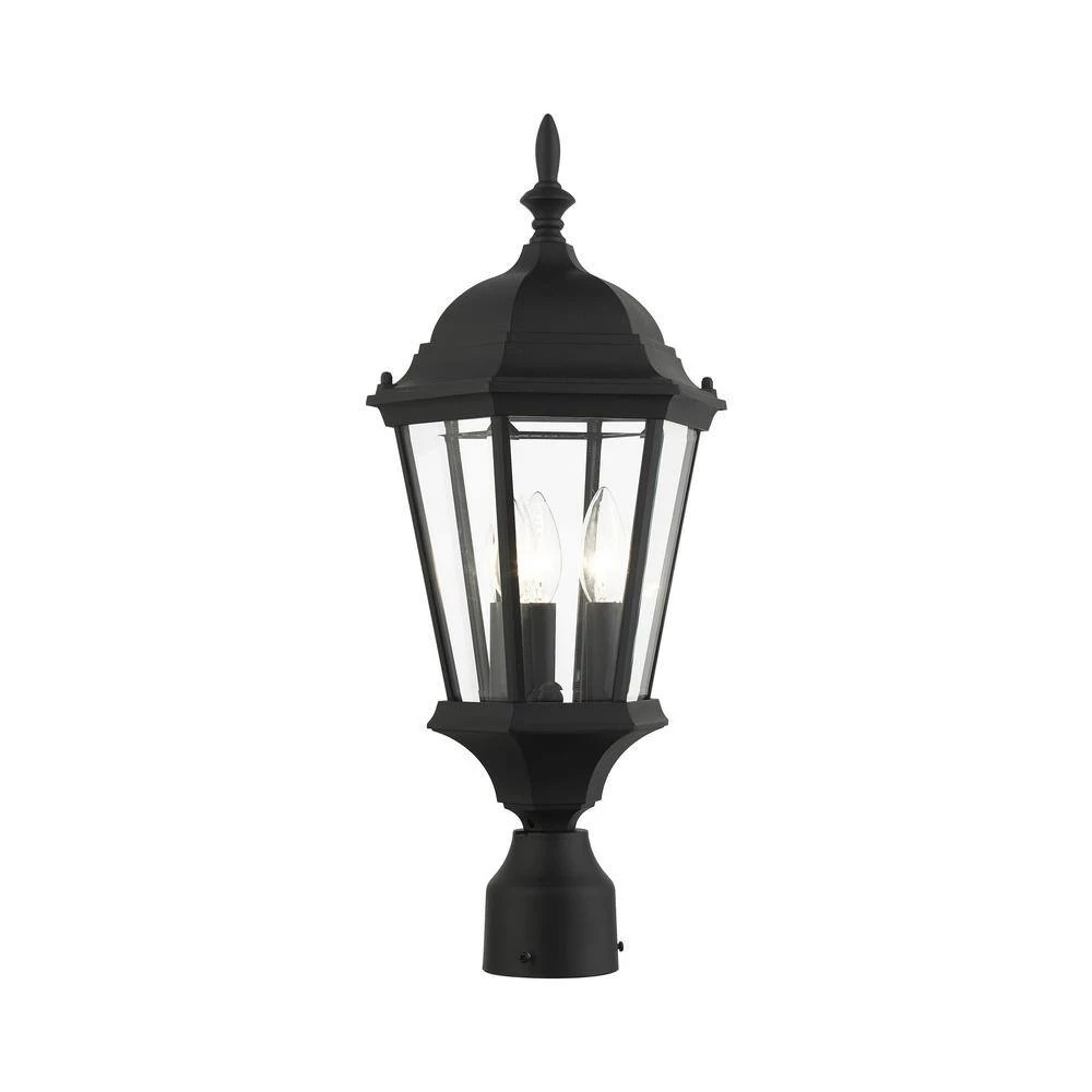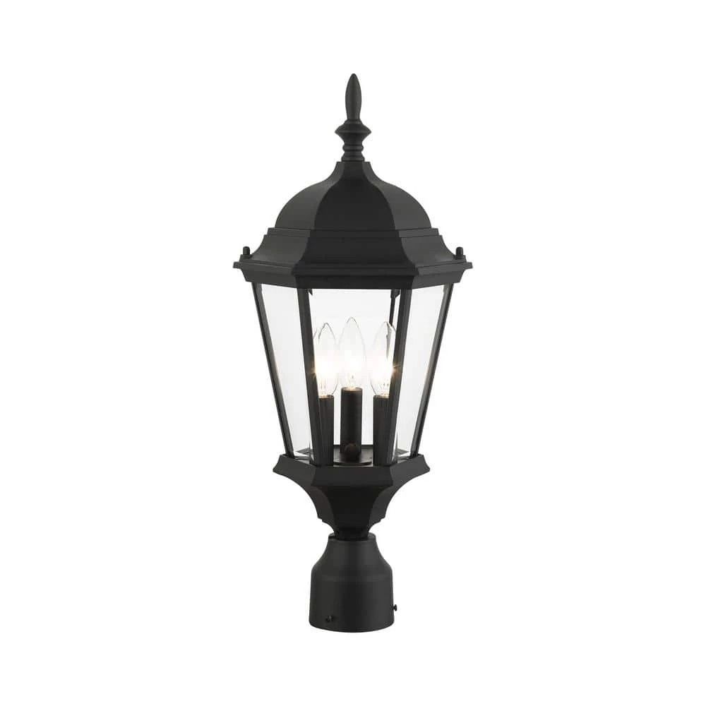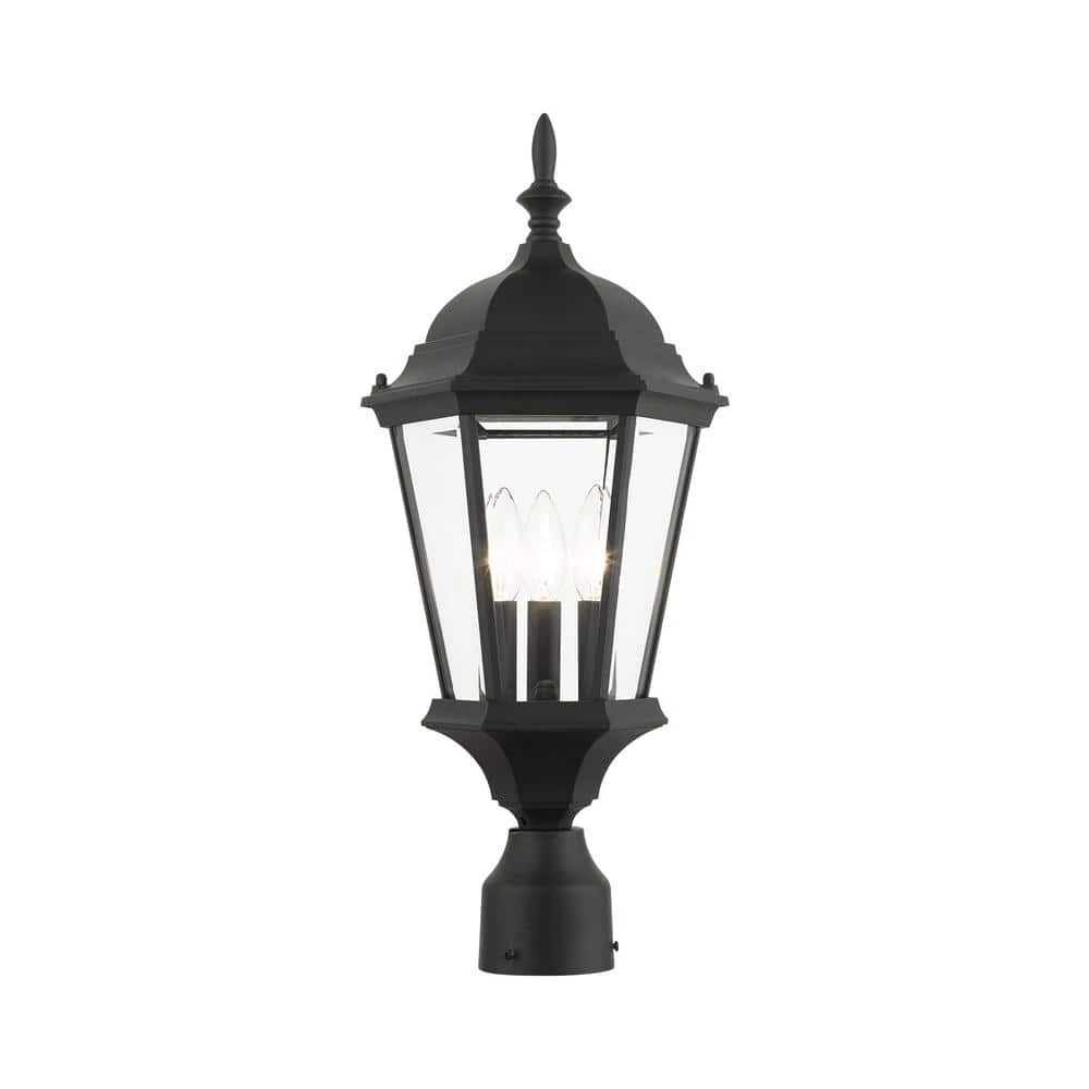 Livex Lighting is well known for quality, style and value. The elegant silhouette of the Hamilton collection is a classic that is sure to please even the most discriminating taste. This outdoor 3-light medium post top lantern features a decorative top and finial which are paired with a simple six-sided frame in this textured black finish with clear beveled glass. Constructed of cast aluminum, this durable exterior fixture looks best in traditional or transitional outdoor settings. This well-rounded fixture is sure to satisfy your lighting needs.