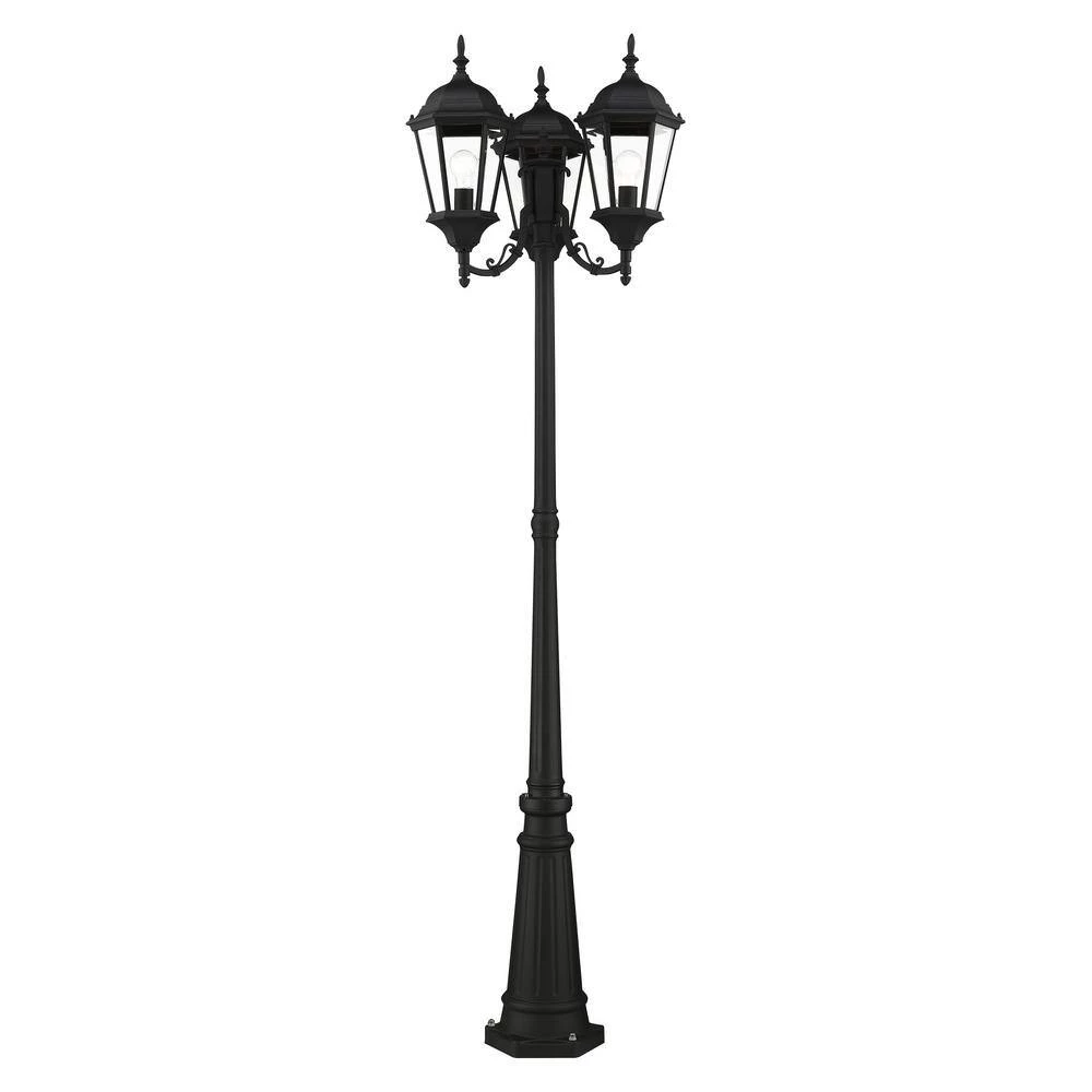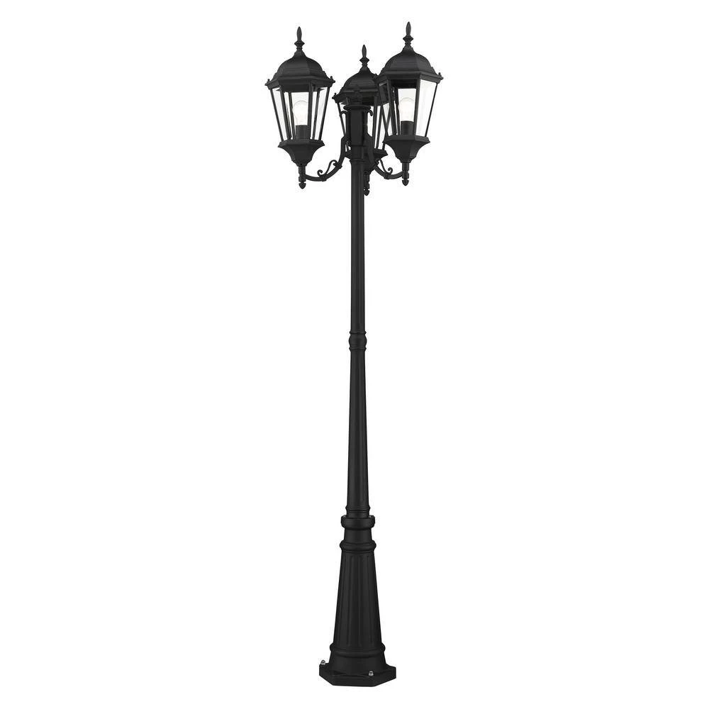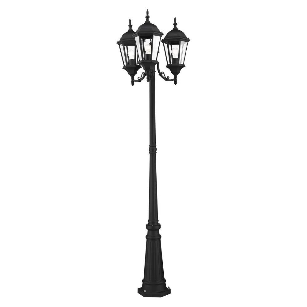 The elegant silhouette of the Hamilton collection is a classic that is sure to please even the most discriminating taste. This outdoor 3-headed upward facing post light features decorative tops and arms which are paired with a simple 6-sided frame in this textured black finish with clear beveled glass. Constructed of cast aluminum, this durable exterior fixture looks best in traditional or transitional outdoor settings.