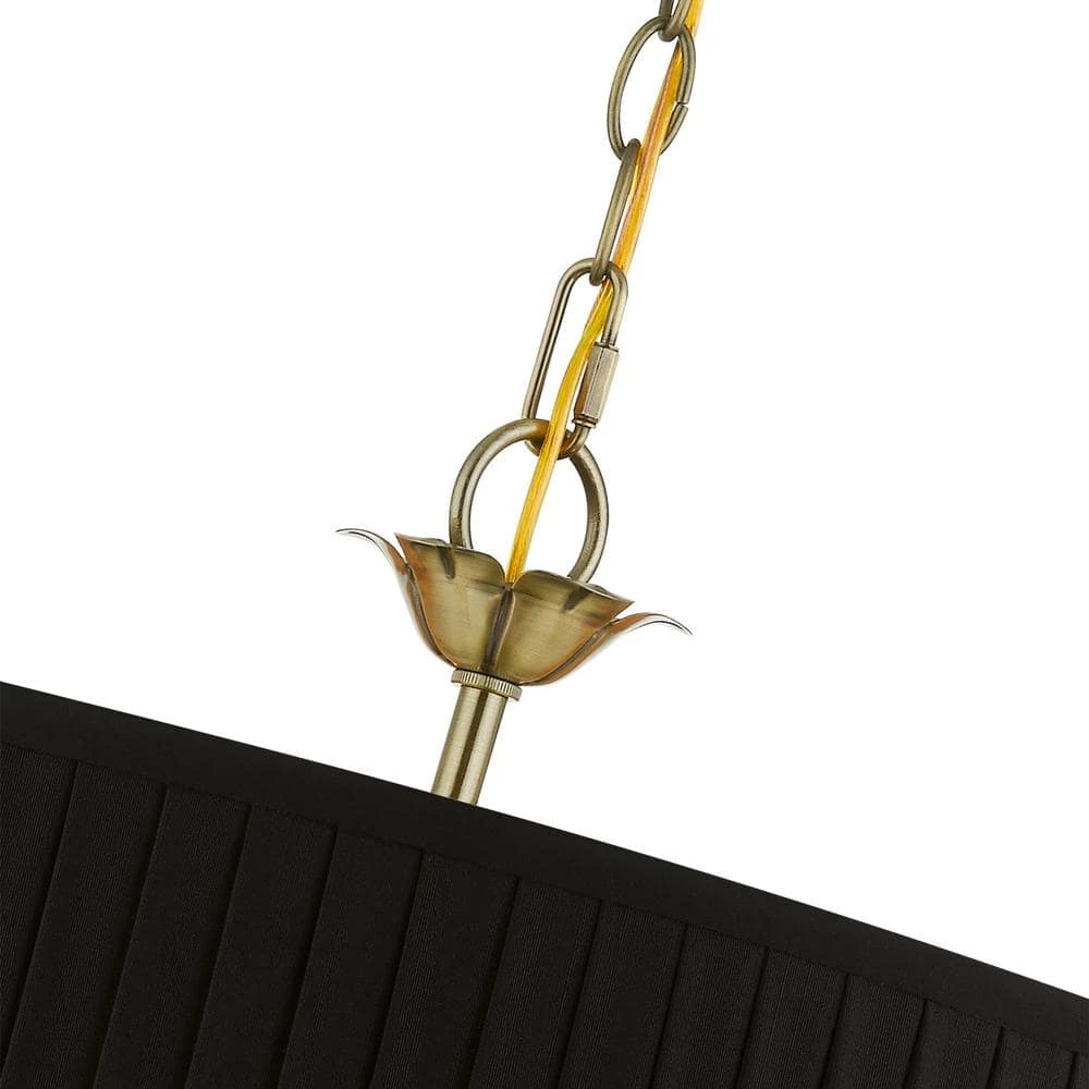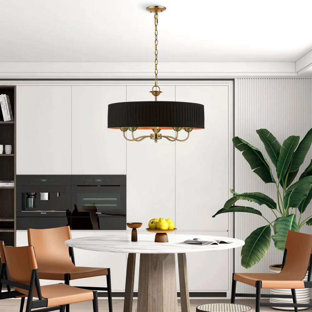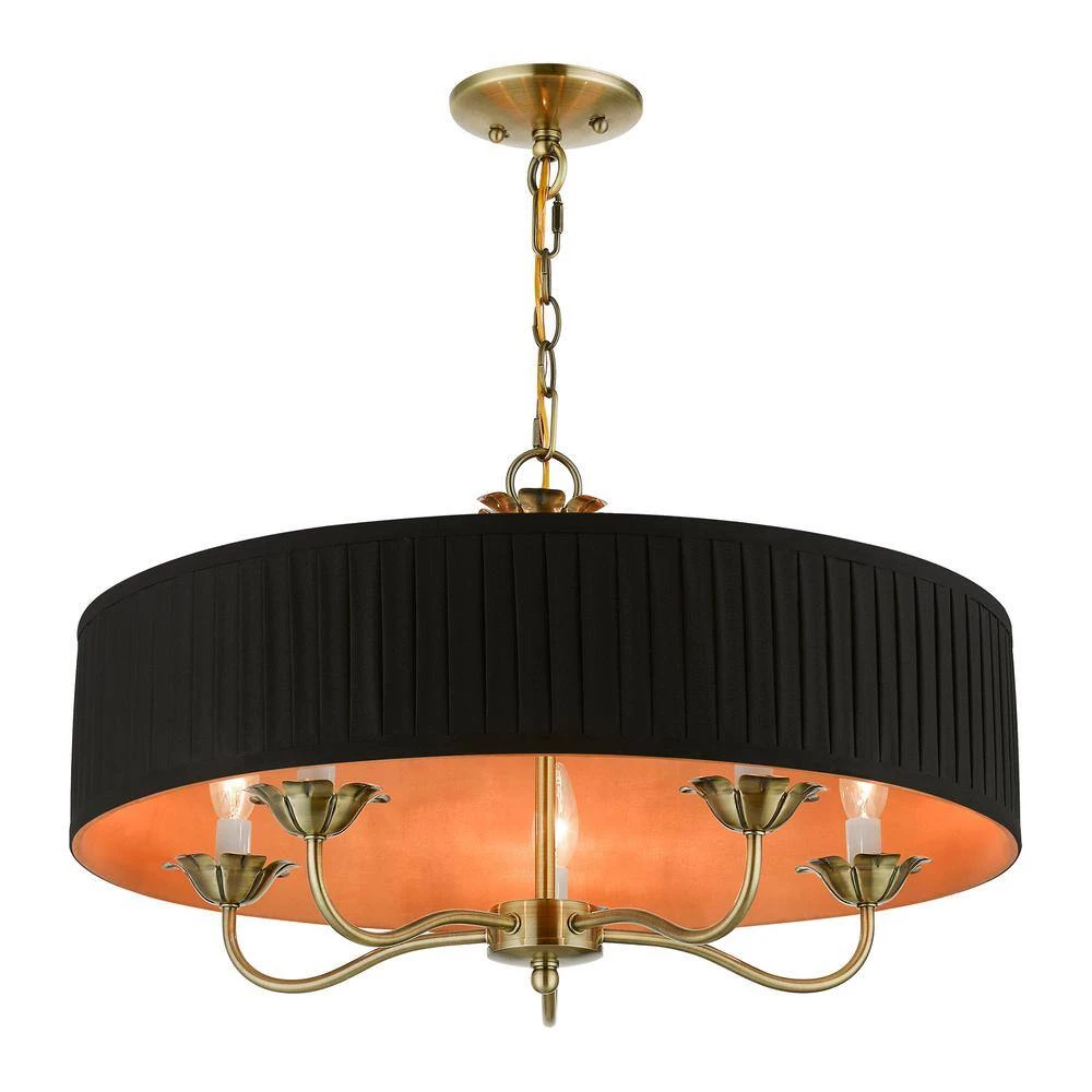 The 5-light Harrington pendant chandelier combines floral details and casual elements to create an updated look. The hand-crafted black fabric hardback pleated drum shade is set off by an inner silky orange fabric that combines with chandelier-like antique brass finish sweeping arms which creates a versatile effect. Perfect fit for the living room, dining room, kitchen or bedroom.
