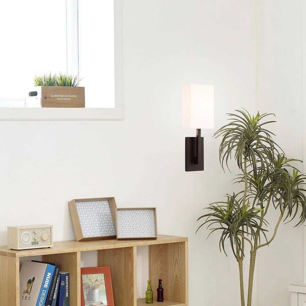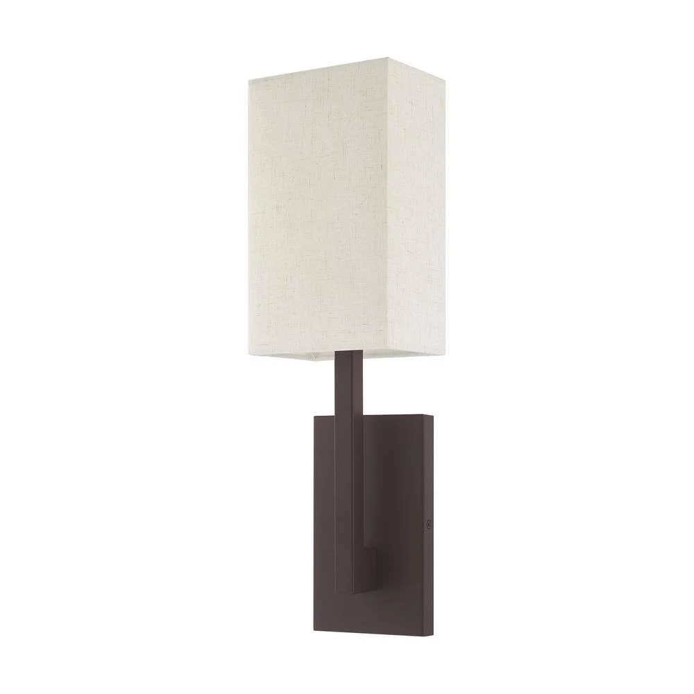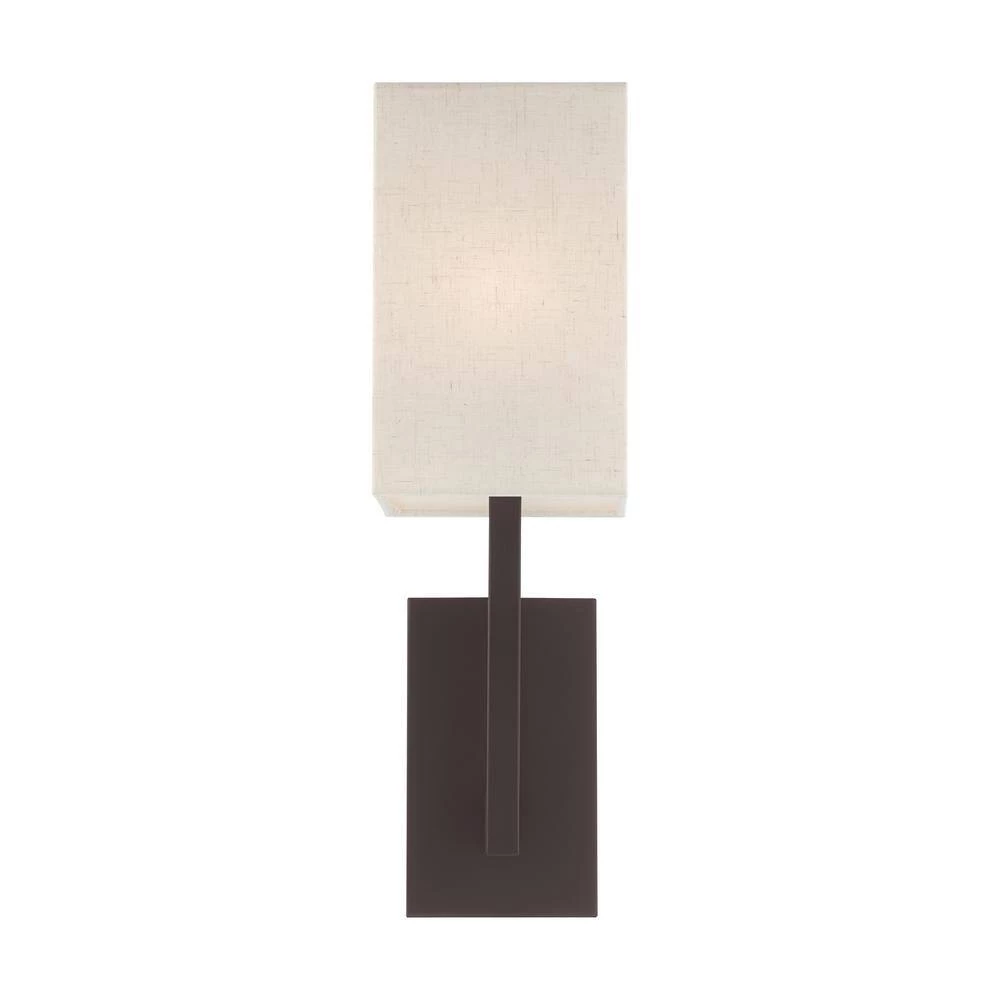 Livex Lighting is well known for quality, style and value. Raise the style bar with a designer wall sconce in a handsome and versatile contemporary manner. This 1-light wall sconce comes in a bronze finish with a rectangular oatmeal fabric hardback shade.