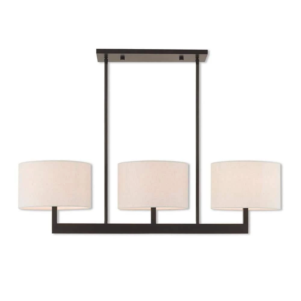 Livex Lighting is well known for quality, style and value. Raise the style bar with a designer linear chandelier in a handsome and versatile contemporary manner . This 3 light linear chandelier comes in a bronze finish with round oatmeal fabric hardback shade. This well-rounded fixture is sure to satisfy your lighting needs.