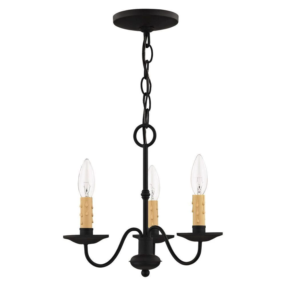 The clean design of this steel construction three light chandelier/semi flush mount is enhanced with a black finish. The sweeping arms create a slim silhouette from which the candelabra bulbs emit their soft, romantic glow. Its informal, transitional beauty works well with many room decor schemes.