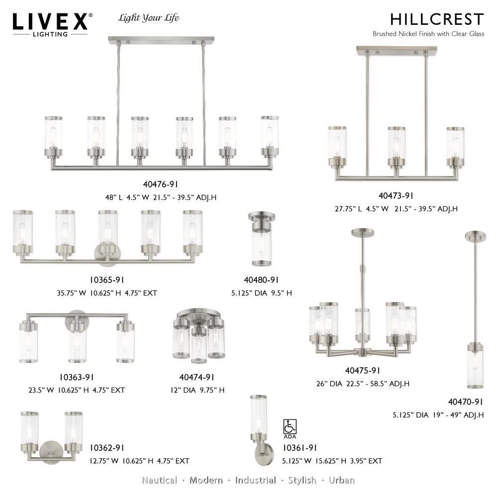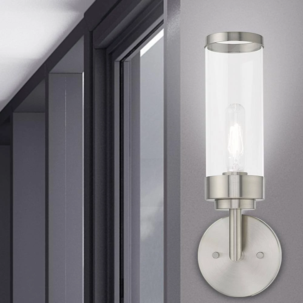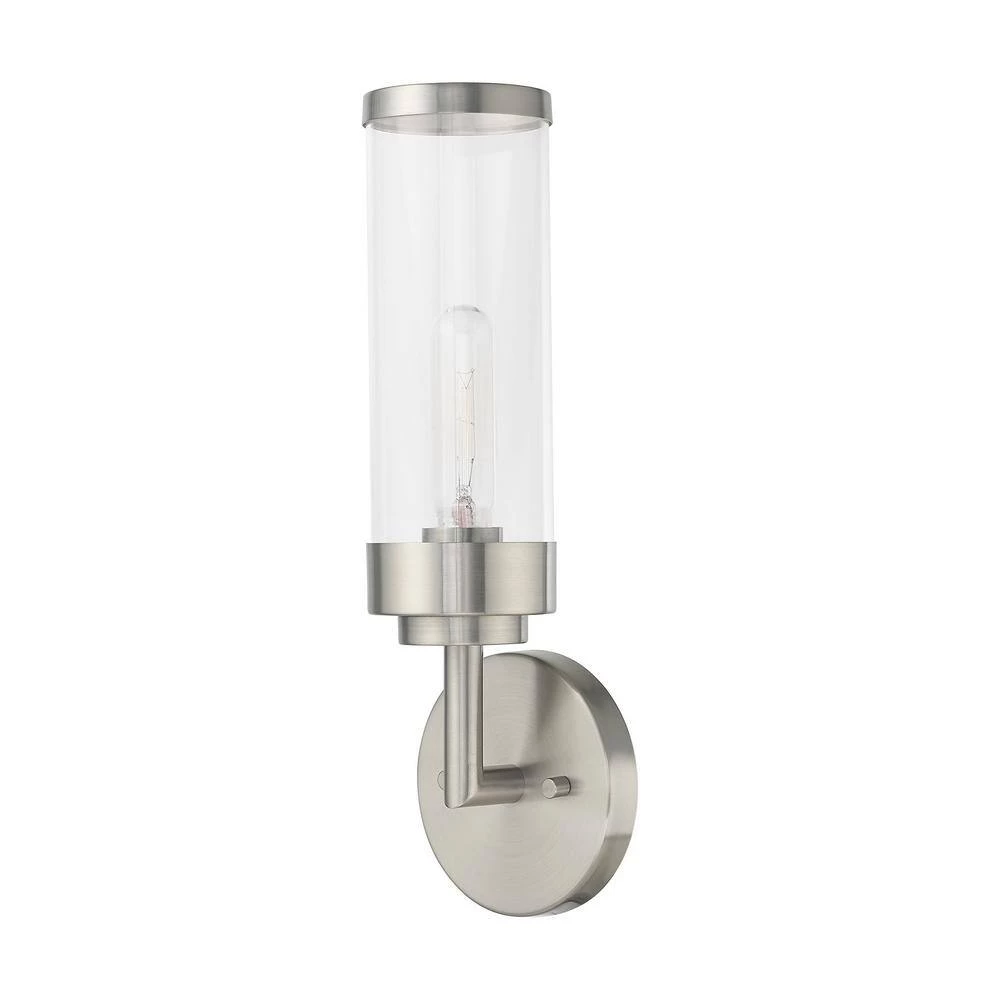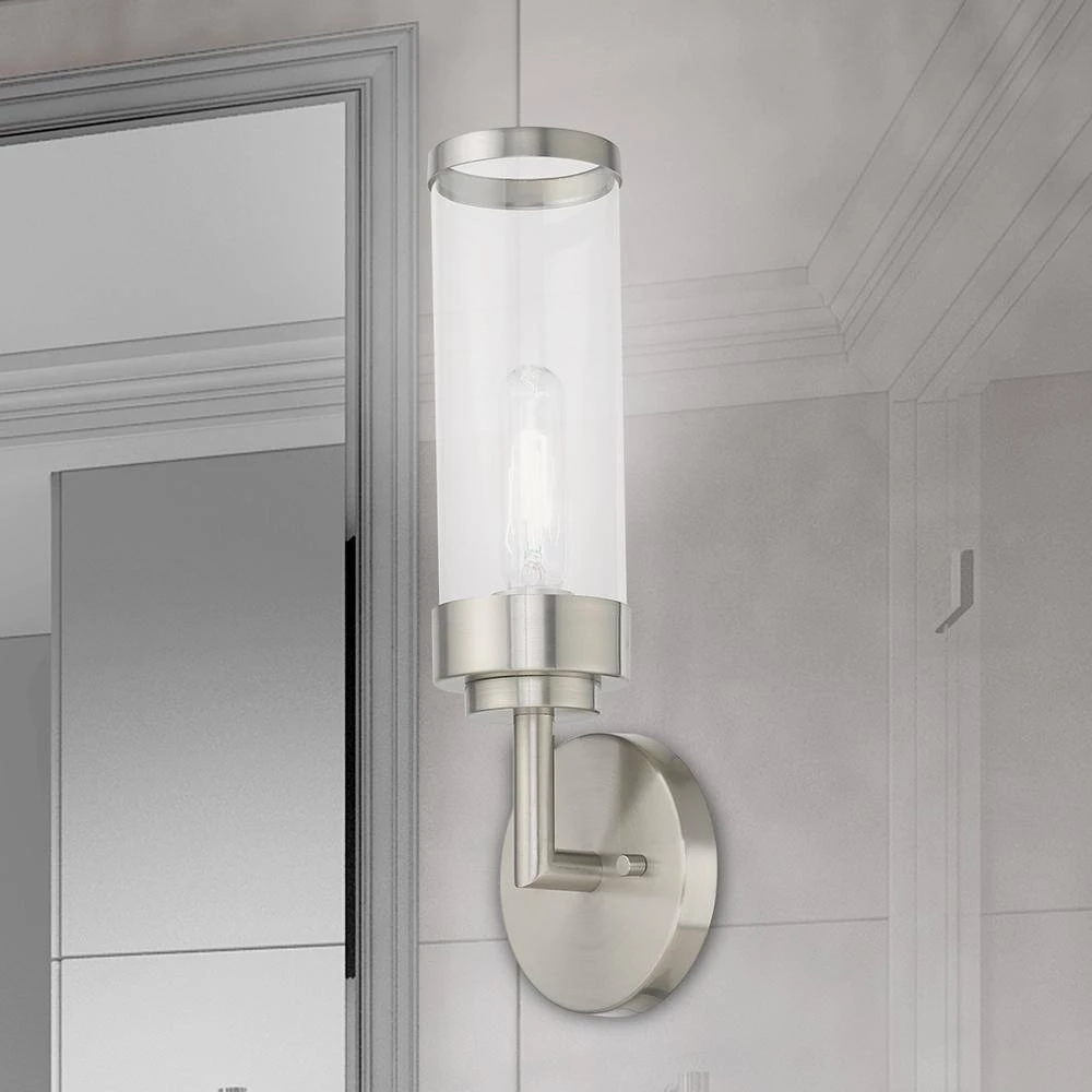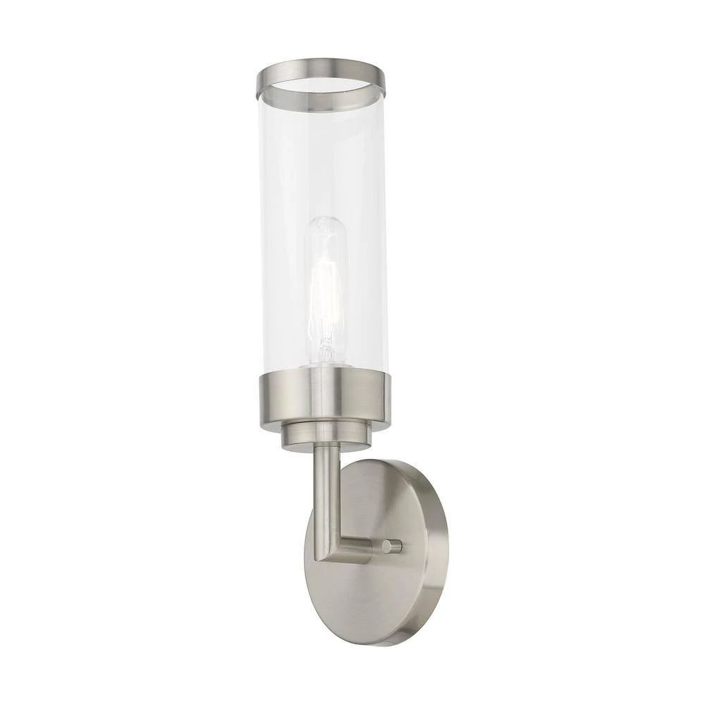 Livex Lighting is well known for quality, style and value. The one light wall sconce from the Hillcrest collection features a simple elegant brushed nickel frame paired with clear glass shades. Each shade is accented with a banded brushed nickel ring to carry through the theme of finely crafted metal fittings. This well-rounded fixture is sure to satisfy your lighting needs.