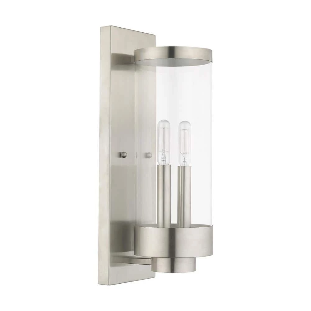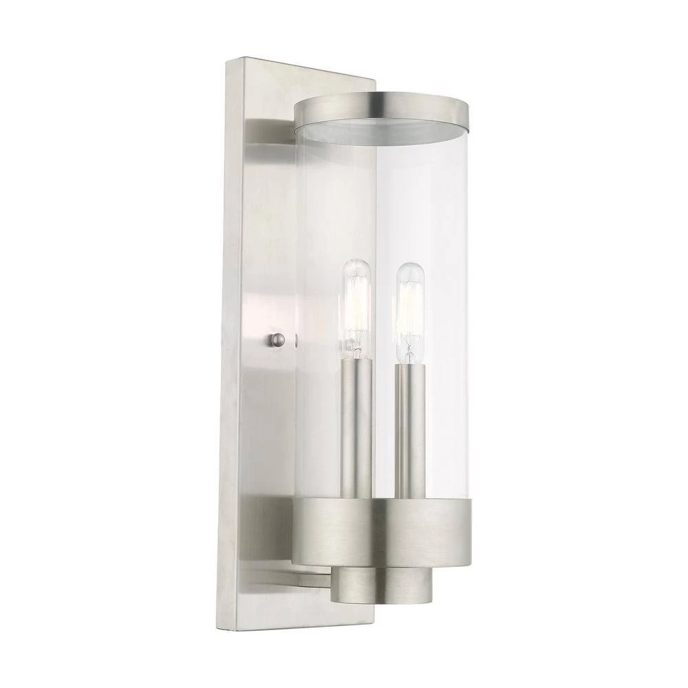 The 2-light outdoor wall lantern from the Hillcrest collection made of rugged stainless steel features a simple elegant brushed nickel frame paired with closed top clear glass shade. The shade is accented with a banded brushed nickel ring to carry through the theme of finely crafted metal fittings. With the superb craftsmanship and affordable price this fixture is sure to tastefully indulge your extravagant side.