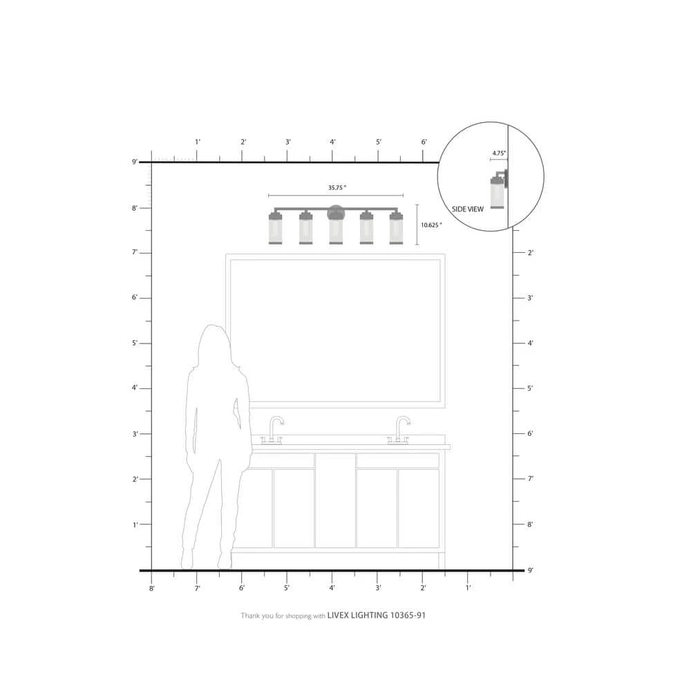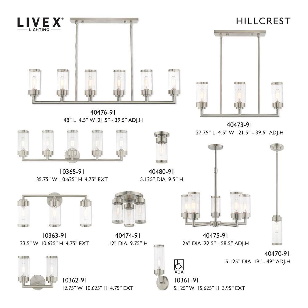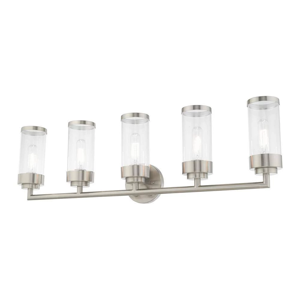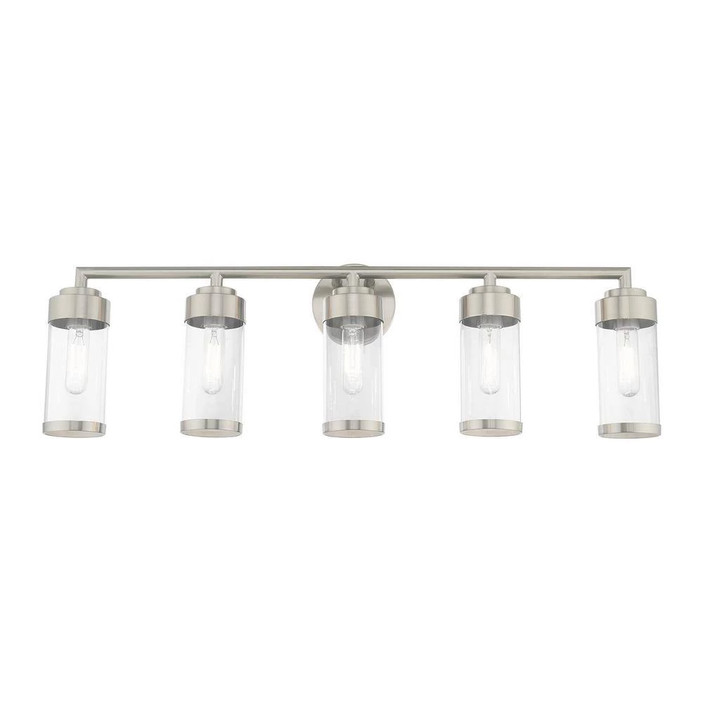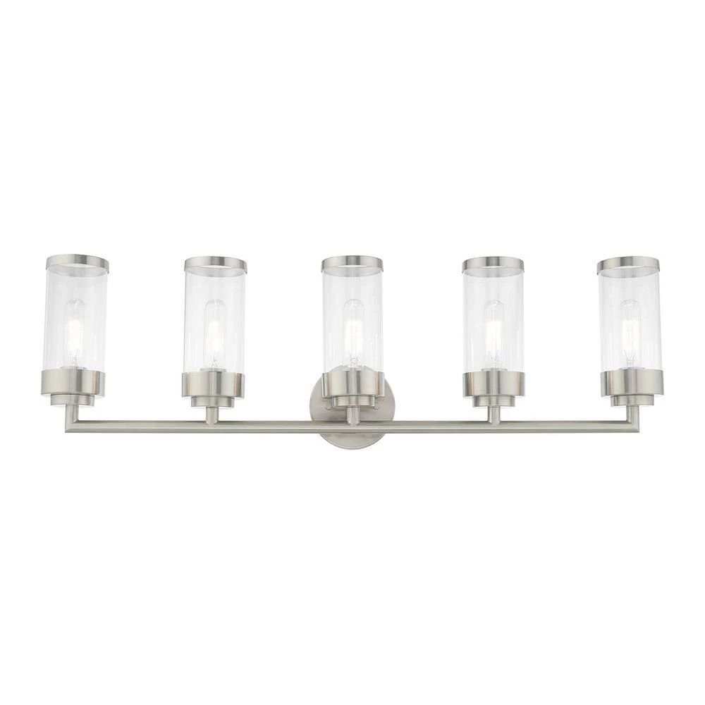 Livex Lighting is well known for quality, style and value. The 5 light bath vanity from the Hillcrest collection features a simple elegant brushed nickel frame paired with clear glass shades. Each shade is accented with a banded brushed nickel ring to carry through the theme of finely crafted metal fittings. This well-rounded fixture is sure to satisfy your lighting needs.