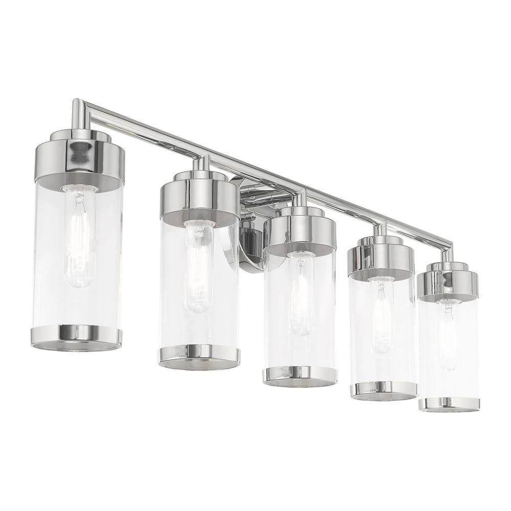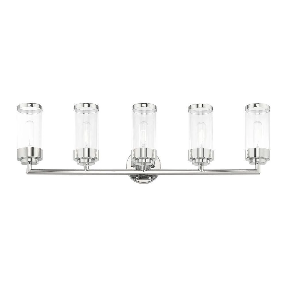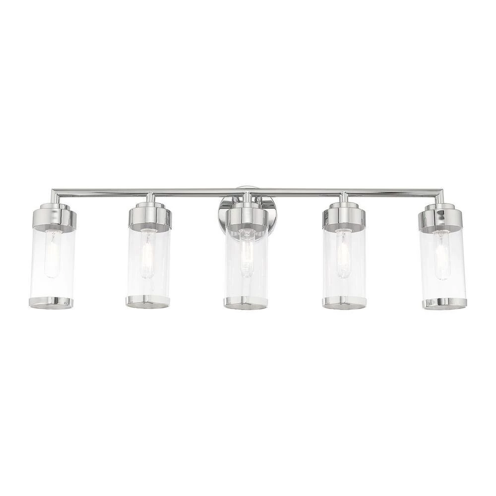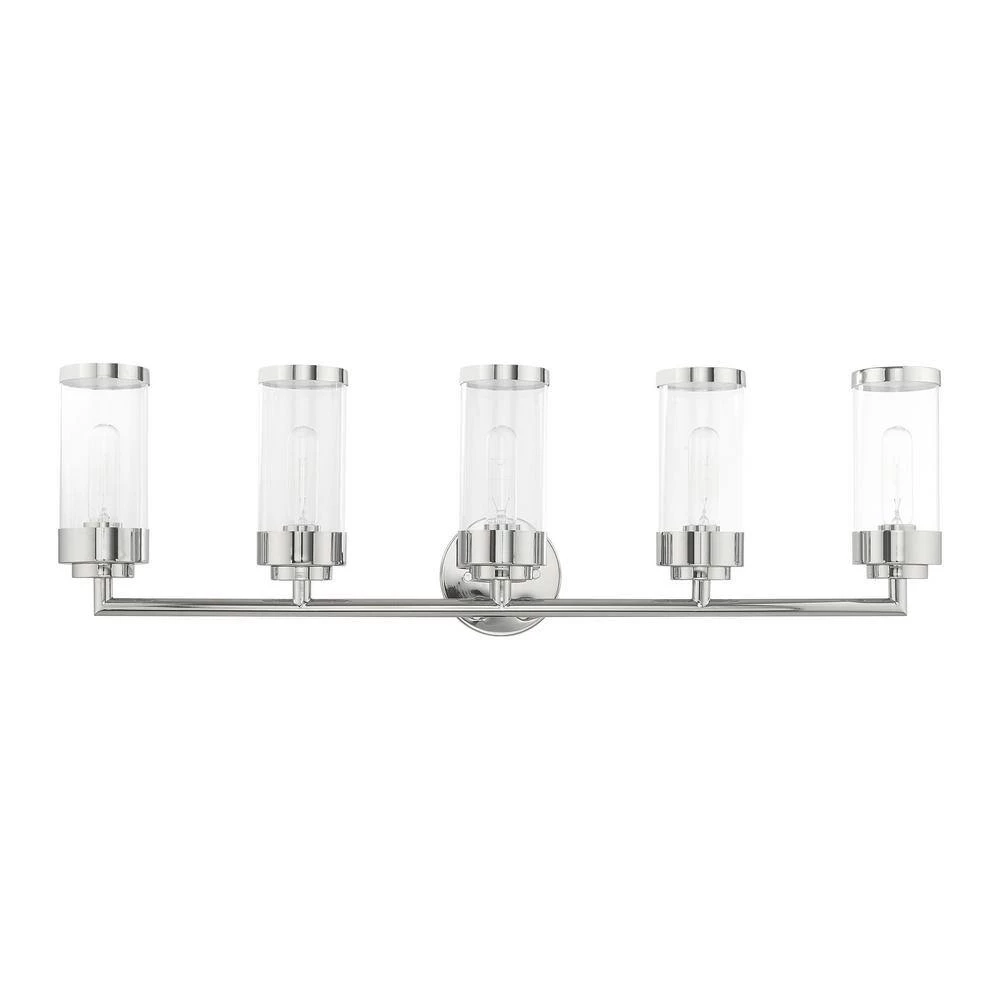 Livex Lighting is well known for quality, style and value. The 5 light bath vanity from the Hillcrest collection features a simple elegant polished chrome frame paired with clear glass shades. Each shade is accented with a banded polished chrome ring to carry through the theme of finely crafted metal fittings. This well-rounded fixture is sure to satisfy your lighting needs.