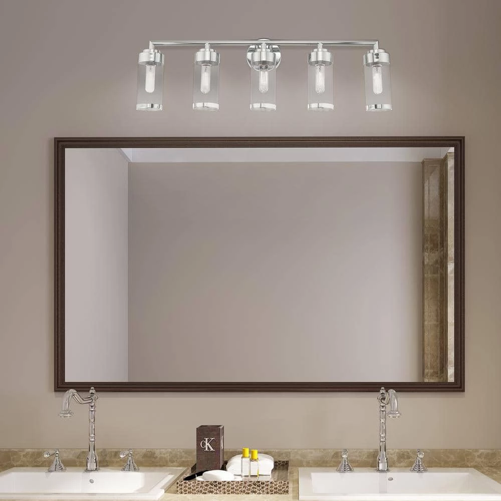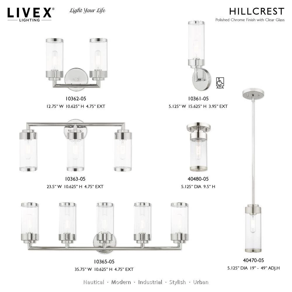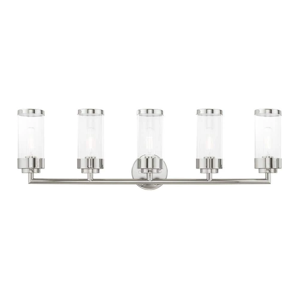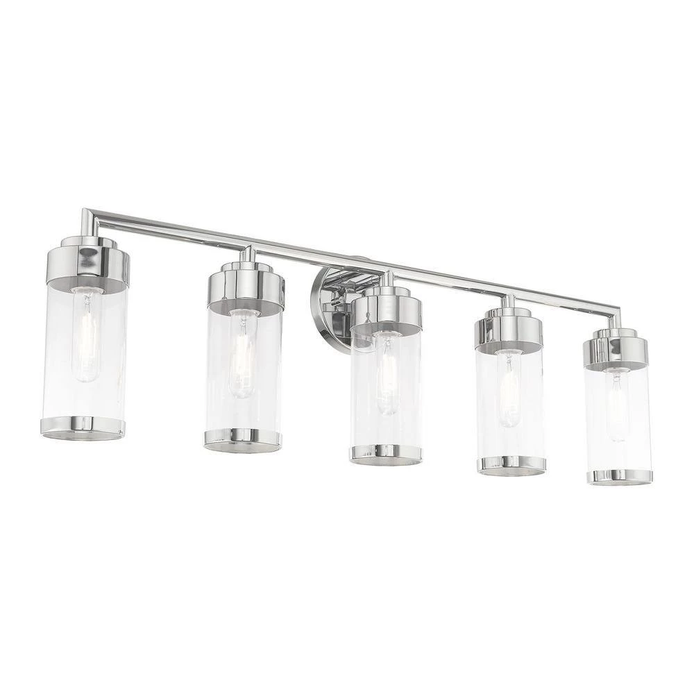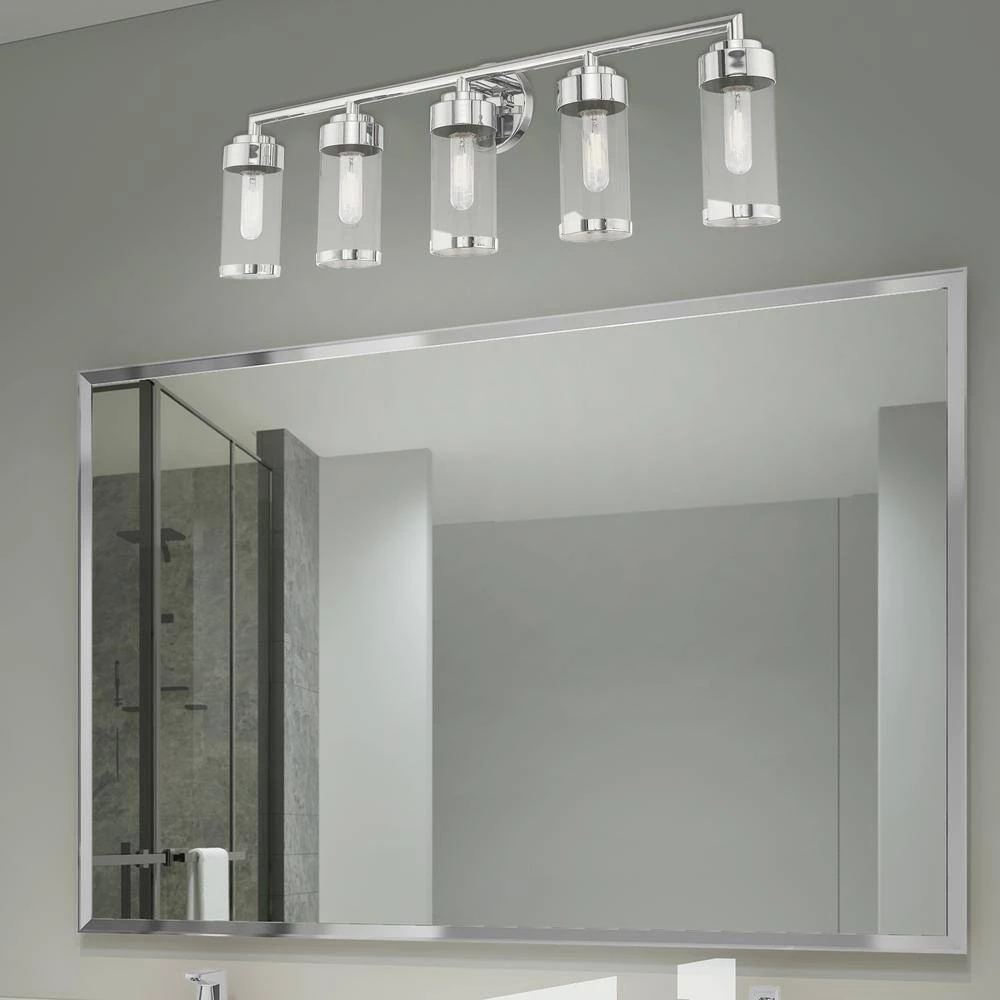 Livex Lighting is well known for quality, style and value. The 5 light bath vanity from the Hillcrest collection features a simple elegant polished chrome frame paired with clear glass shades. Each shade is accented with a banded polished chrome ring to carry through the theme of finely crafted metal fittings. This well-rounded fixture is sure to satisfy your lighting needs.