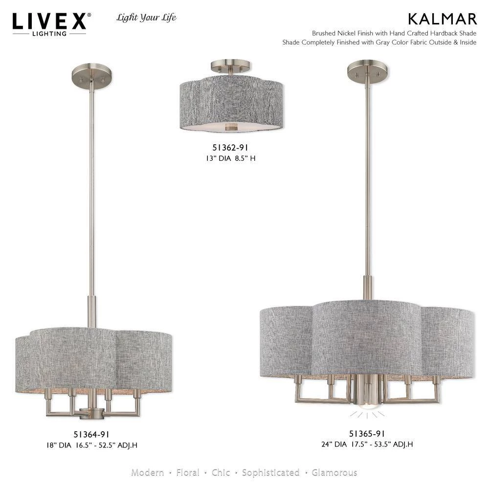 Livex Lighting is well known for quality, style and value. The brushed nickel frame gives the Kalmar 2 light ceiling mount a clean, modern feel while the cool, clover shaped gray hand crafted hardback drum shade adds an unexpected splash of fun. This well-rounded fixture is sure to satisfy your lighting needs.