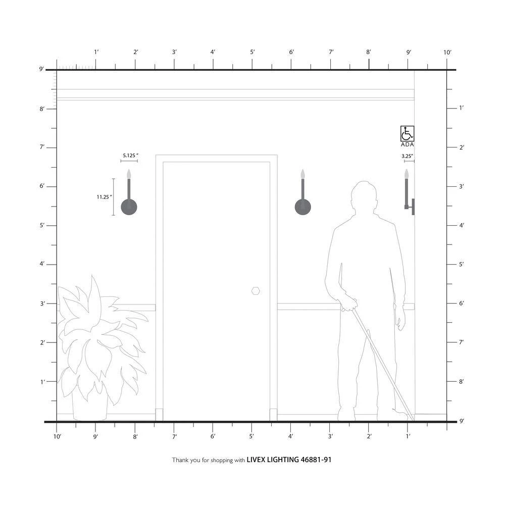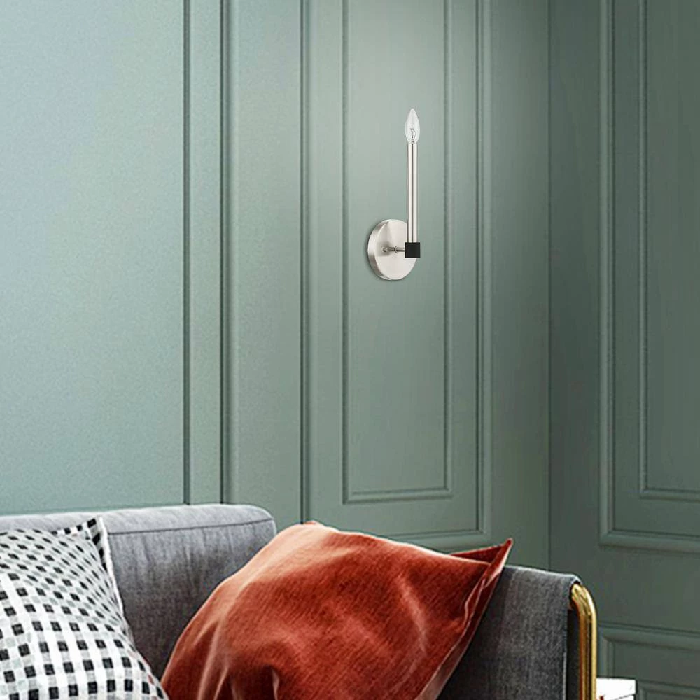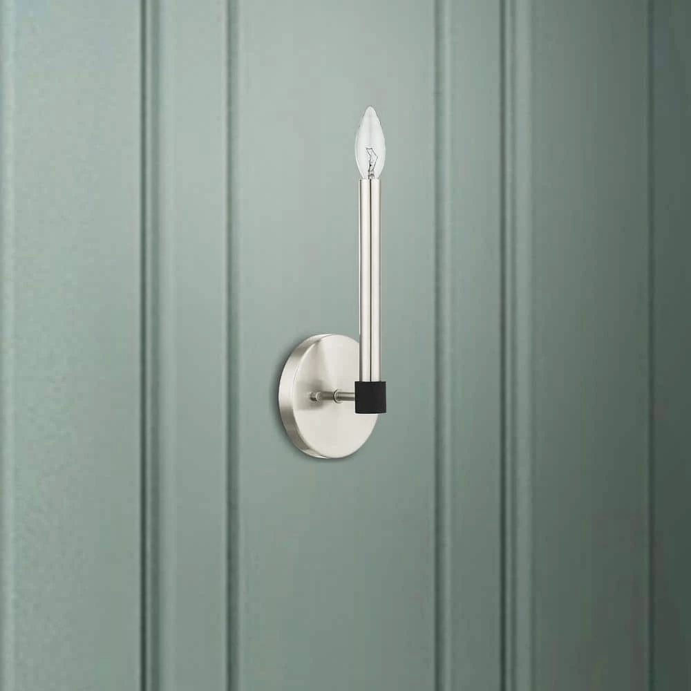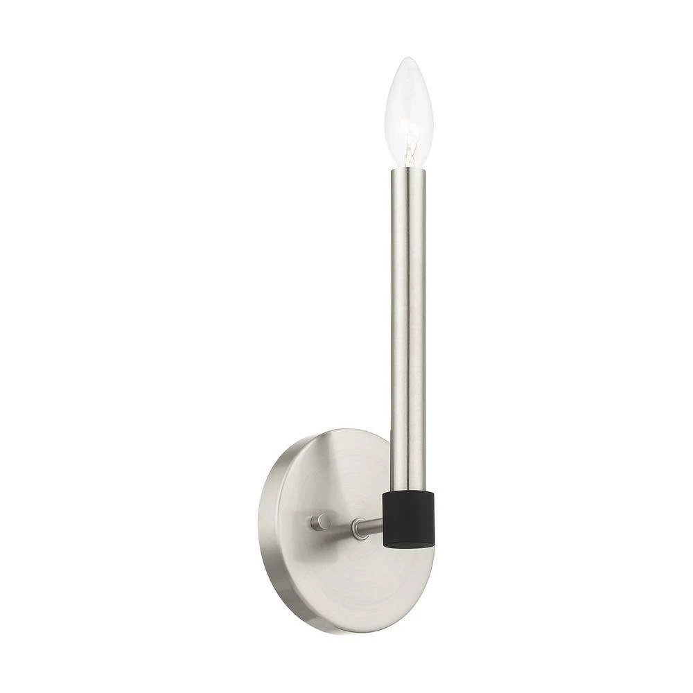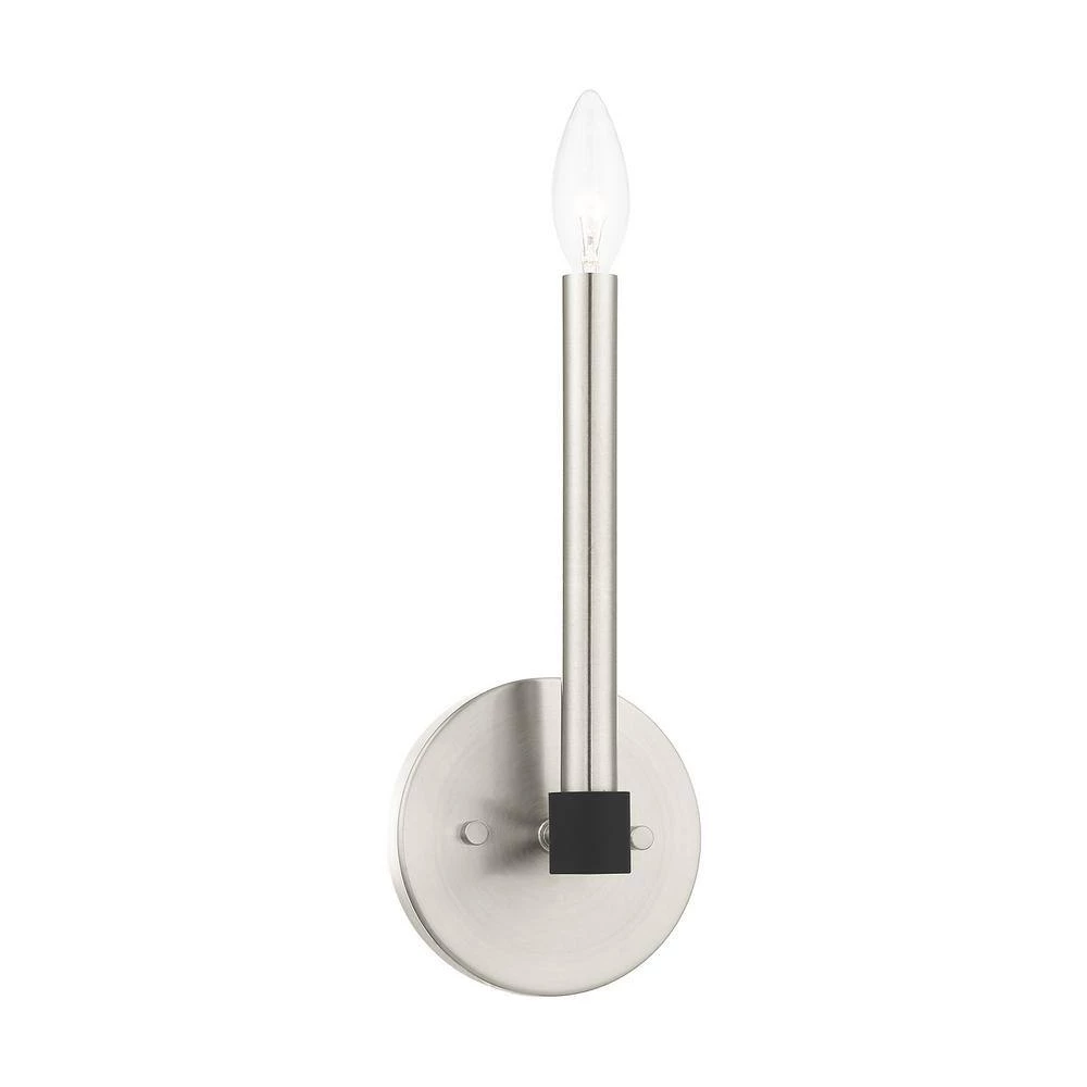 Livex Lighting is well known for quality, style and value. Simplicity and attention to detail are the key elements of the Karlstad collection. The dimensional form, exposed bulbs and 2-tone finishes add a playful mood to a contemporary or urban interior. This ADA single light sconce design gives a new face to a hallway, dining area or a bathroom vanity. It is shown in a brushed nickel finish with black finish accents. This well-rounded fixture is sure to satisfy your lighting needs.