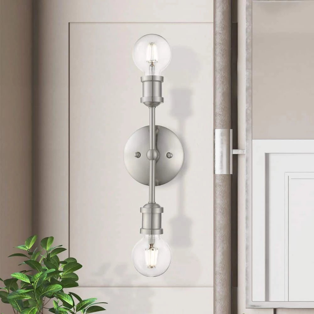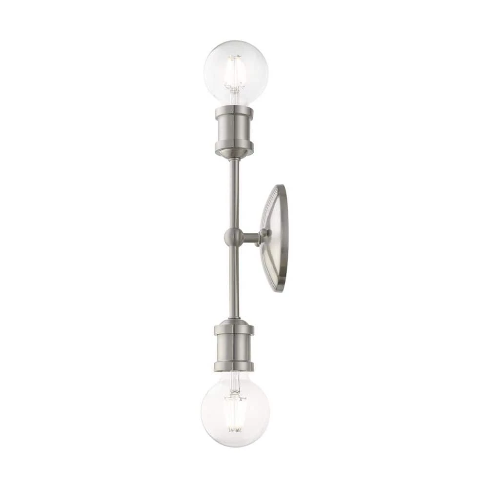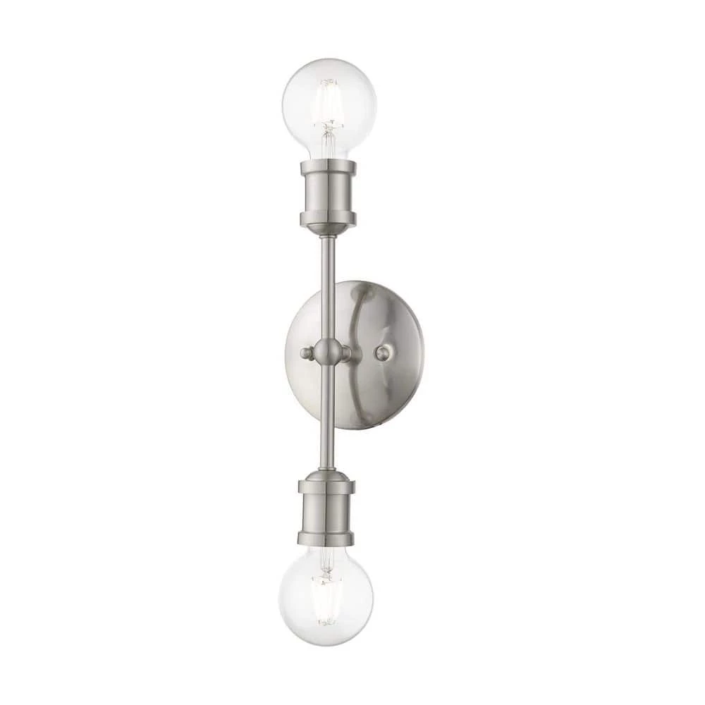Simplicity and attention to detail are the key elements of the Lansdale collection. The dimensional form, exposed bulbs and combination of finishes adds a playful mood to a contemporary or urban interior. This two-light sconce design gives a new face to a bedroom, hallway or a bathroom vanity. It is shown in a brushed nickel finish.