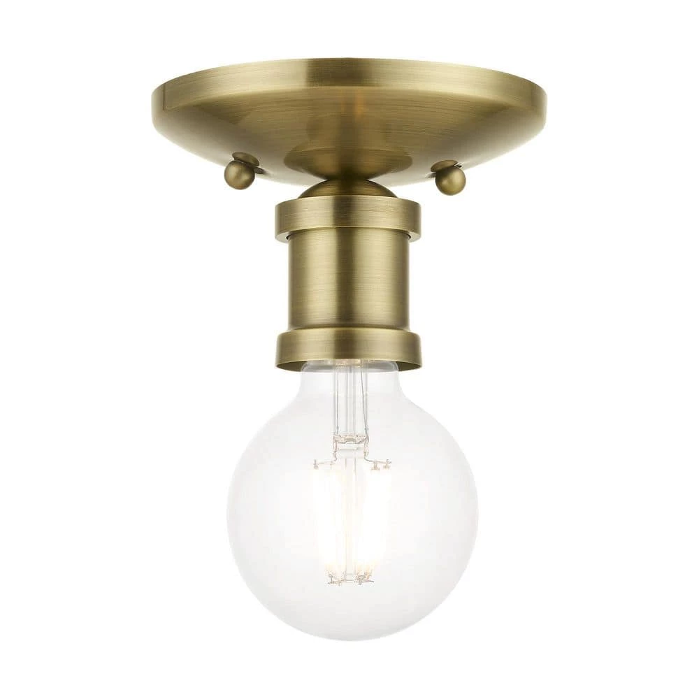 Simplicity and attention to detail are the key elements of the Lansdale collection. The dimensional form, exposed bulbs and combination of finishes adds a playful mood to a contemporary or urban interior. This single light flush mount design gives a new face to a bedroom, hallway or a bathroom vanity. It is shown in an antique brass finish.