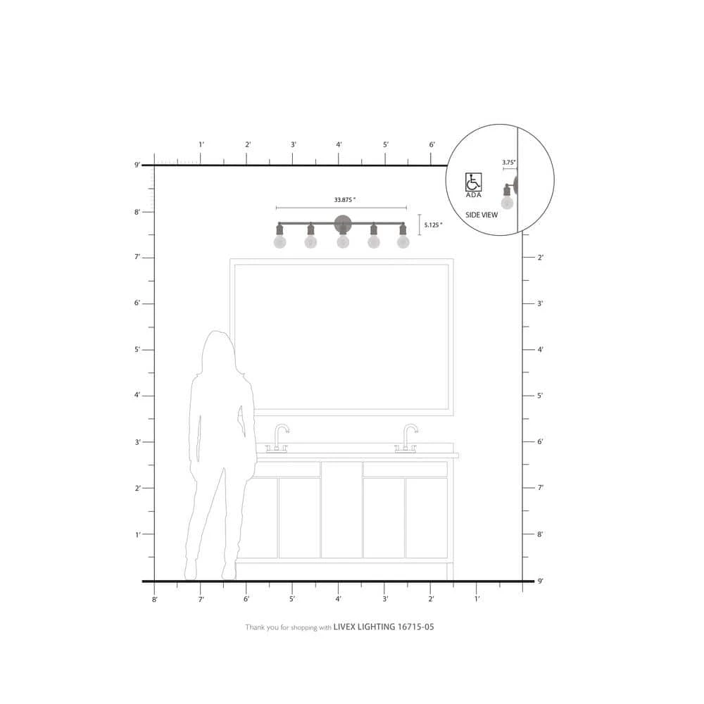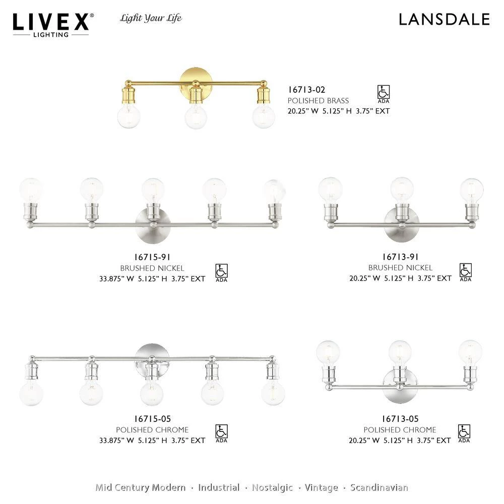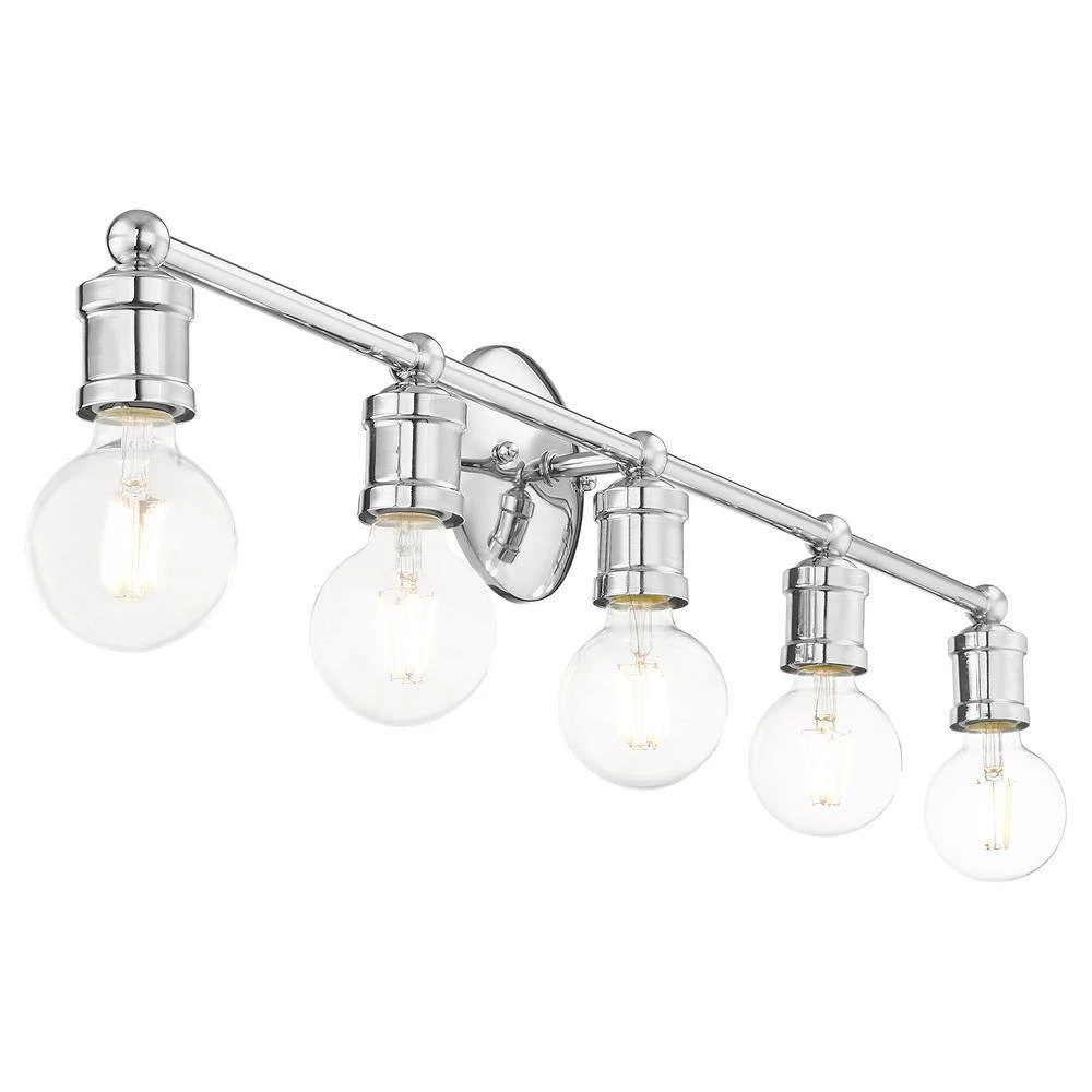 Livex Lighting is well known for quality, style and value. Clean lines and exposed bulb sockets make the Lansdale collection perfect for your mid-mod or transitional bath. The eclectic look is perfect for spaces wanting an urban, minimalistic or industrial touch. With superb craftsmanship and affordable price, this polished chrome 5-light vanity sconce is sure to tastefully indulge your extravagant side. This well-rounded fixture is sure to satisfy your lighting needs.