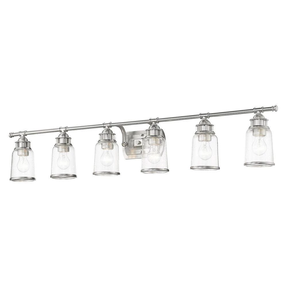 Livex Lighting is well known for quality, style and value. Our Lawrenceville collection features a retro industrial design, reminiscent of 19th century lighting. This 6 light bath vanity comes in a brushed nickel finish and clear seeded glass. This well-rounded fixture is sure to satisfy your lighting needs.