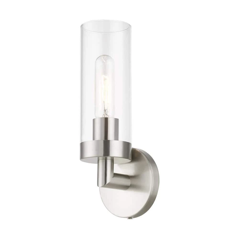 Add a dash of character and radiance to your home with this wall sconce. This single-light fixture from the Ludlow Collection features a brushed nickel finish with a clear glass. The clean lines of the back plate complement the cylindrical glass shade creating a minimal, sleek, urban look that works well in most decors. This fixture adds upscale charm and contemporary aesthetics to your home.