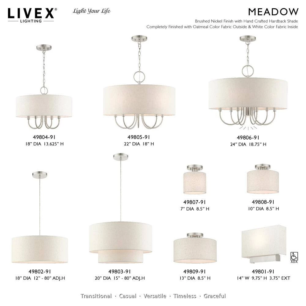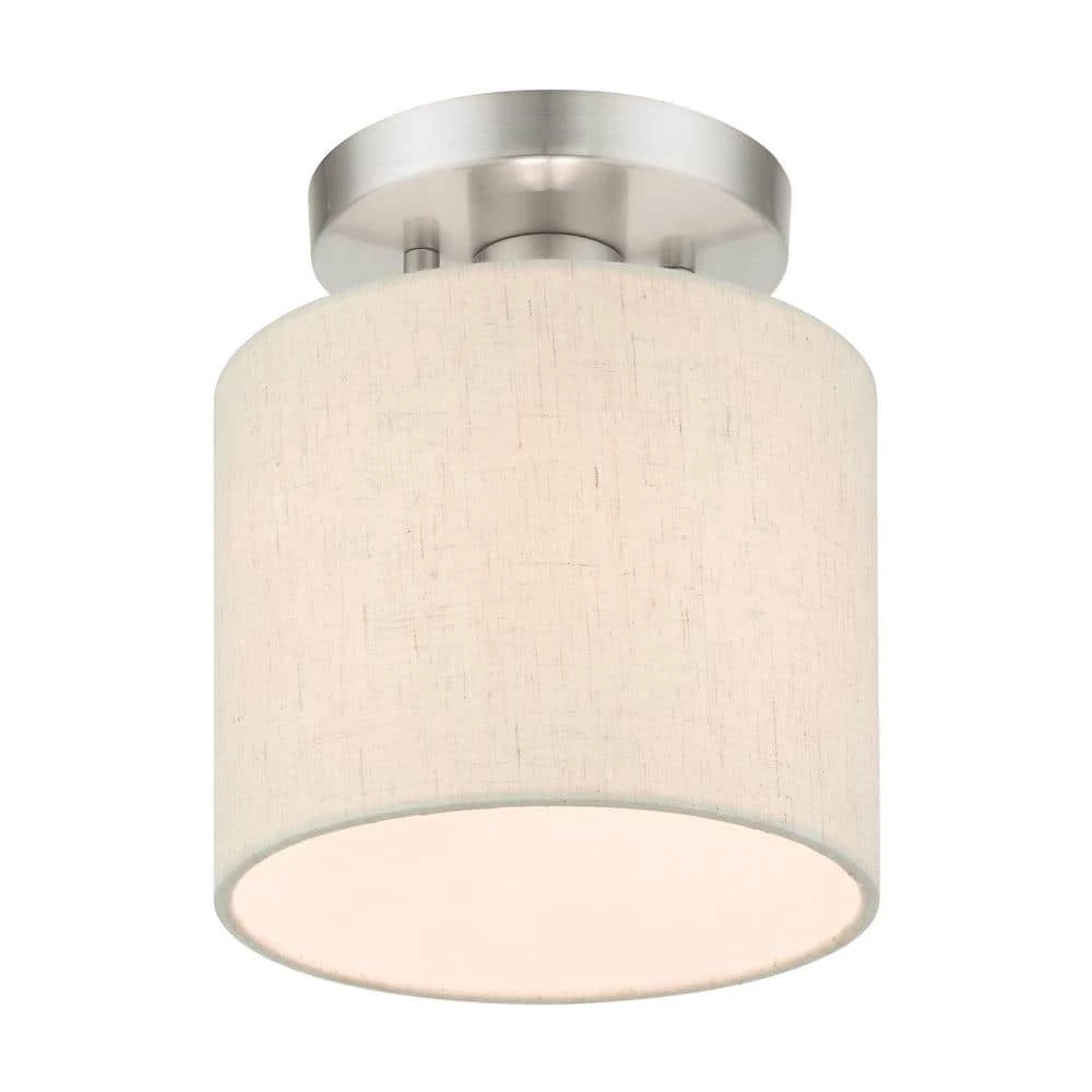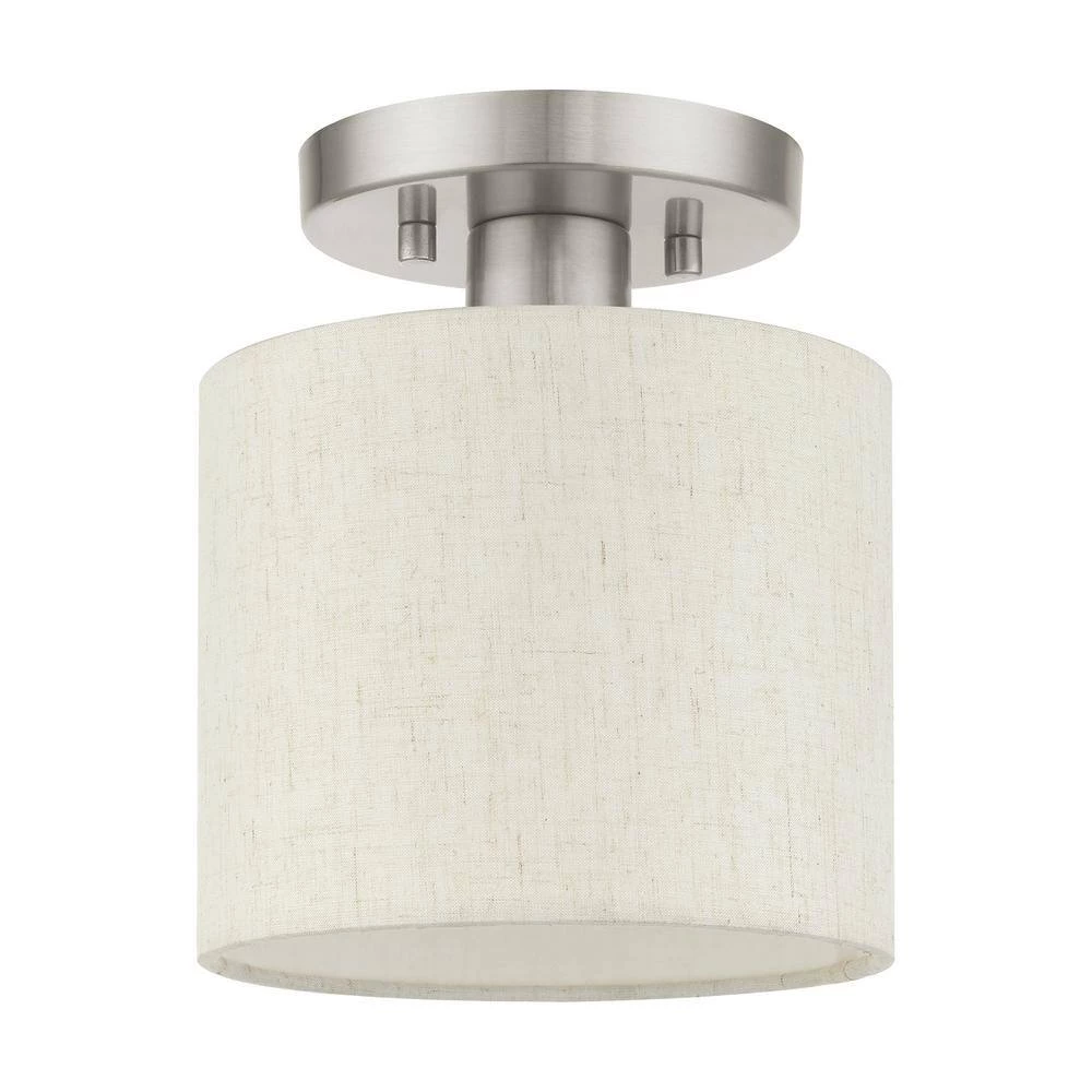 Livex Lighting is well known for quality, style and value. The Meadow collection is both modern and versatile. The hand-crafted fabric oatmeal colored hardback shade is set off by the silky white fabric on the inside setting a pleasant mood. The petite size single-light drum shade adds character to this handsomely styled semi flush. Perfect fit for the hallway, bathroom, kitchen and a small bedroom. This sleek design is shown in a brushed nickel finish. This well-rounded fixture is sure to satisfy your lighting needs.