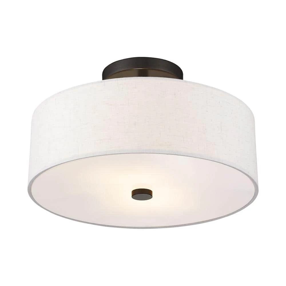Livex Lighting is well known for quality, style and value. Add style to any room with this elegant semi flush mount. The design features a beautiful hand crafted oatmeal fabric hardback drum shade in a stylish English bronze. This well-rounded fixture is sure to satisfy your lighting needs.