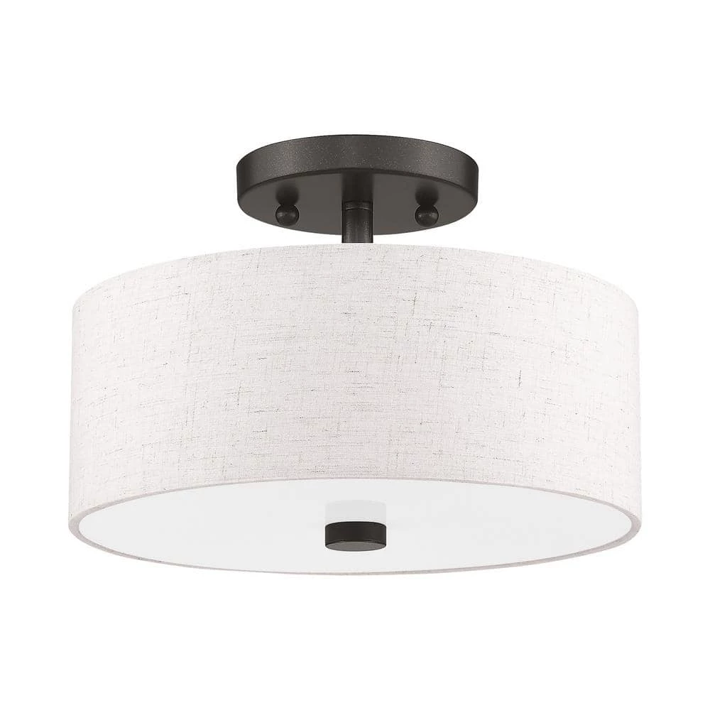Livex Lighting is well known for quality, style and value. Add style to any room with this elegant semi flush mount. The design features a beautiful hand crafted oatmeal fabric hardback drum shade in a stylish English bronze. This well-rounded fixture is sure to satisfy your lighting needs.