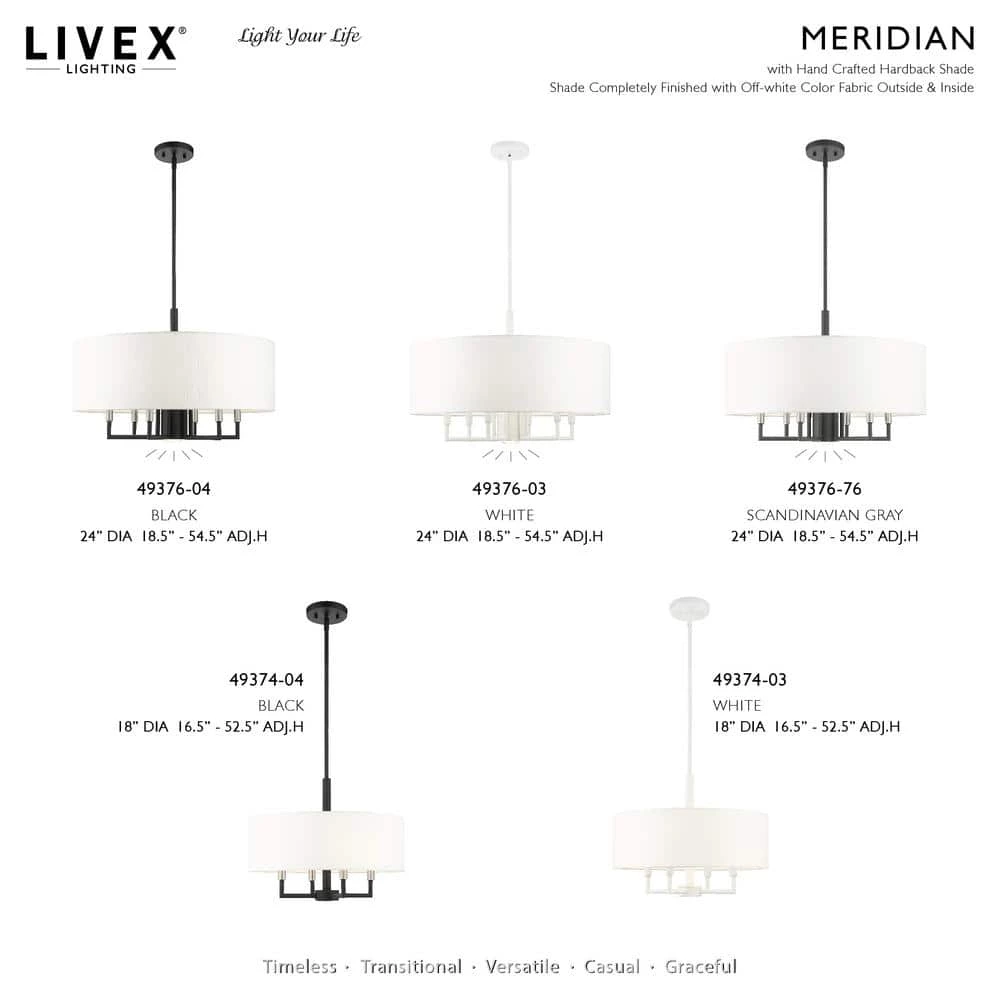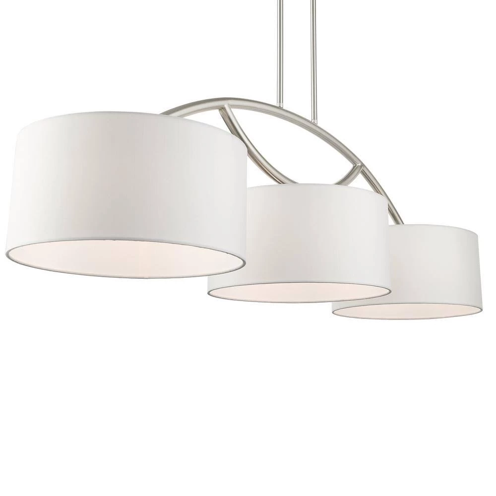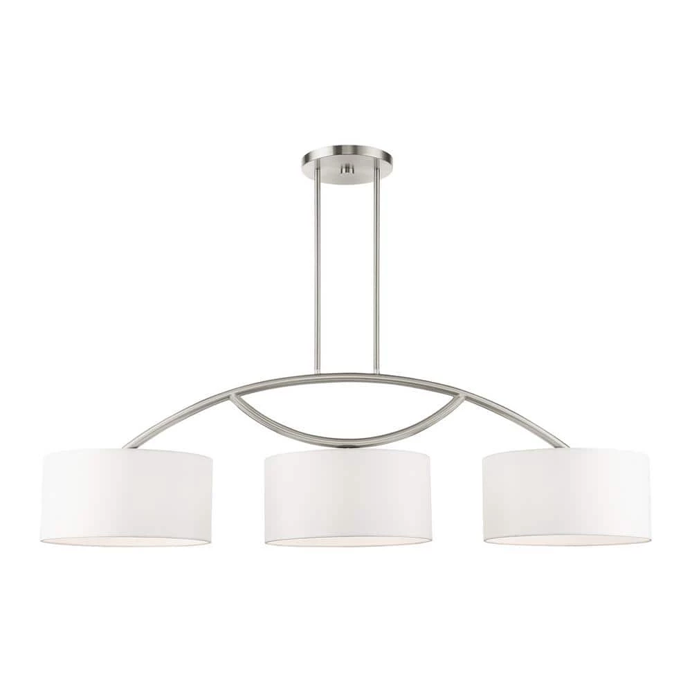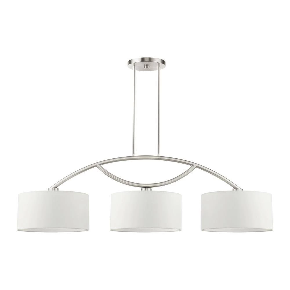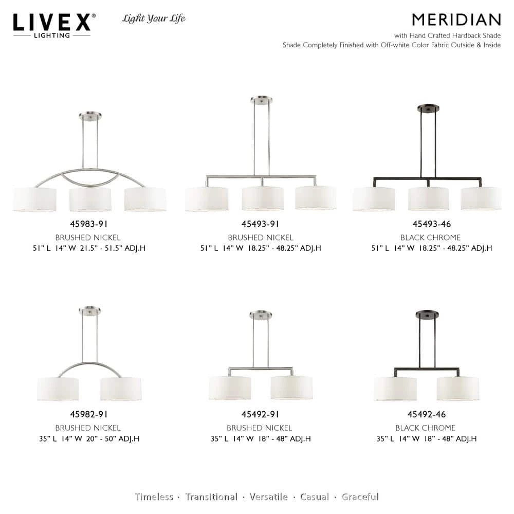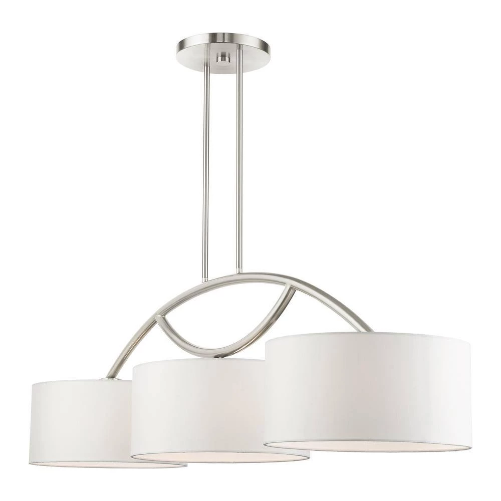 Livex Lighting is well known for quality, style and value. The Meridian collection has a clean, crisp look and contemporary appeal. The hand-crafted off-white fabric hardback shades offer a diffused warm light. This 3-light linear chandelier has a beautiful arched upper frame over the shades. Will adapt well in the living room, dining room and over the kitchen island tastefully elevating your style. This sleek design is shown in a brushed nickel finish. This well-rounded fixture is sure to satisfy your lighting needs.