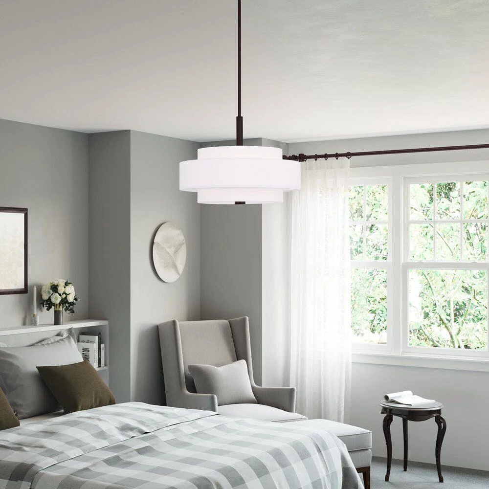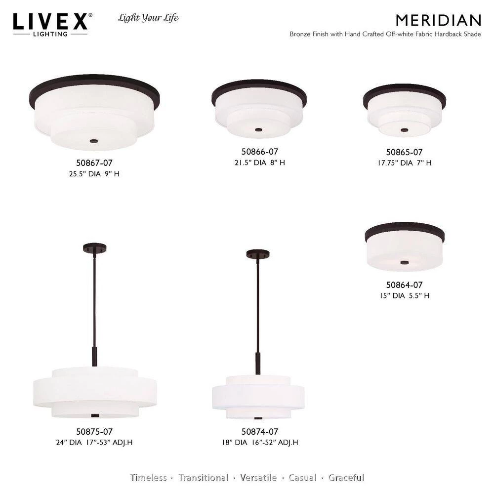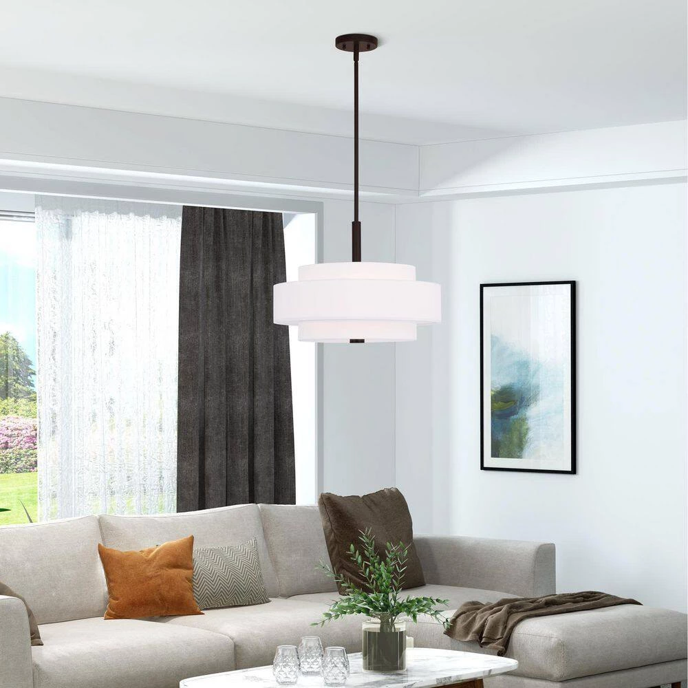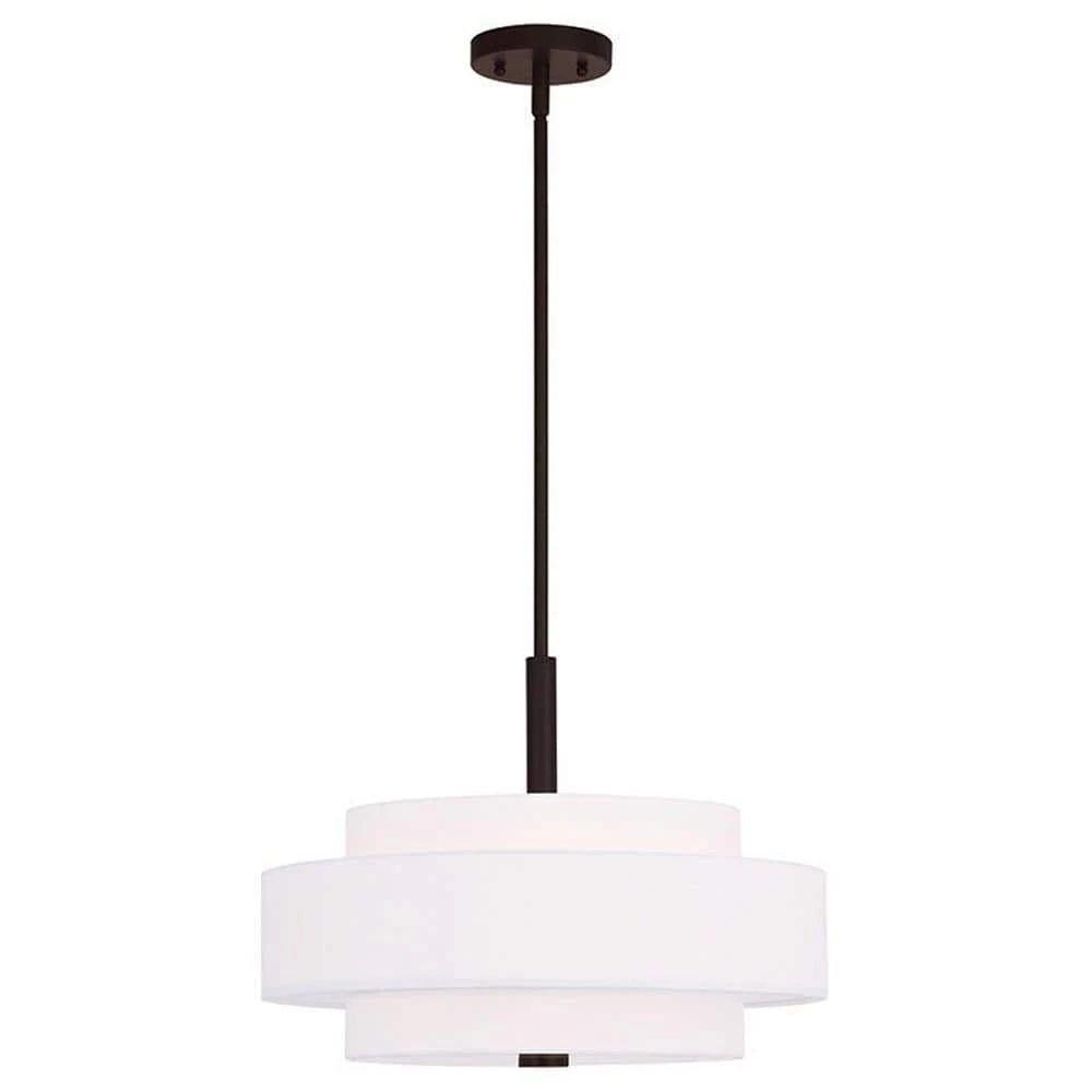 Livex Lighting is well known for quality, style and value. A triple drum shade adds character to this handsomely styled pendant light. Update your decor with the clean styling of this contemporary 4 light pendant from the Meridian collection. Features a lovely hand crafted off white fabric hardback shade and frosted diffuser for subtle illumination. This well-rounded fixture is sure to satisfy your lighting needs.