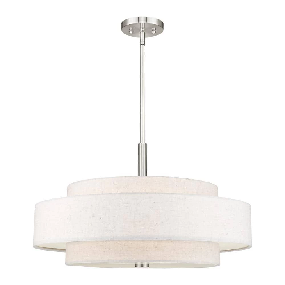 Livex Lighting is well known for quality, style and value. A triple drum shade adds character to this handsomely styled pendant light. Update your decor with the clean styling of this contemporary 5 light pendant from the Meridian collection. Features a lovely hand crafted oatmeal color fabric hardback shade and frosted diffuser for subtle illumination. This well-rounded fixture is sure to satisfy your lighting needs.