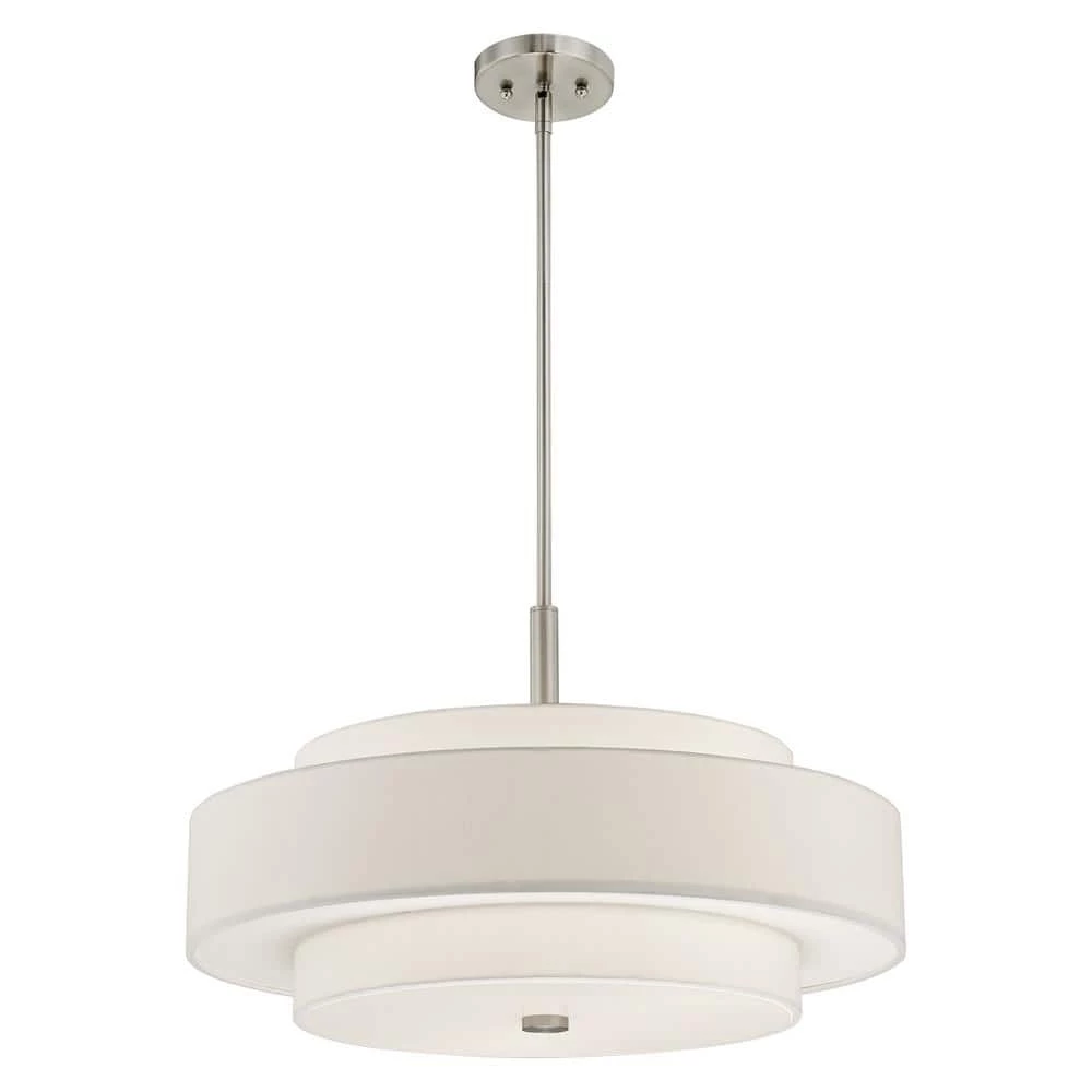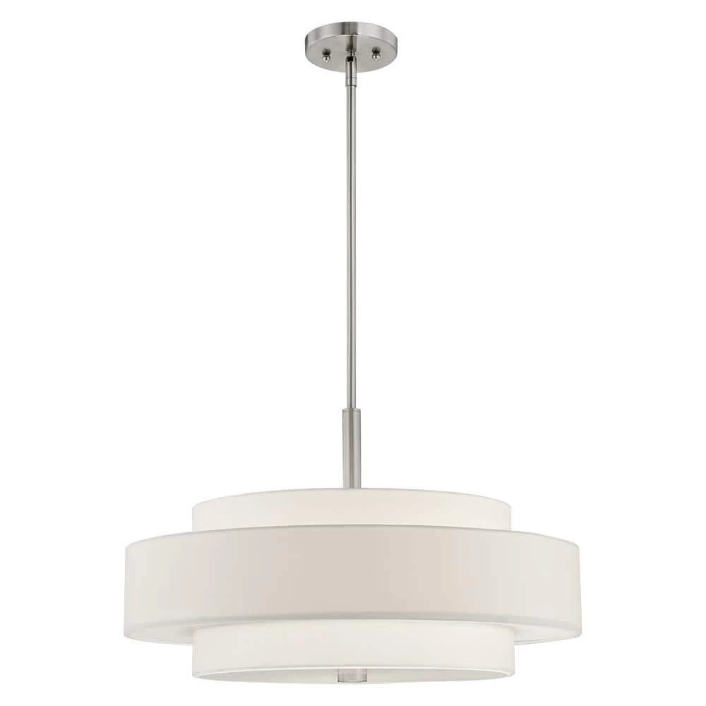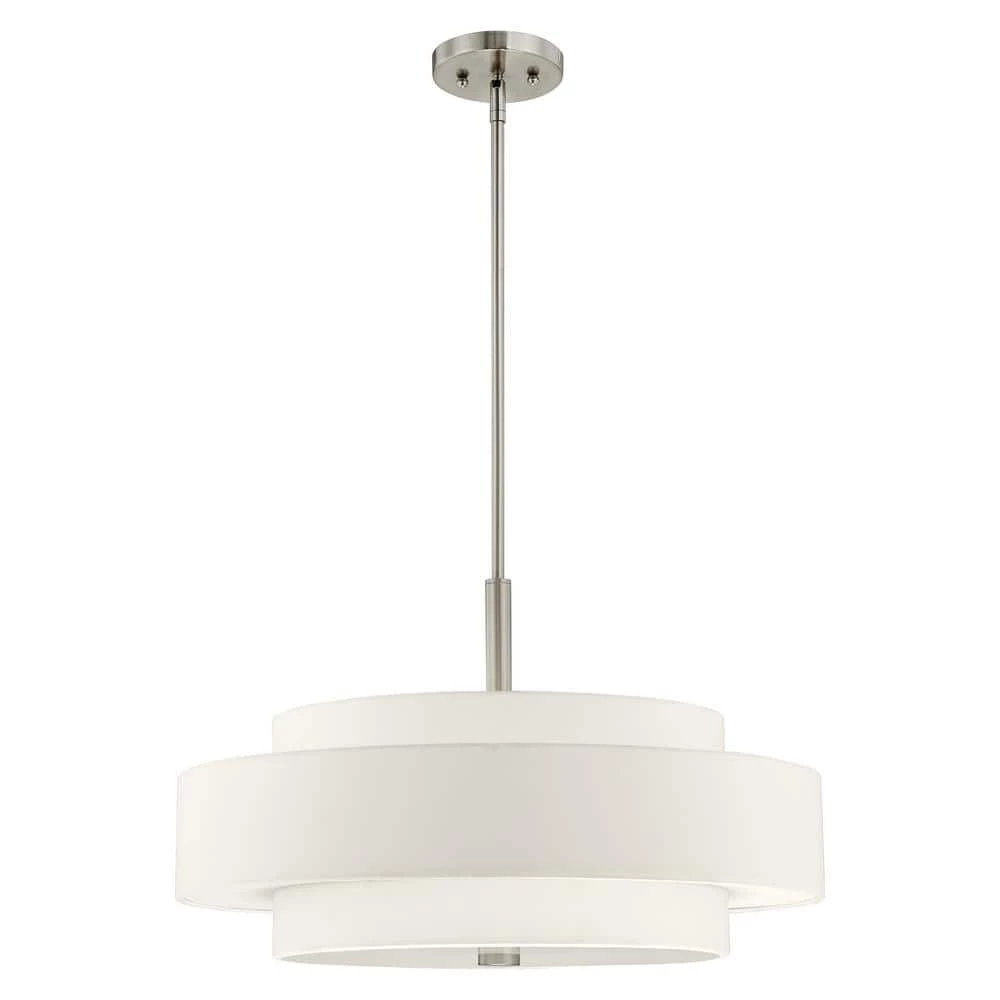 Livex Lighting is well known for quality, style and value. A triple drum shade adds character to this handsomely styled pendant light. Update your decor with the clean styling of this contemporary 5 light pendant from the Meridian collection. Features a lovely hand crafted off white fabric hardback shade and frosted diffuser for subtle illumination. This well-rounded fixture is sure to satisfy your lighting needs.