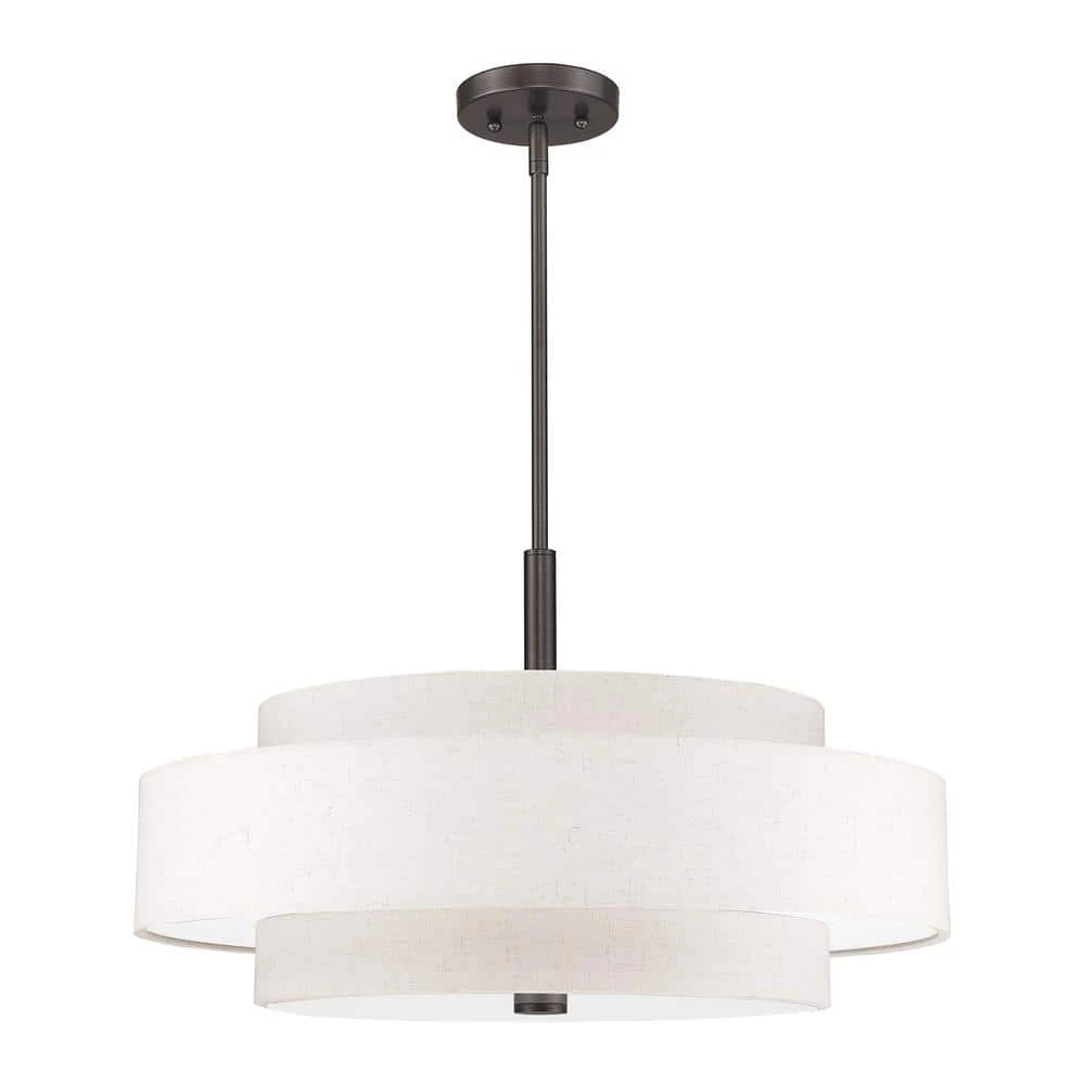 A triple drum shade adds character to this handsomely styled pendant light. Update your decor with the clean styling of this contemporary five light pendant from the Meridian collection. Features a lovely hand crafted oatmeal color fabric hardback shade and frosted diffuser for subtle illumination.