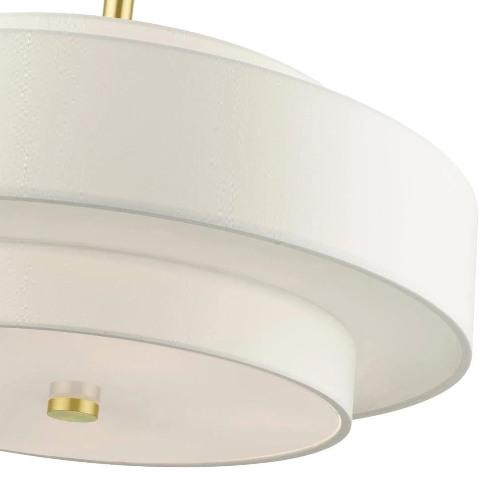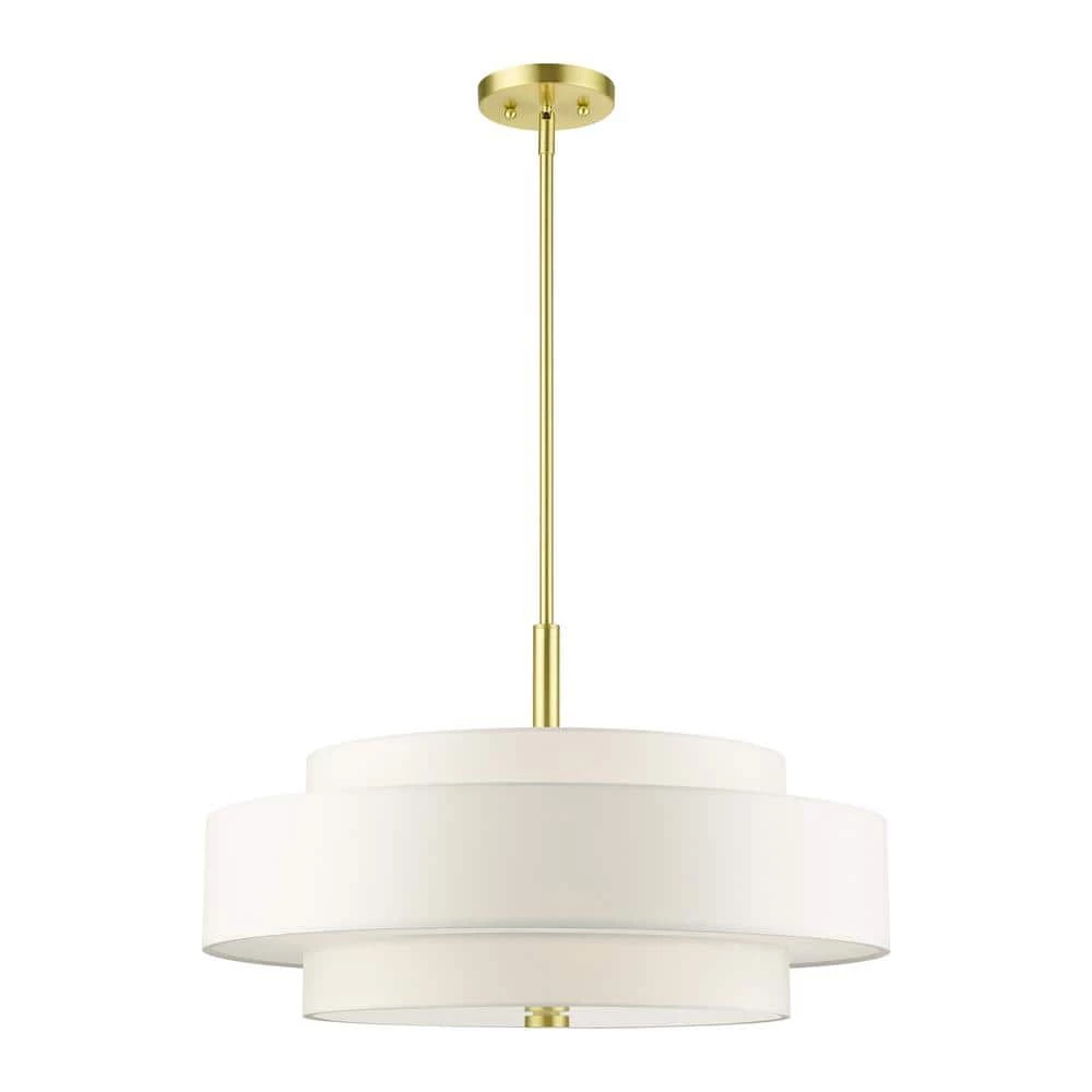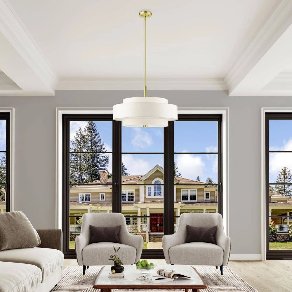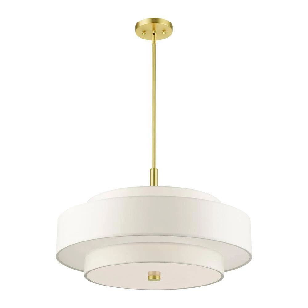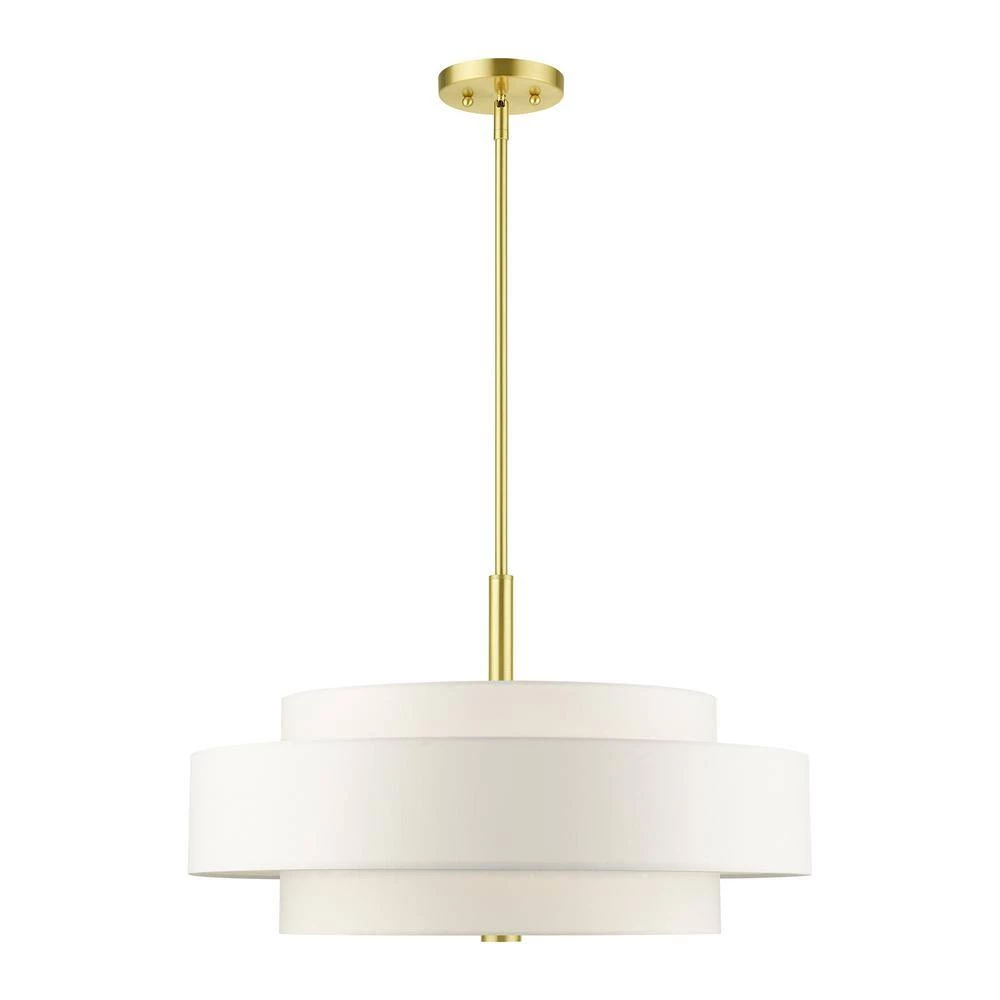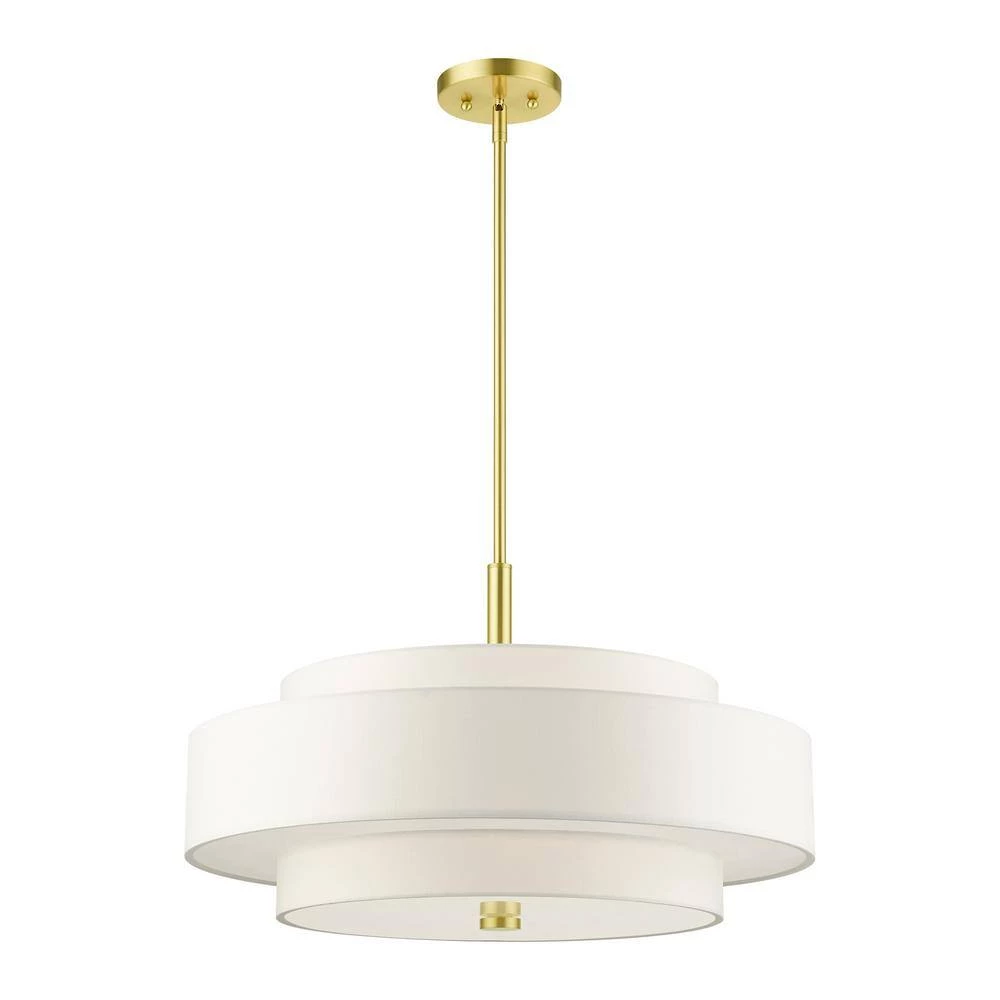 The Meridian collection has a clean, crisp look and contemporary appeal. The hand-crafted off-white fabric hardback shades offer a diffused warm light. This 5-light multi-tier drum shade adds character to this handsomely styled pendant chandelier. Will adapt well in the living room, dining room or in the bedroom tastefully elevating your style. This sleek design is shown in a satin brass finish.