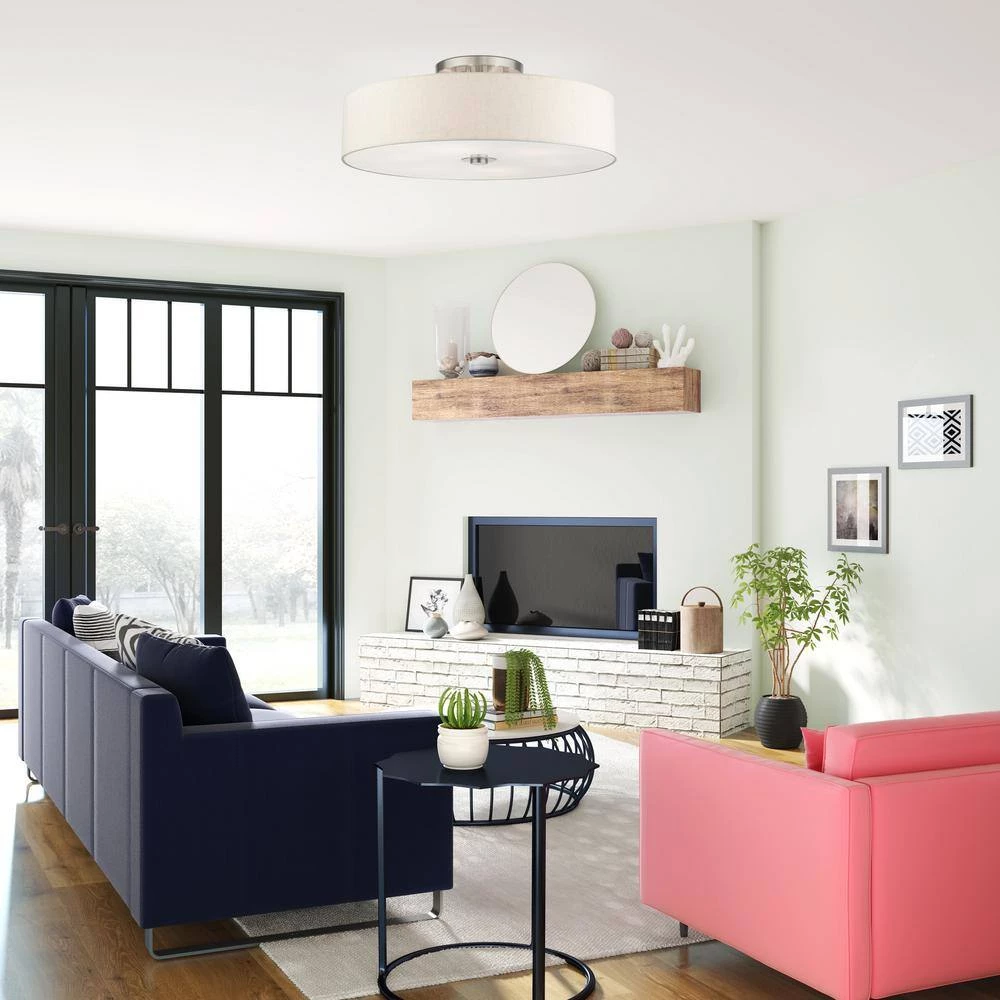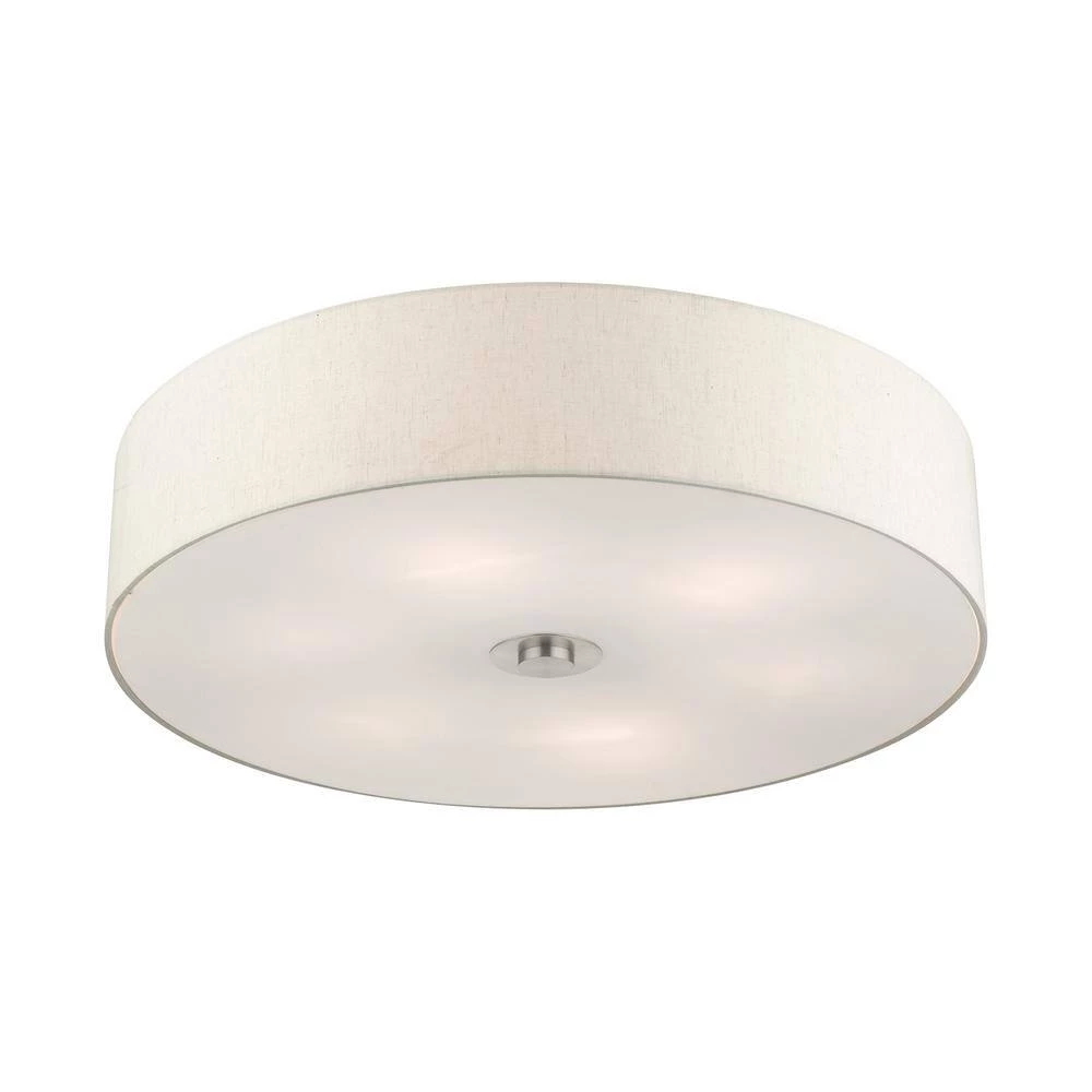 Livex Lighting is well known for quality, style and value. The Meridian collection has a clean, crisp look and contemporary appeal. The hand-crafted oatmeal colored fabric hardback shade offers a diffused warm light. This extra-large six-light double drum shade adds character to this handsomely styled semi flush mount. Will adapt well in the living room, dining room, the entrance or in the bedroom tastefully elevating your style. This sleek design is shown in a brushed nickel finish. This well-rounded fixture is sure to satisfy your lighting needs.