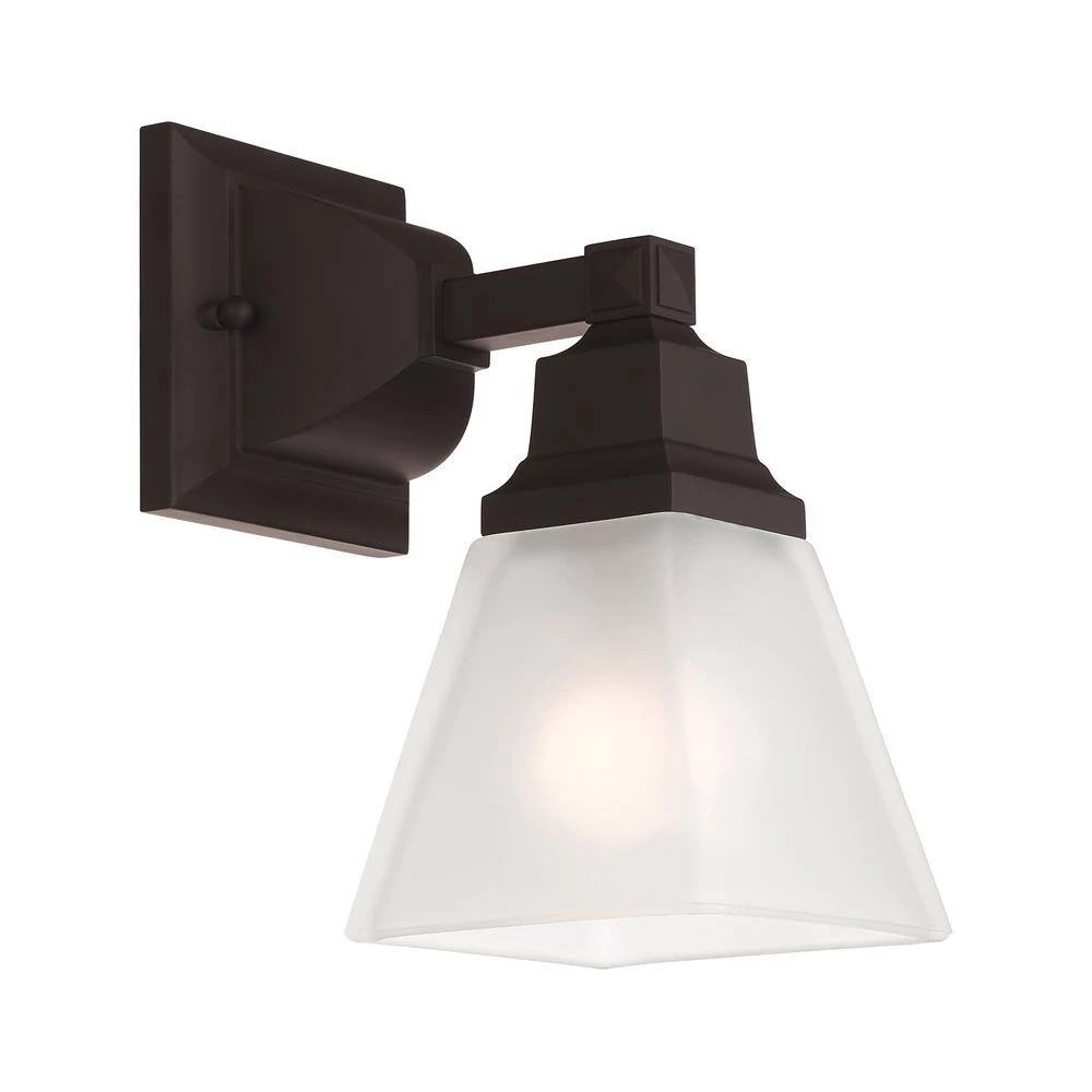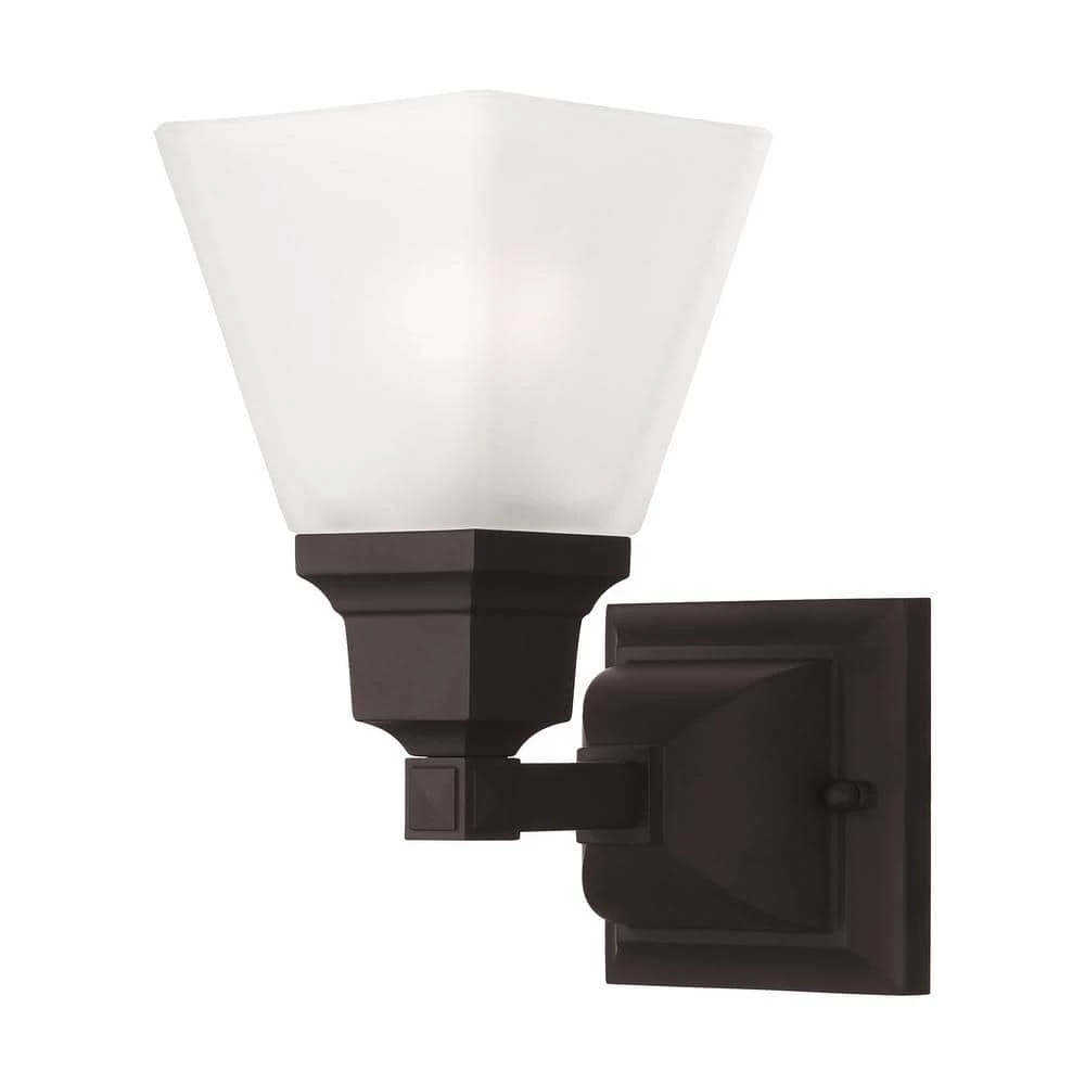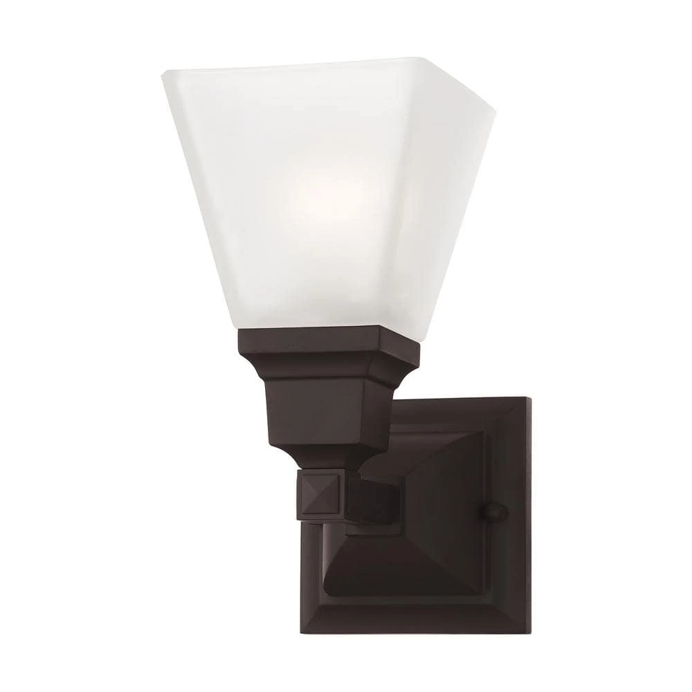 Livex Lighting is well known for quality, style and value. The Mission collection has clean lines with geometric forms. This one light bath fixture with etched opal glass is finished in bronze. Square bar style arms elevate the glass. This well-rounded fixture is sure to satisfy your lighting needs.