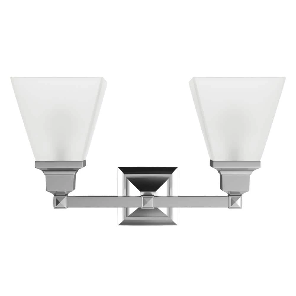 Livex Lighting is well known for quality, style and value. The Mission collection has clean lines with geometric forms. This 2 light bath fixture with etched opal glass is finished in polished chrome. Square bar style arms elevate the glass. This well-rounded fixture is sure to satisfy your lighting needs.