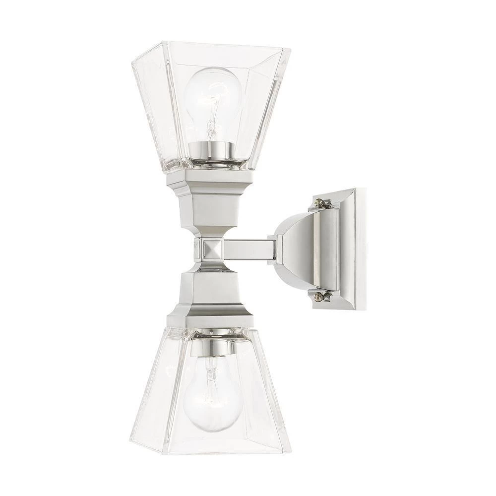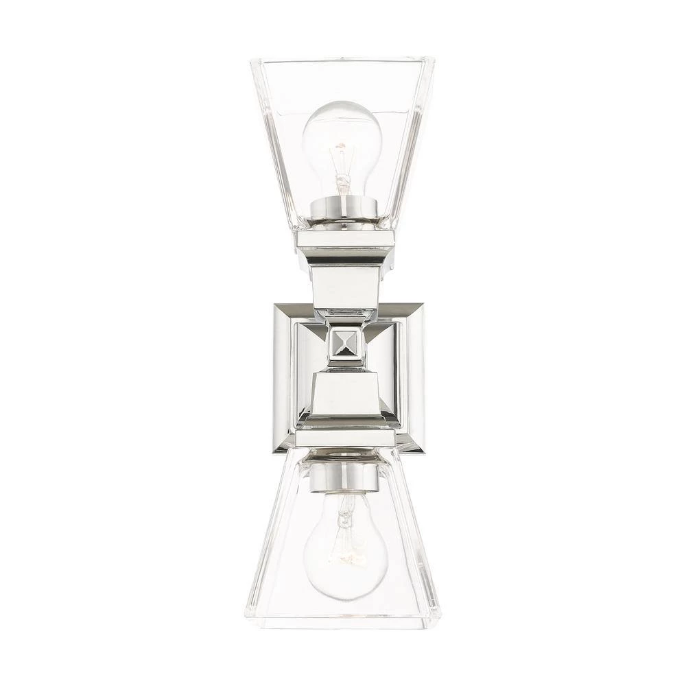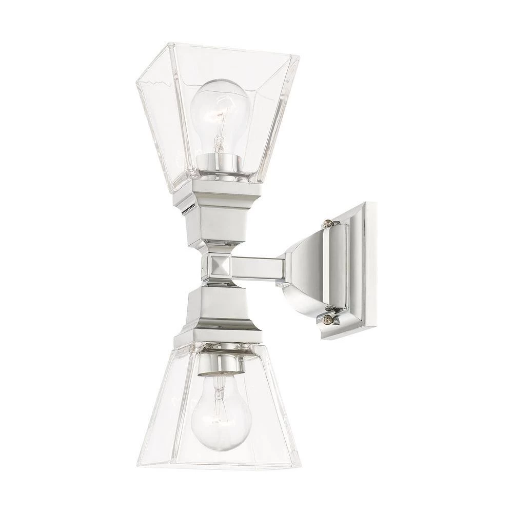 Livex Lighting is well known for quality, style and value. The Mission collection has clean lines with geometric forms. This 2 light wall sconce features clear glass on polished chrome, square style arms that elevates the classic look. This well-rounded fixture is sure to satisfy your lighting needs.