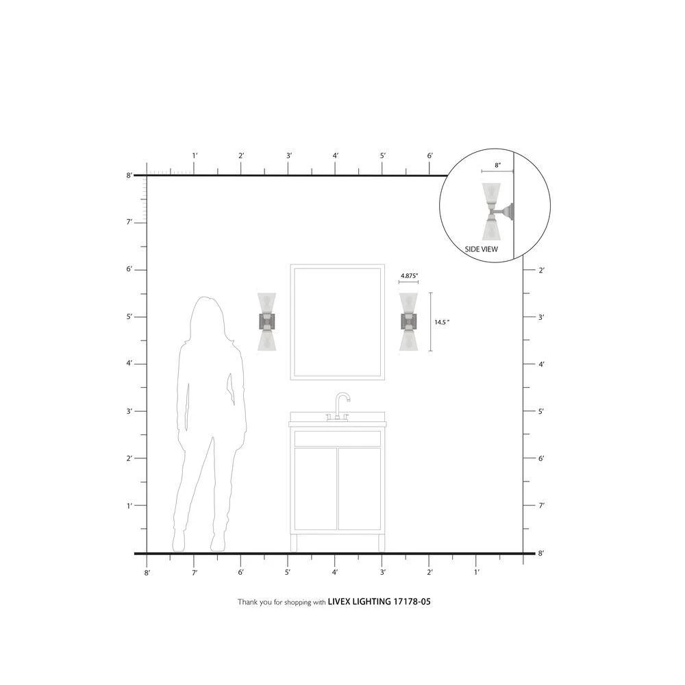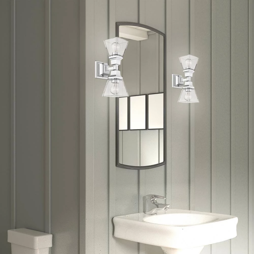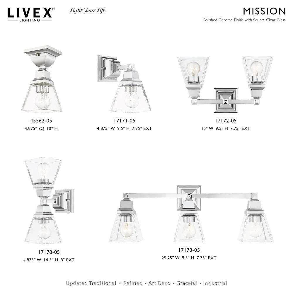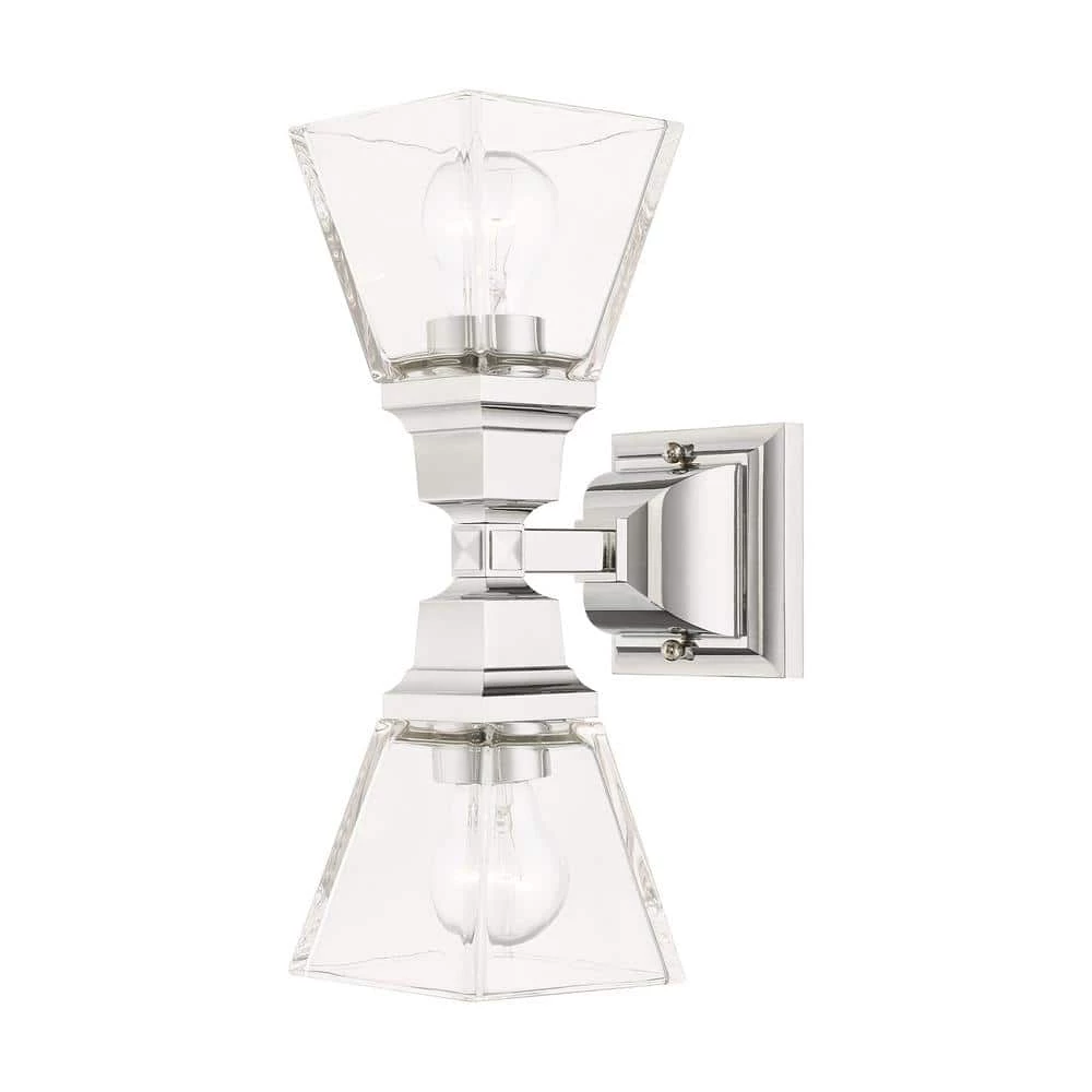 Livex Lighting is well known for quality, style and value. The Mission collection has clean lines with geometric forms. This 2 light wall sconce features clear glass on polished chrome, square style arms that elevates the classic look. This well-rounded fixture is sure to satisfy your lighting needs.