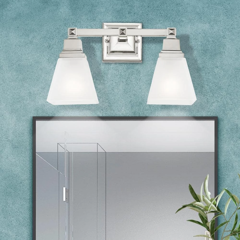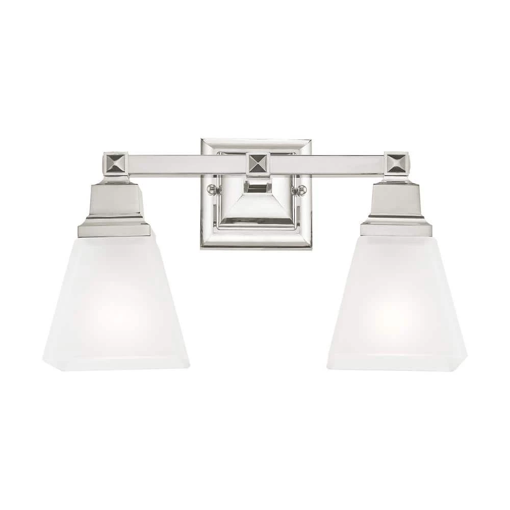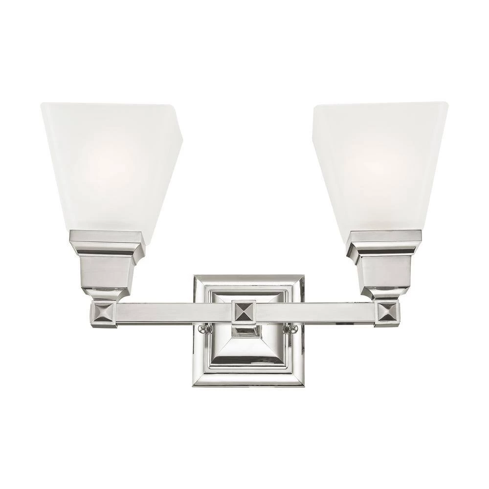 Livex Lighting is well known for quality, style and value. The Mission collection has clean lines with geometric forms. This 2 light bath fixture with etched opal glass is finished in polished nickel. Square bar style arms elevate the glass. This well-rounded fixture is sure to satisfy your lighting needs.