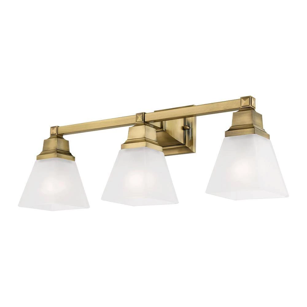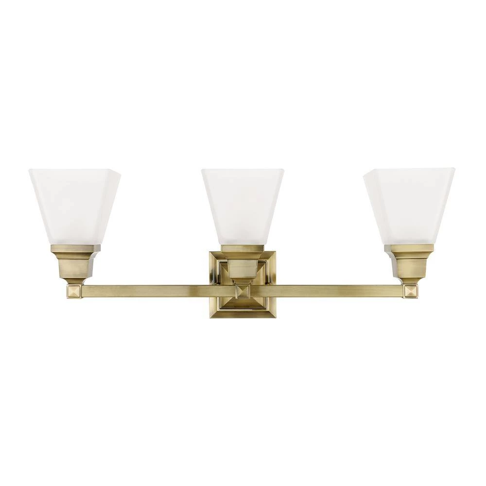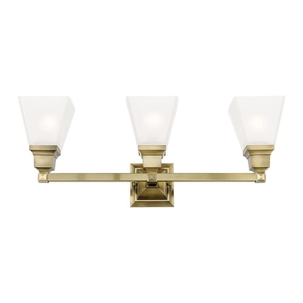 Livex Lighting is well known for quality, style and value. The Mission collection has clean lines with geometric forms. This 3 light bath fixture with etched opal glass is finished in antique brass. Square bar style arms elevate the glass. This well-rounded fixture is sure to satisfy your lighting needs.