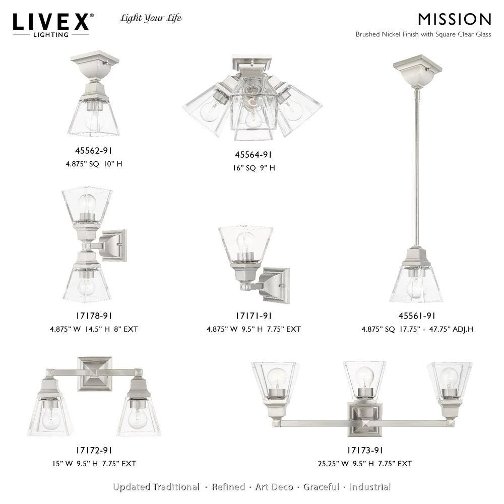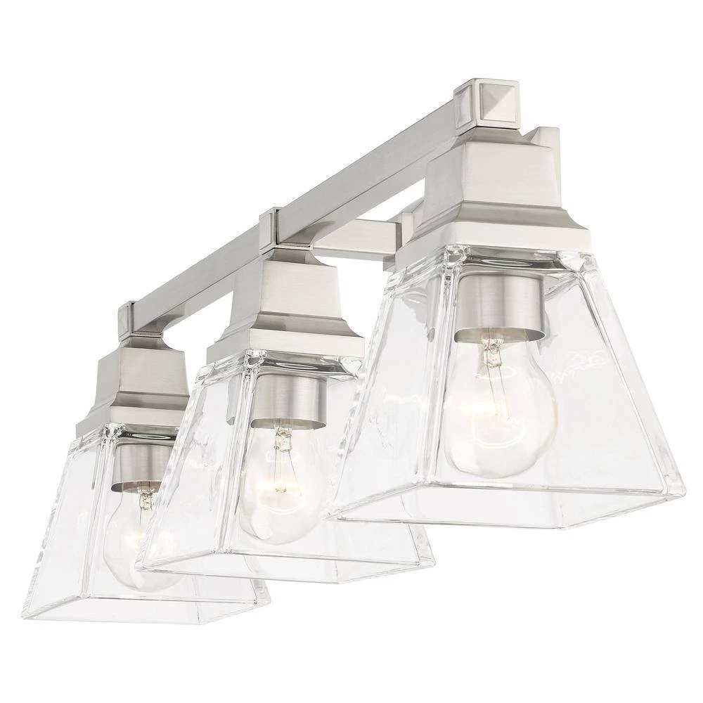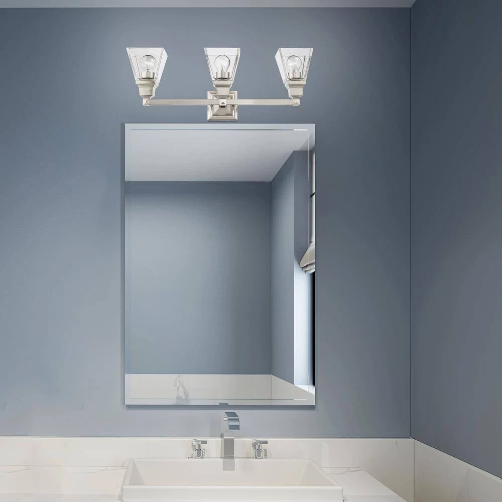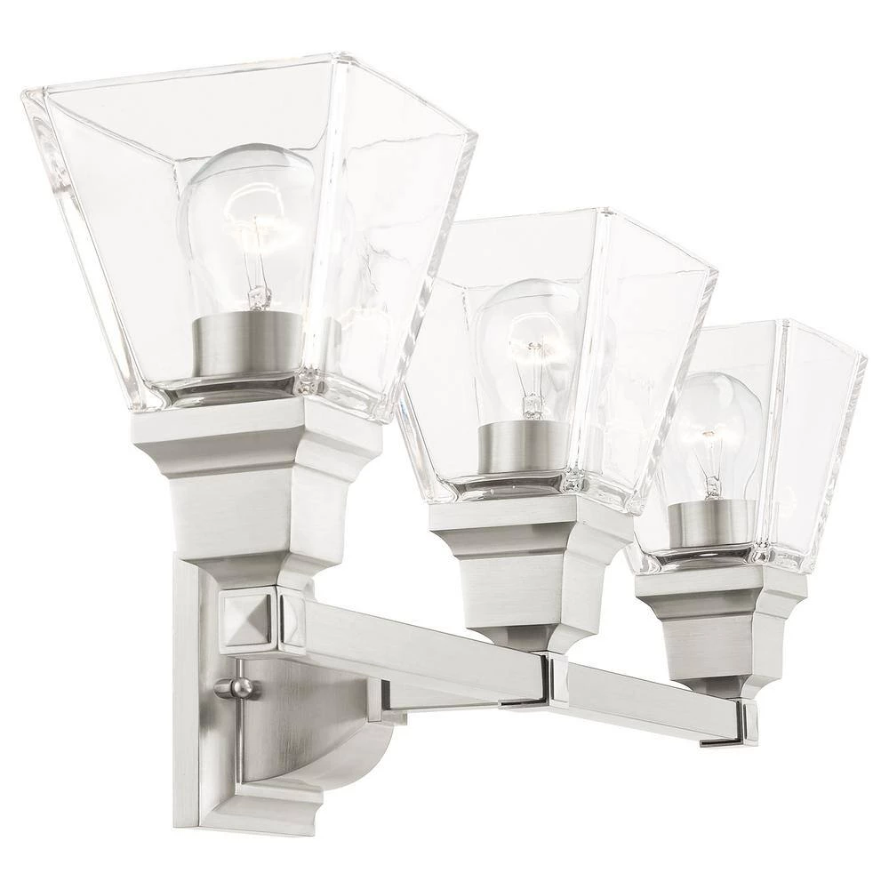 Livex Lighting is well known for quality, style and value. The Mission collection has clean lines with geometric forms. This 3 light bath vanity light features clear glass on brushed nickel, square style arms that elevates the classic look. This well-rounded fixture is sure to satisfy your lighting needs.