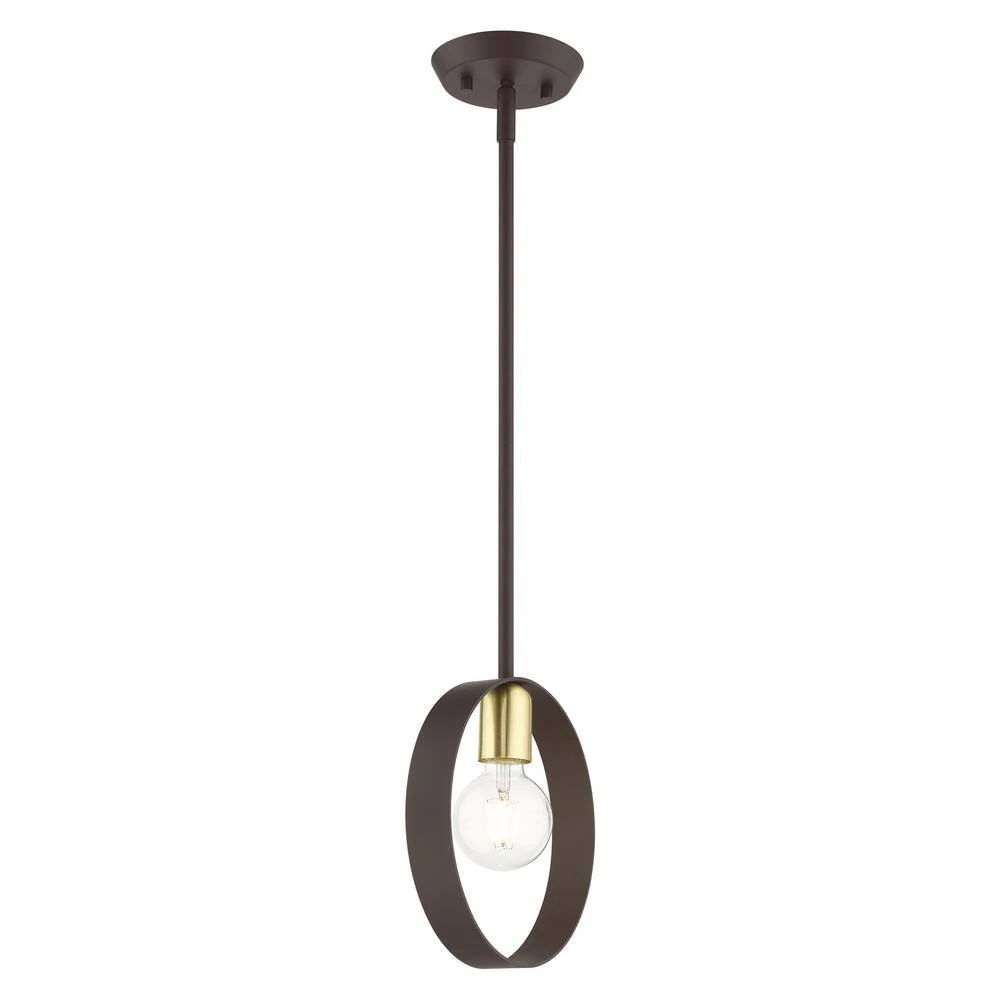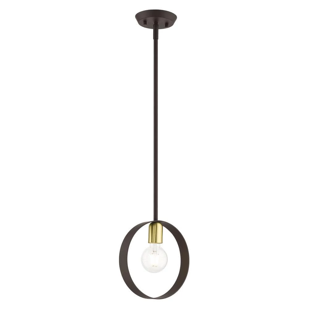 Livex Lighting is well known for quality, style and value. The Modesto collection hints at a casual mid-century modern vibe. It features steel straps that form beautiful circular shapes. The exposed bulbs and 2-toned combination of finishes create a fashionable statement for today’s interiors. This single-light mini pendant is shown in a bronze finish with satin brass accents. It will look fantastic in your mid-century modern loft, dining room, over the kitchen countertop, bedroom, bathroom or any contemporary style interior. This well-rounded fixture is sure to satisfy your lighting needs.