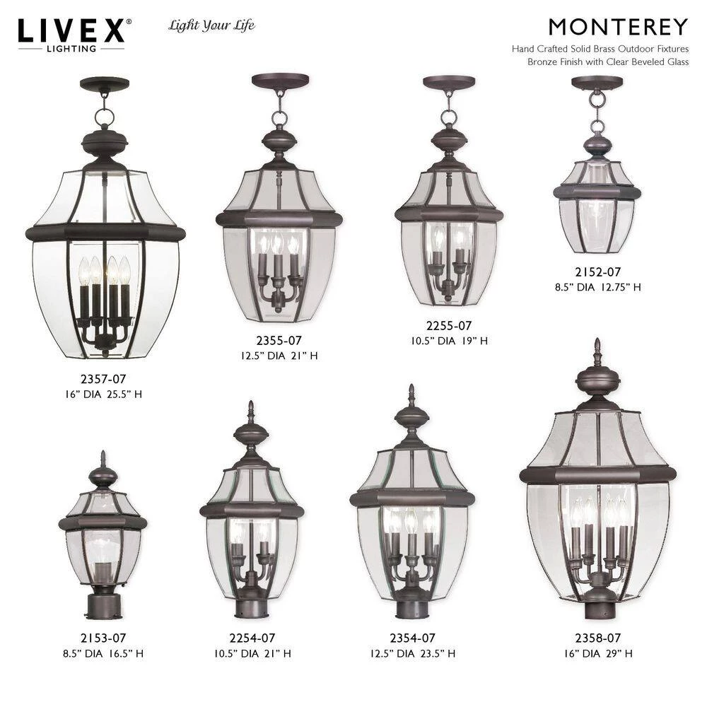 Livex Lighting is well known for quality, style and value. The Monterey outdoor lighting features clean, crisp lines complemented by the graceful curves of beveled glass. Crafted from sturdy solid brass this handsome colonial styling makes this fixture a perfect addition to your outdoor spaces. This well-rounded fixture is sure to satisfy your lighting needs.