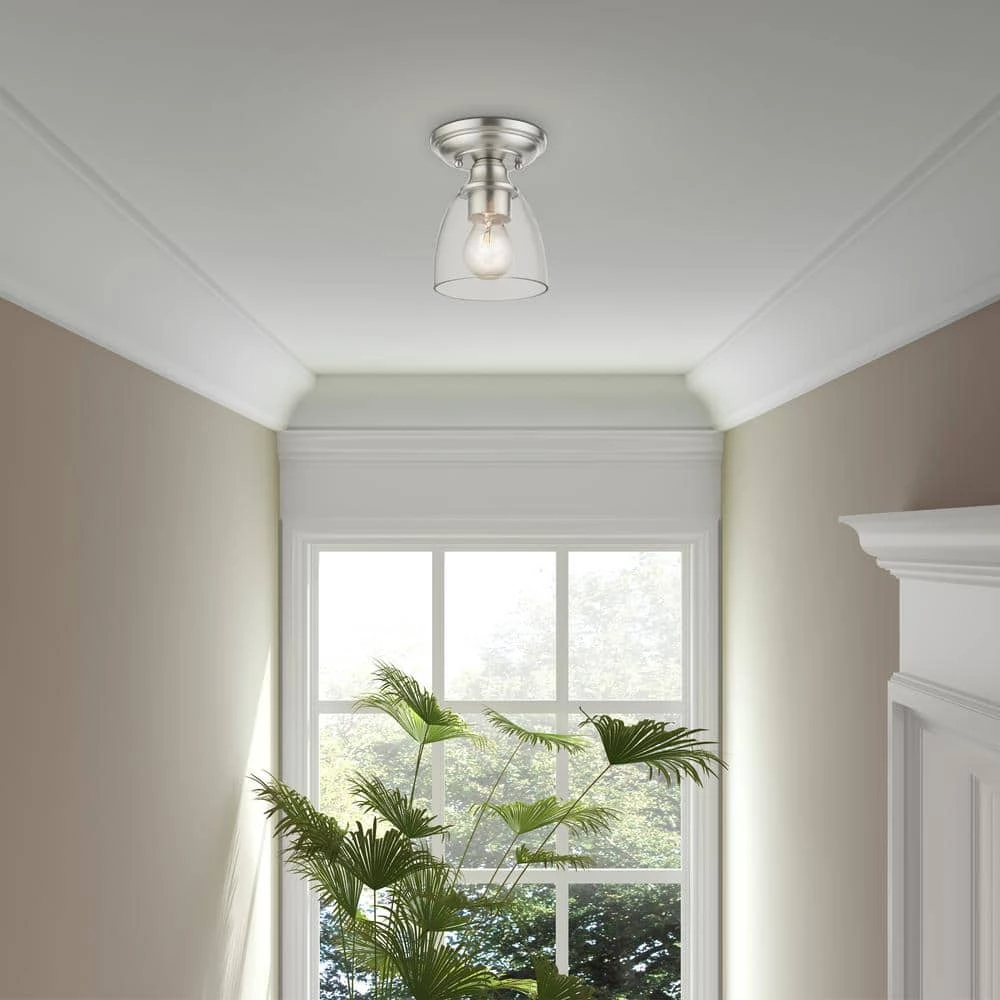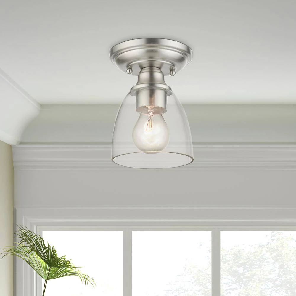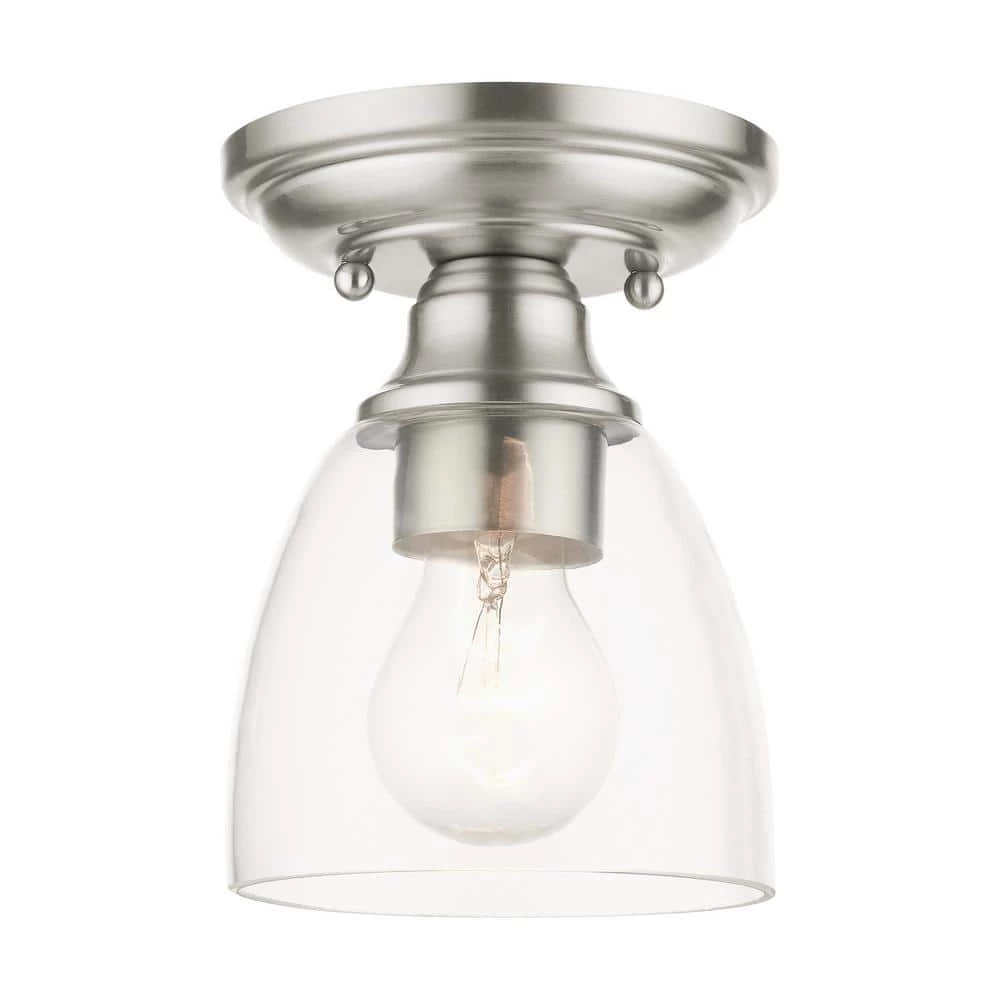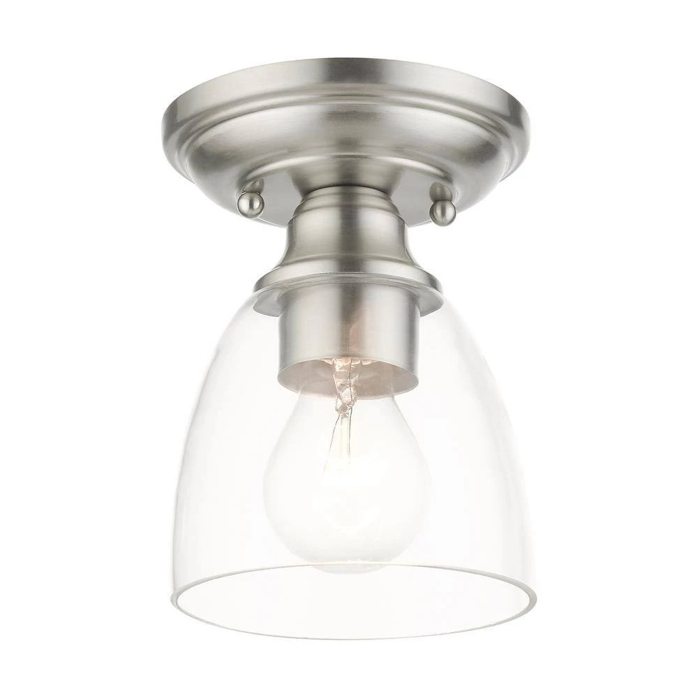 Livex Lighting is well known for quality, style and value. Whether it’s style or practical lighting, this flush mount is the perfect addition to your bathroom or hallway. This single-light fixture from the Montgomery Collection features a clear hand-blown glass shade and is shown in a brushed nickel finish. The clean graceful lines of the canopy complement the shade, creating an understated look that works well in most decors. Classic elegance combines with contemporary appeal to enhance any home in style. This well-rounded fixture is sure to satisfy your lighting needs.