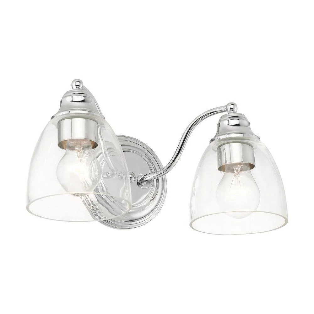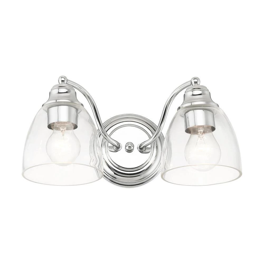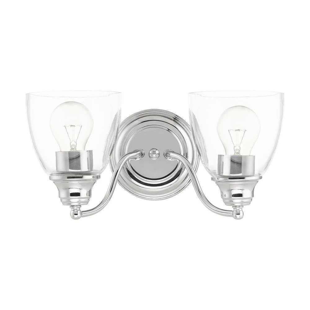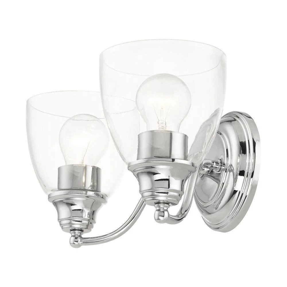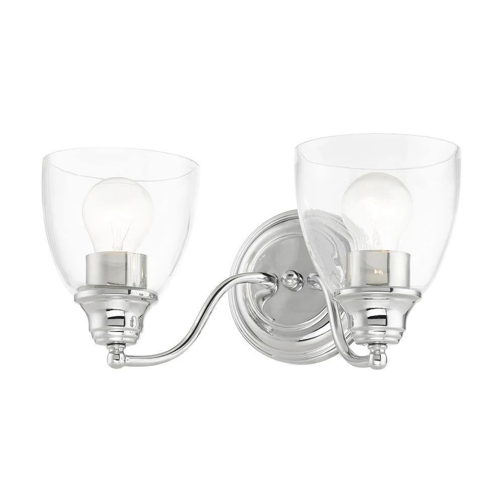 Livex Lighting is well known for quality, style and value. Whether it’s style or practical lighting, this vanity sconce is the perfect addition to your bathroom. This 2-light fixture from the Montgomery Collection features clear hand-blown glass shades and is shown in a polished chrome finish. The clean graceful lines of the back plate complement the shades, creating an understated look that works well in most decors. Classic elegance combines with contemporary appeal to enhance any home in style. This well-rounded fixture is sure to satisfy your lighting needs.